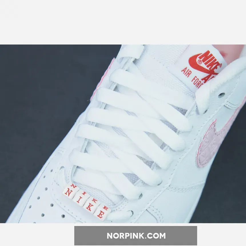 Another Nike Air Force 1 joins the brand’s Valentine collection with the Nike Air Force 1 Low Valentine White. The entire AF1 is dressed in white tumbled leather from heel to toe, making the signature profile Swooshes on both the medial and lateral sides of the shoe stand out in baby pink. Not only that, the words “NIKE” and “LOVE” are raised across the baby pink surface. The same words are repeated on the square charms across the vamp of the shoe, “LOVE” is spelled out in red letters on the left shoe while “NIKE” is spelled out on the right. Nike Air branding in red stands out on both the white tongue tab and the white heel tab.