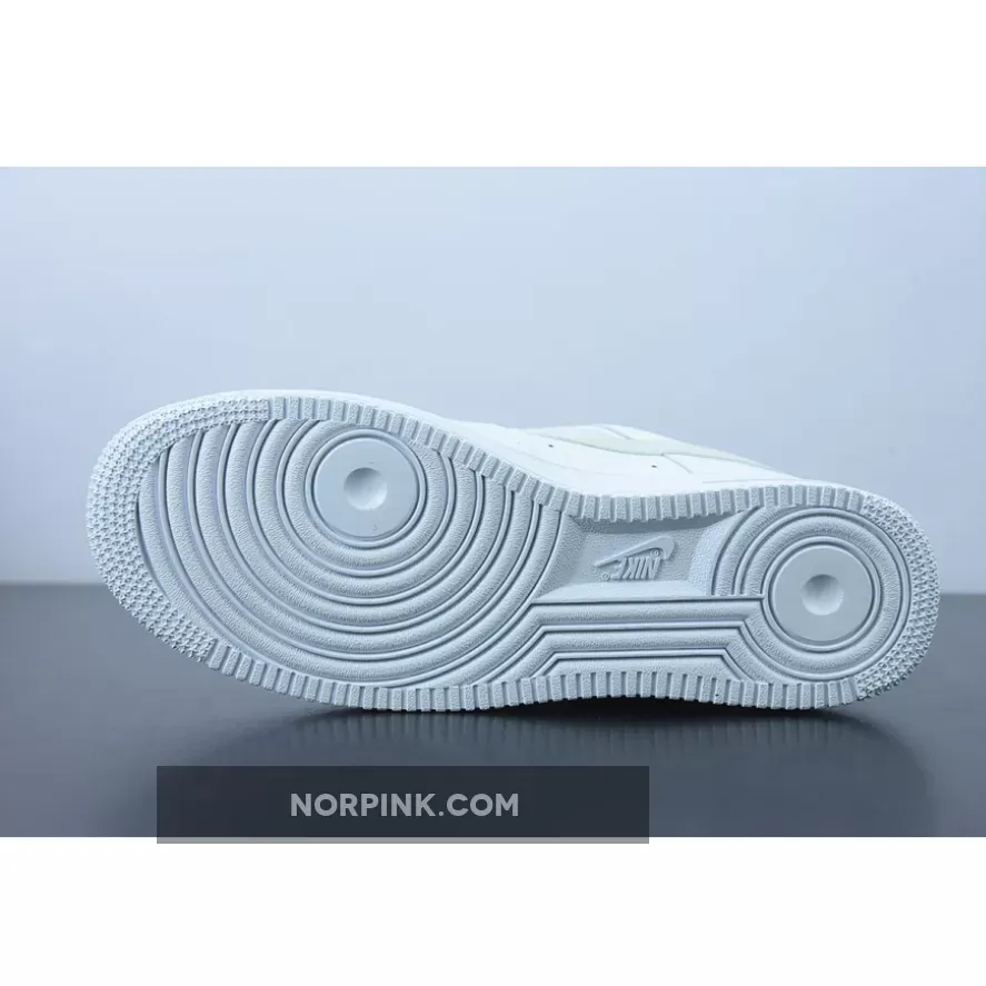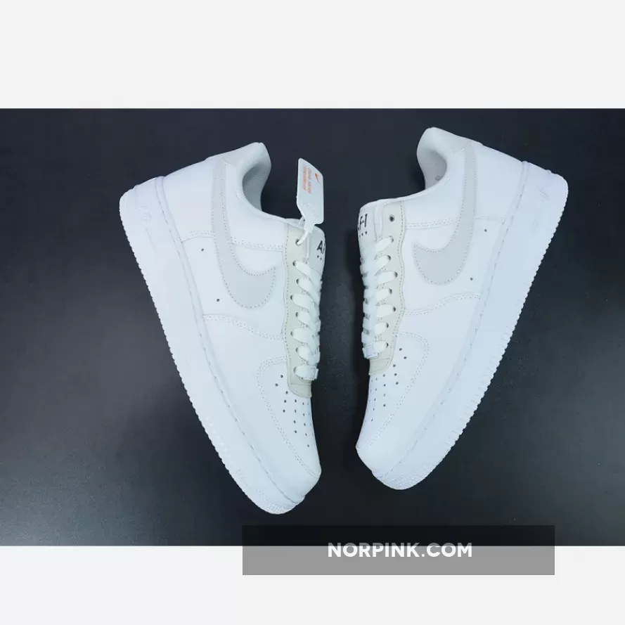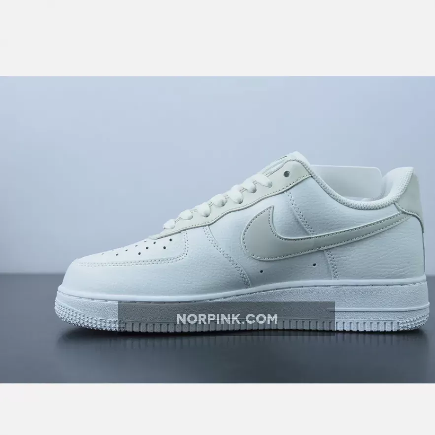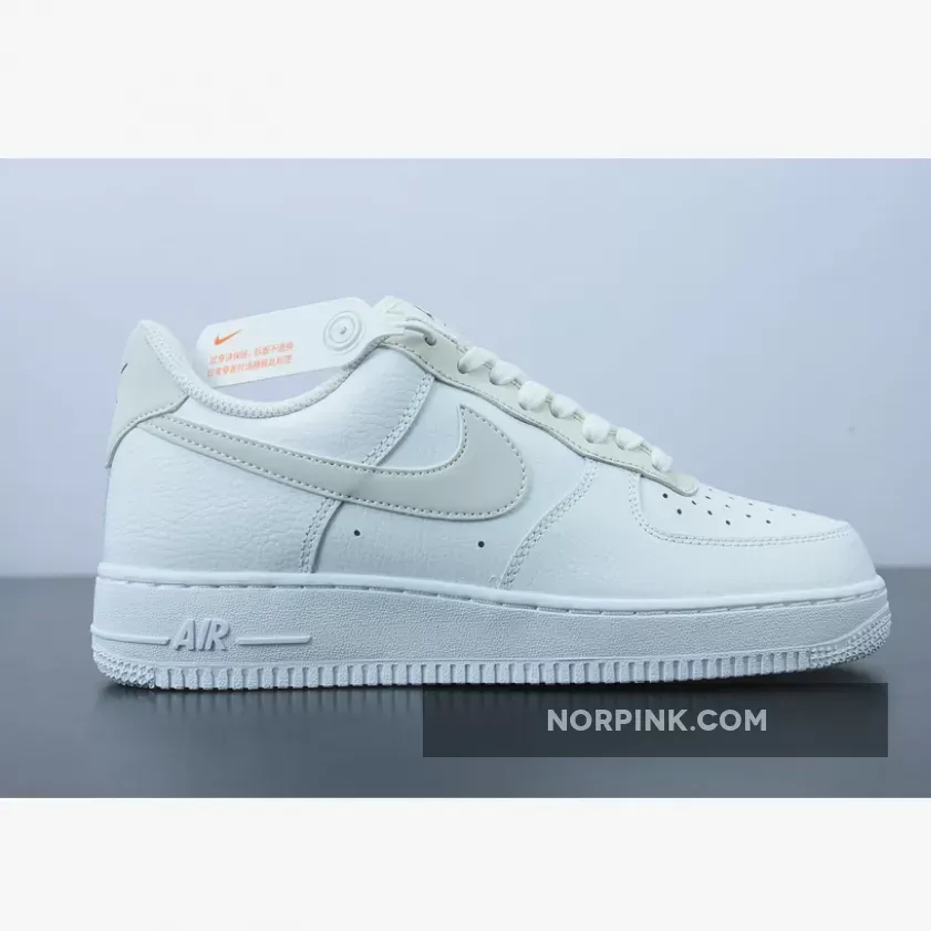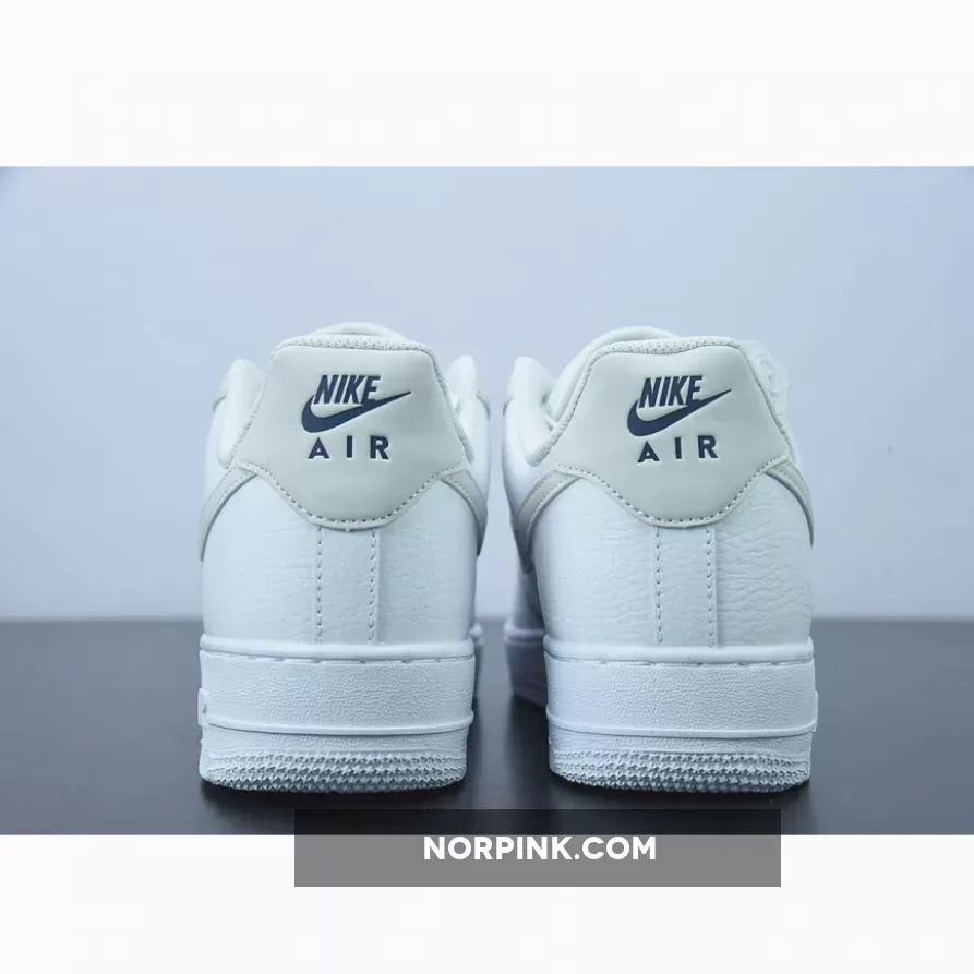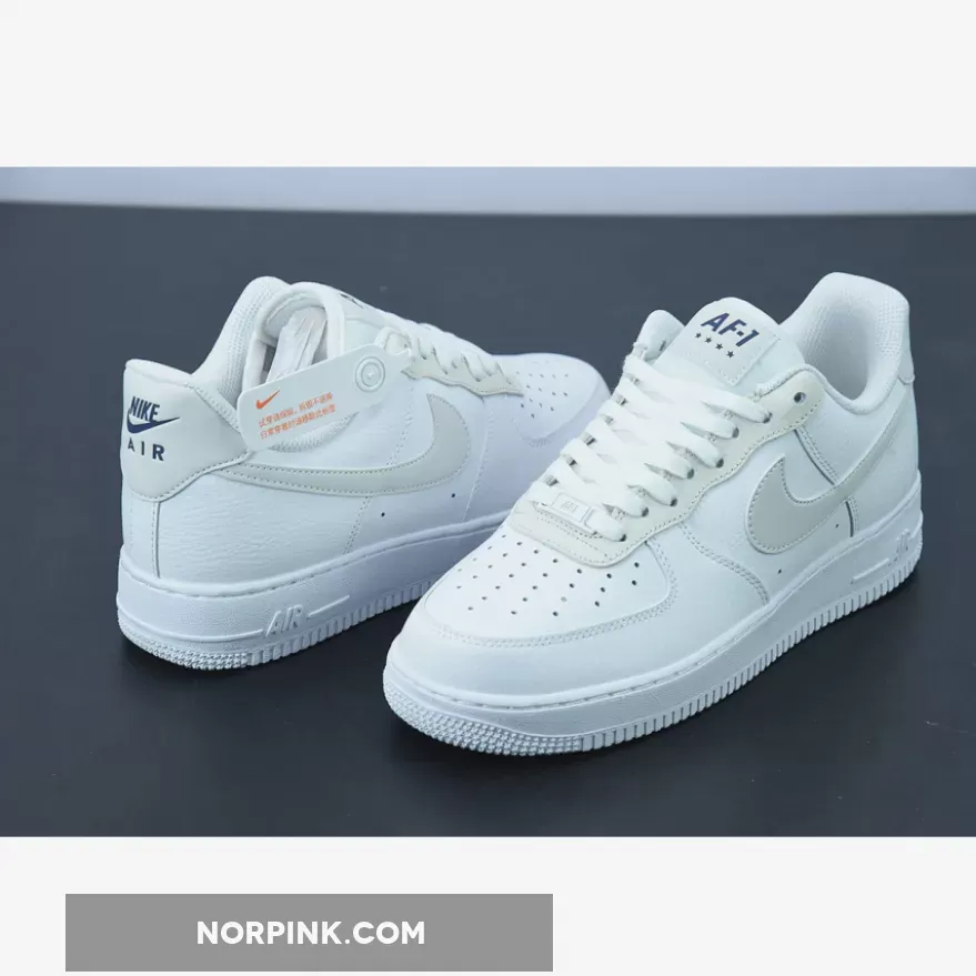 Clean, minimalist AF1 silhouette in a sleek white/beige combo. Premium pebbled leather uppers & unexpected royal blue branding elevate this timeless classic. #NikeAF1 #LightBone #SneakerGoals