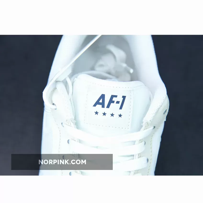 Dressed in a Summit White, Deep Royal, and Light Bone color scheme. This Nike Air Force 1 features a White tumbled leather upper paired with Light Bone accents on the eyestay, Swooshes, tongue tags, and heels along with matching laces. Royal Blue is used on the tongue and heel branding while the shoe is completed with a clean White AF1 rubber sole.