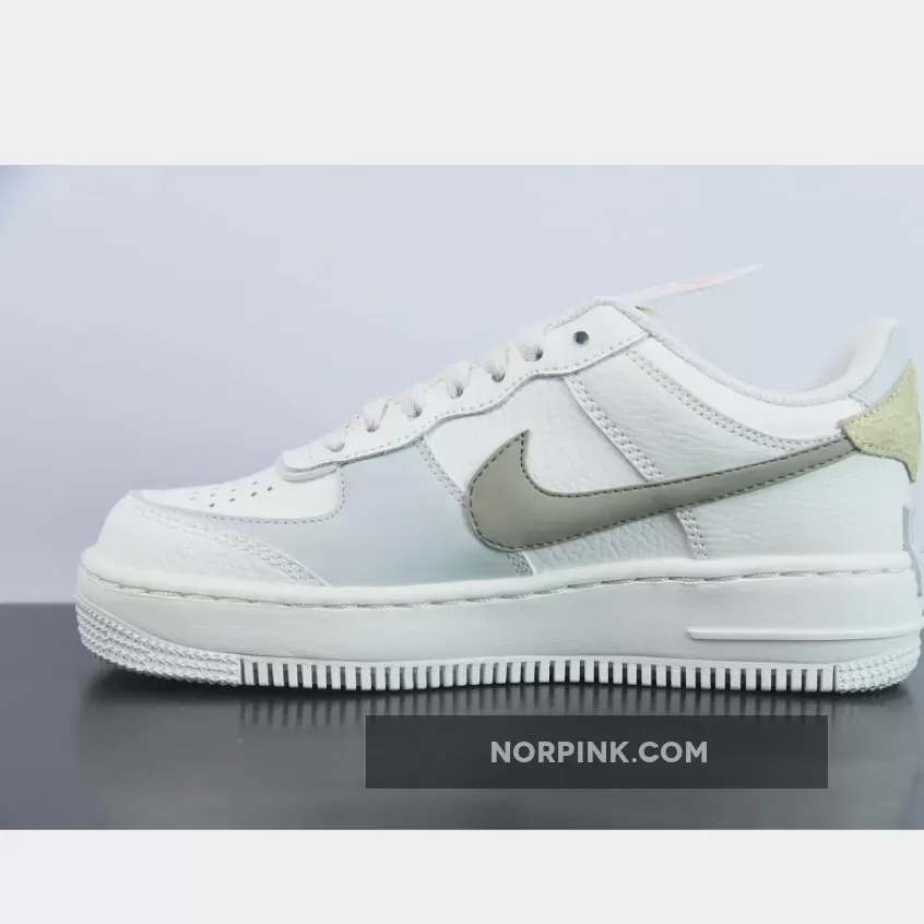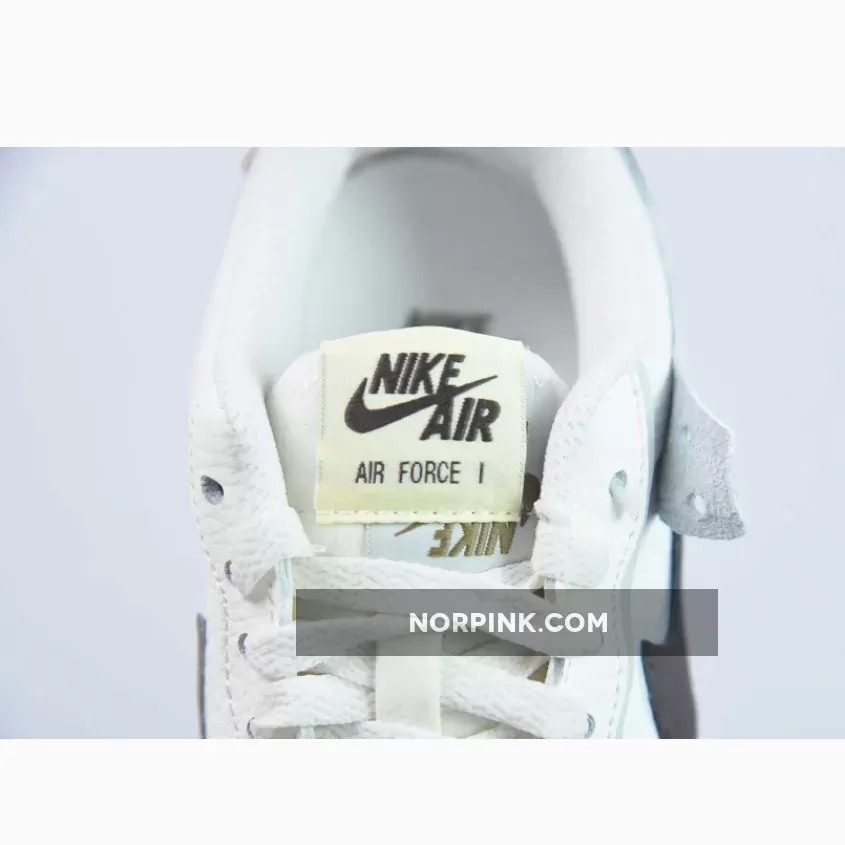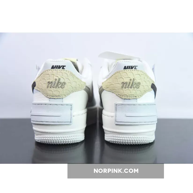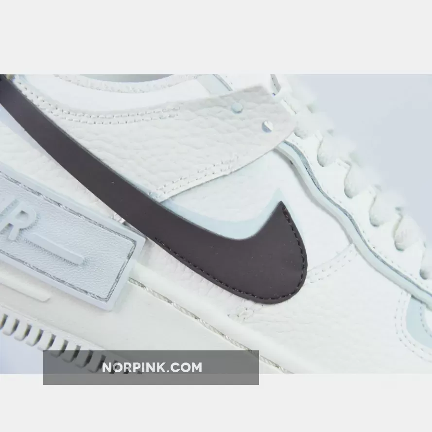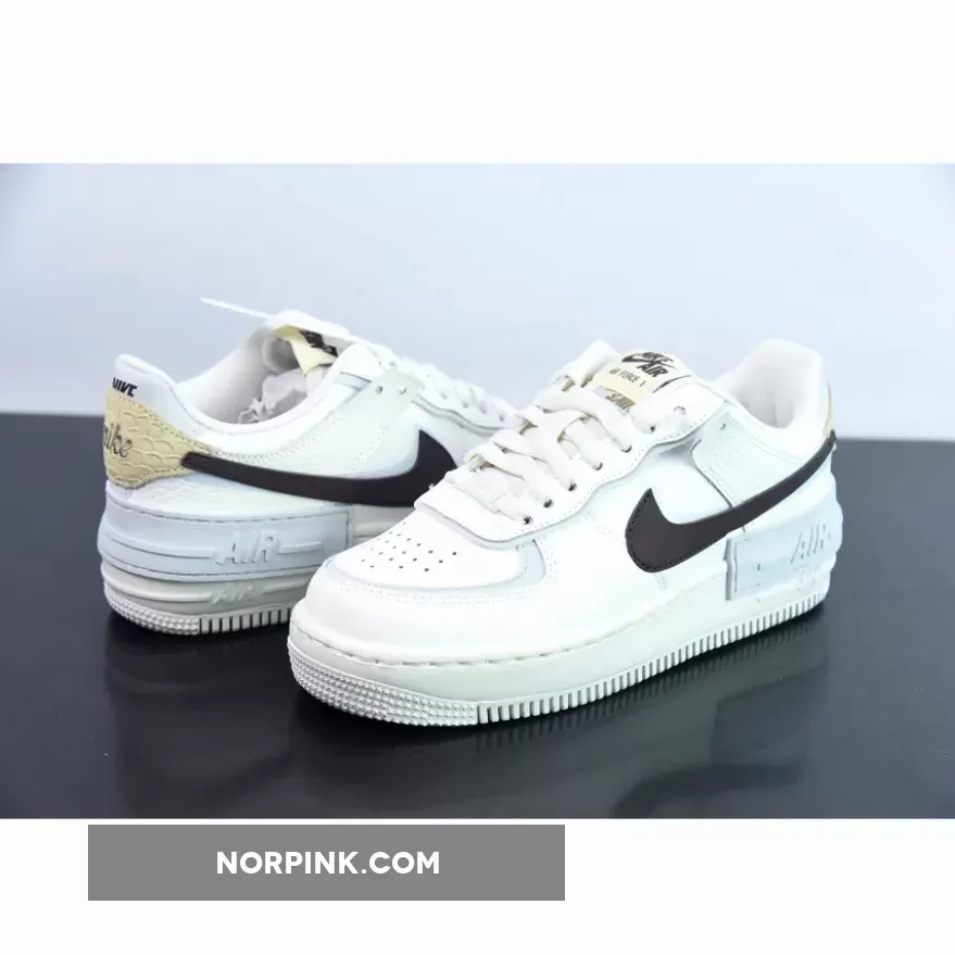 All the deconstructed tooling is here once again, the Shadow’s layered panels sprinkled throughout. The majority of the upper bears a white leather construction, light blue hits peeking out from underneath the overlaying panelling. A dark brown Swoosh clings on with its segmented stitching, partly attached to the python heel panel. Both heel portions boast different scaling patterns which only adds to the asymmetrical feel of the shoe, however bear the same embroidered vintage “nike” font. A mirrored logo on the insole and doubled up tongue labels are another fraction of changes that make the Shadow a fun addition to the Air Force line-up.