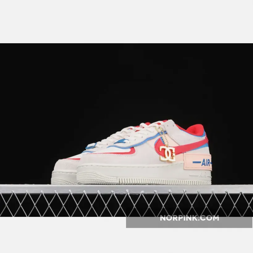 Dressed in a Sail, University Red and Photo Blue color scheme. This Nike Air Force 1 Shadow comes constructed in a mix of leather, mesh and suede highlighted with Red and Blue contrasting accents throughout. Hints of Pink atop a solid White rubber sole completes the design.