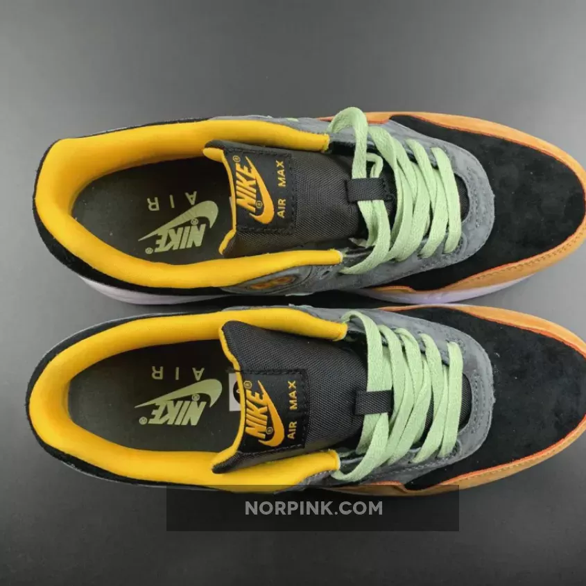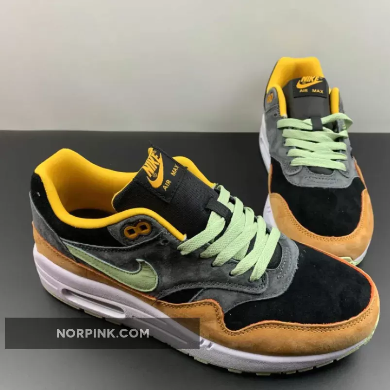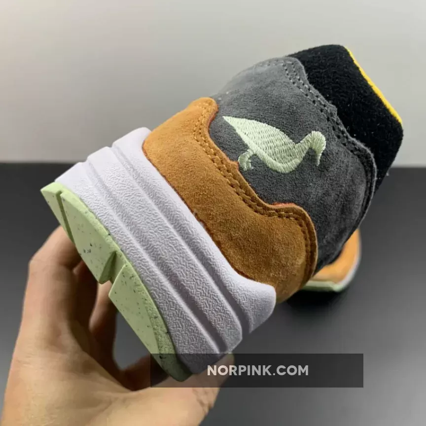 Dressed in a mix of honeydew, anthracite, kumquat, and black color scheme, this shoe features an upper constructed with premium suede materials. Supple black highlights the base, with anthracite hits covering most of the center panel and heel. The mudguard and lining opt for a tonal kumquat, while honeydew accents the Swooshes, laces, and the embroidered duck motif on the heel. A white midsole with AIR units atop a honeydew-speckled outsole rounds out the design.