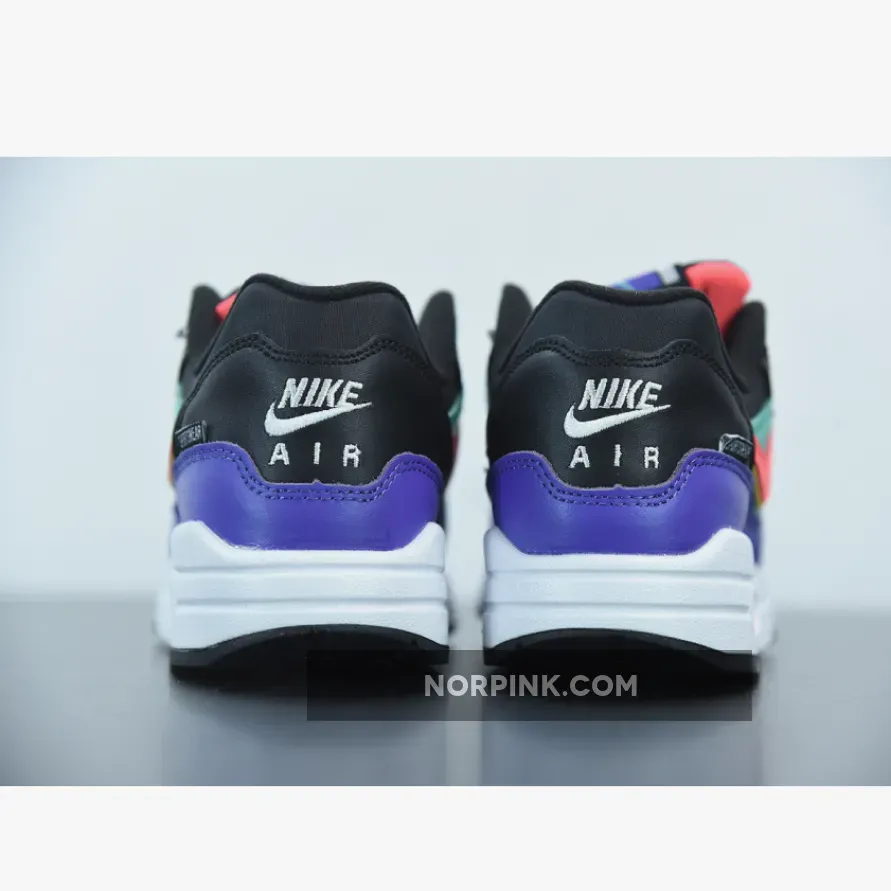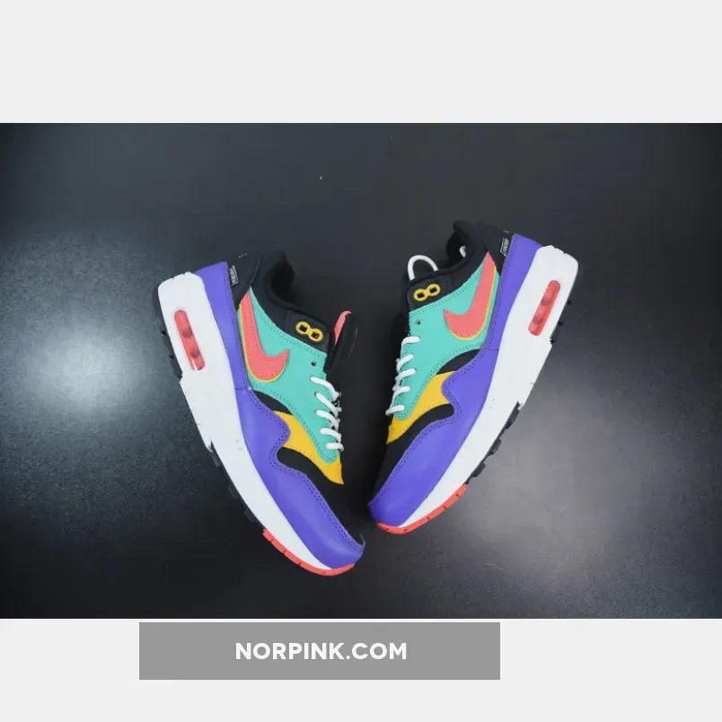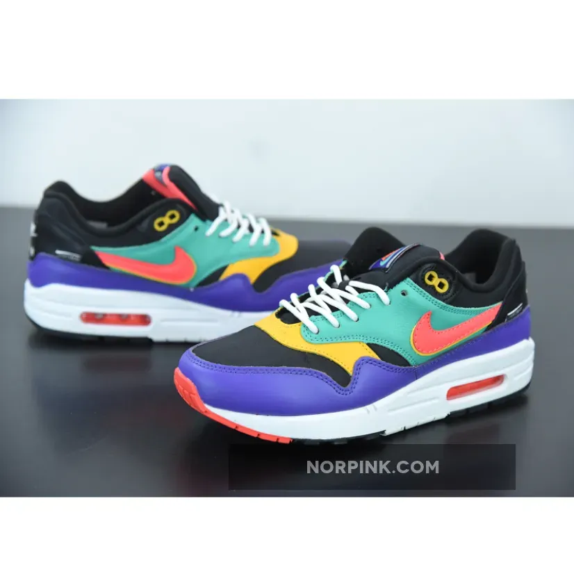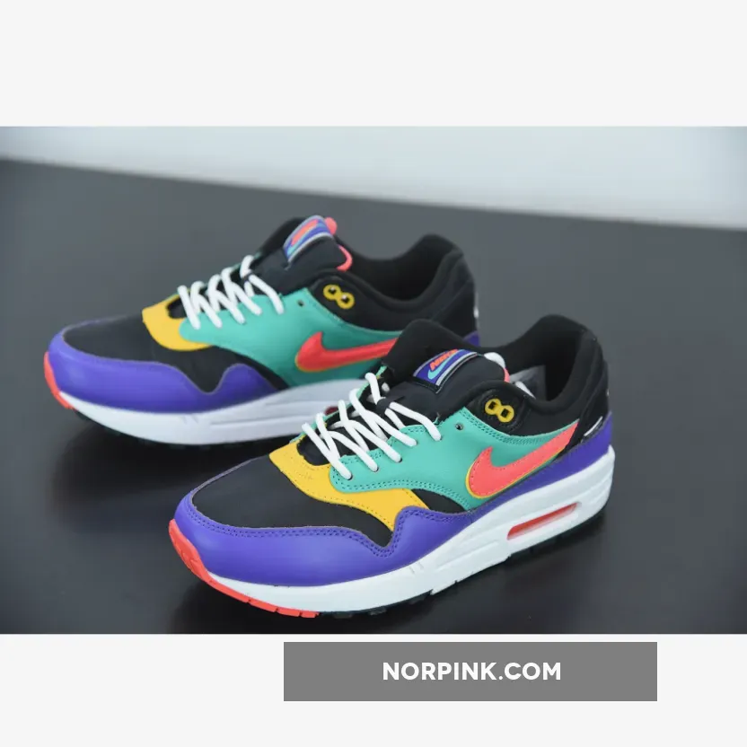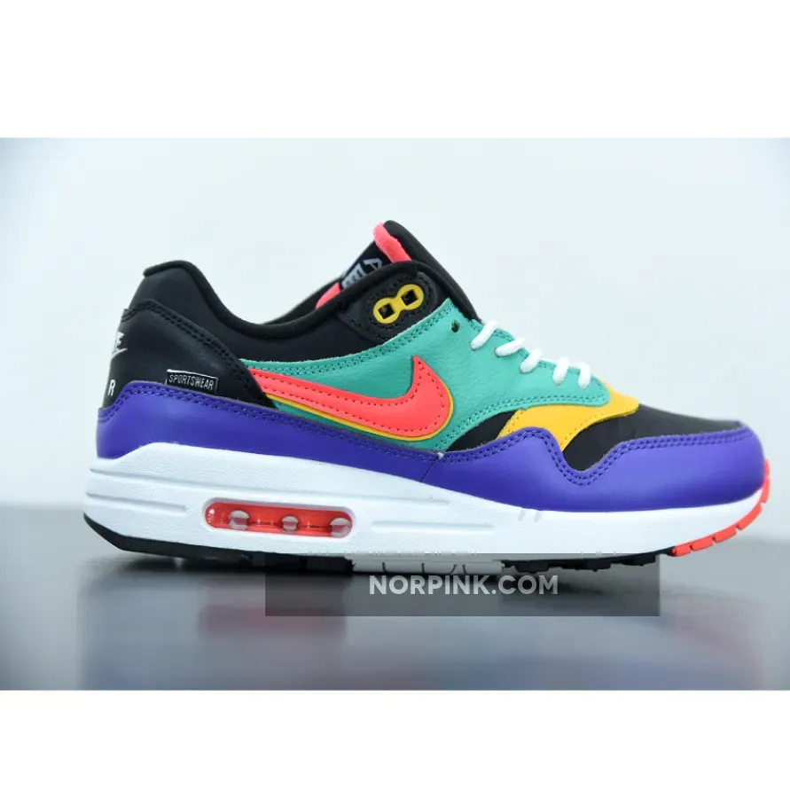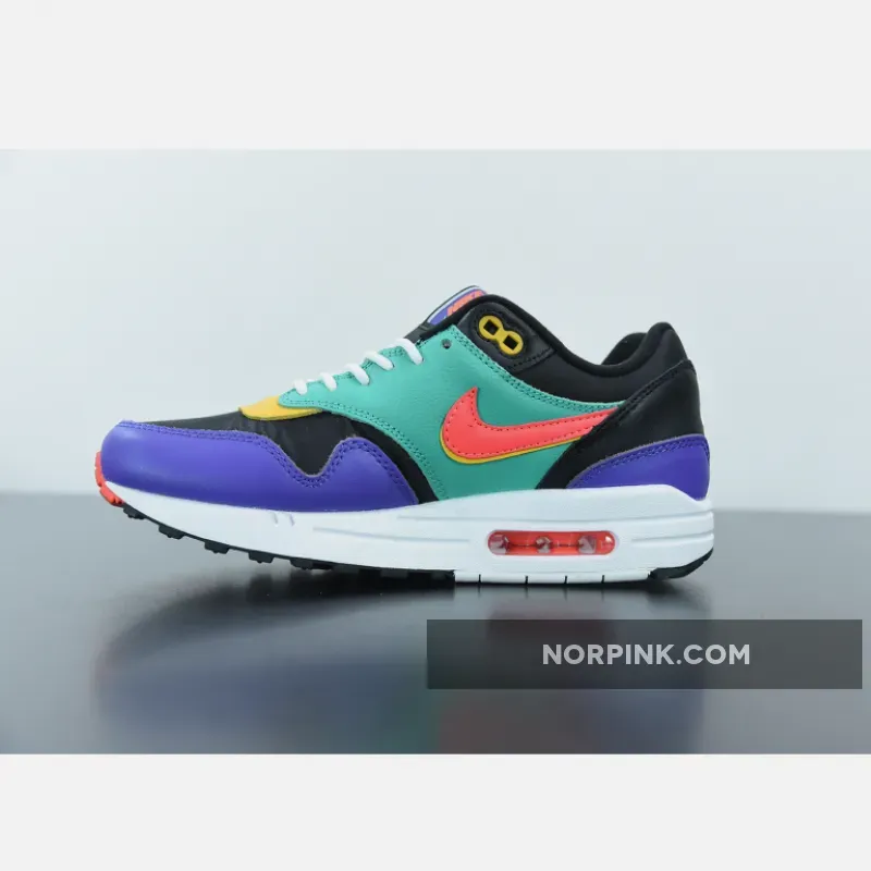A straight nod to Nike Windbreakers from the ’90s, this Nike Air Max 1 features a Black upper with Yellow, Teal, Crimson, and Orange tones on the overlays.