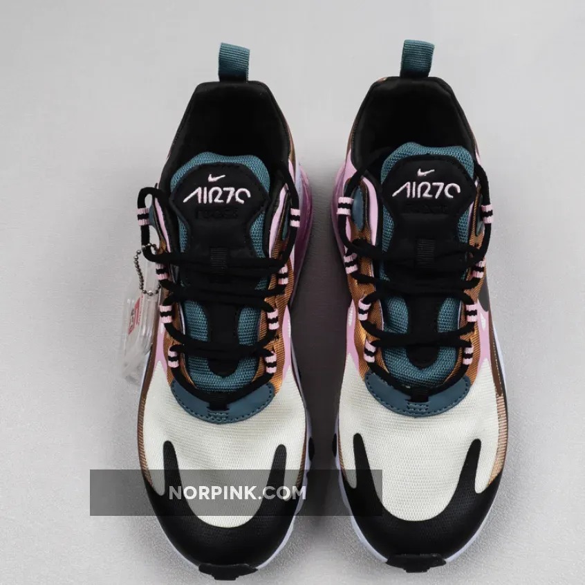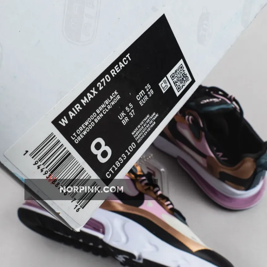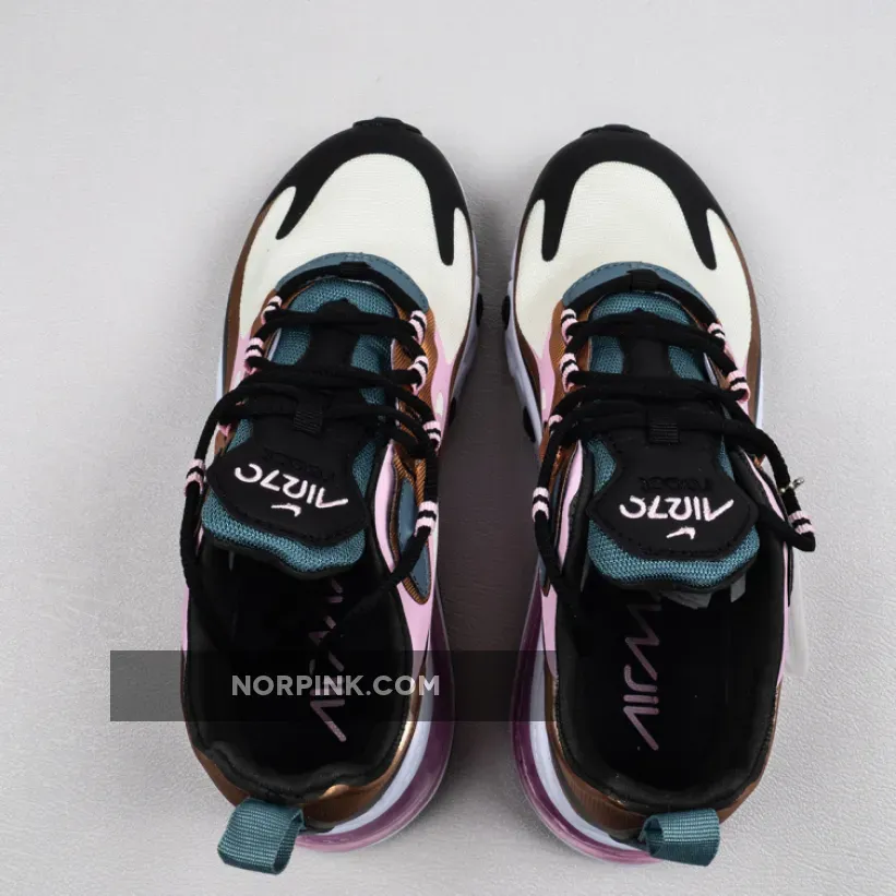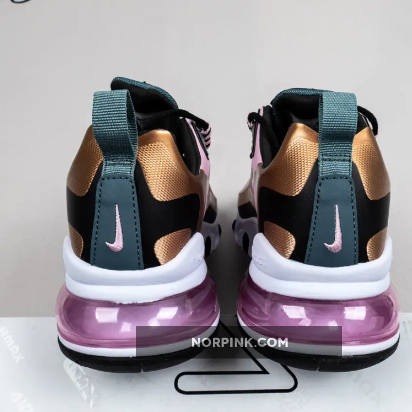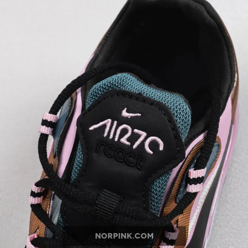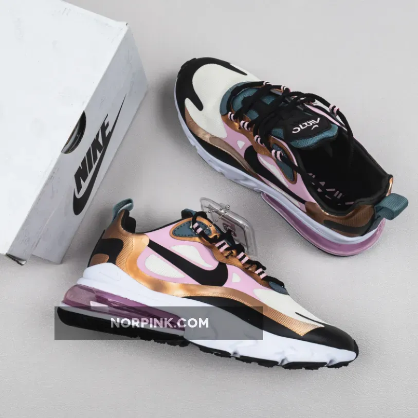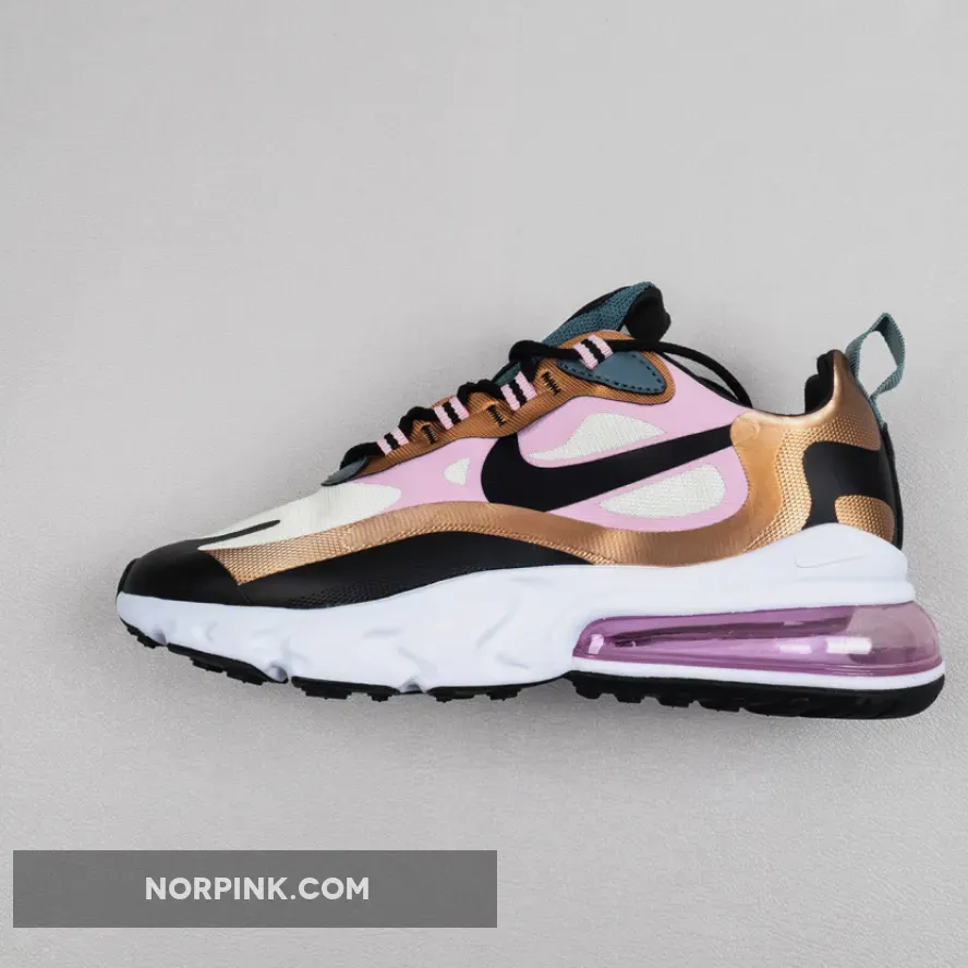 This offering of the Nike Air Max 270 React features a Beige mesh base with synthetic overlays in a mix of Pink and Bronze with Black Swooshes on the sides. A White React midsole, Pink covering the Air Max heel unit with a Bronze boarder atop a Black outsole completes the design.