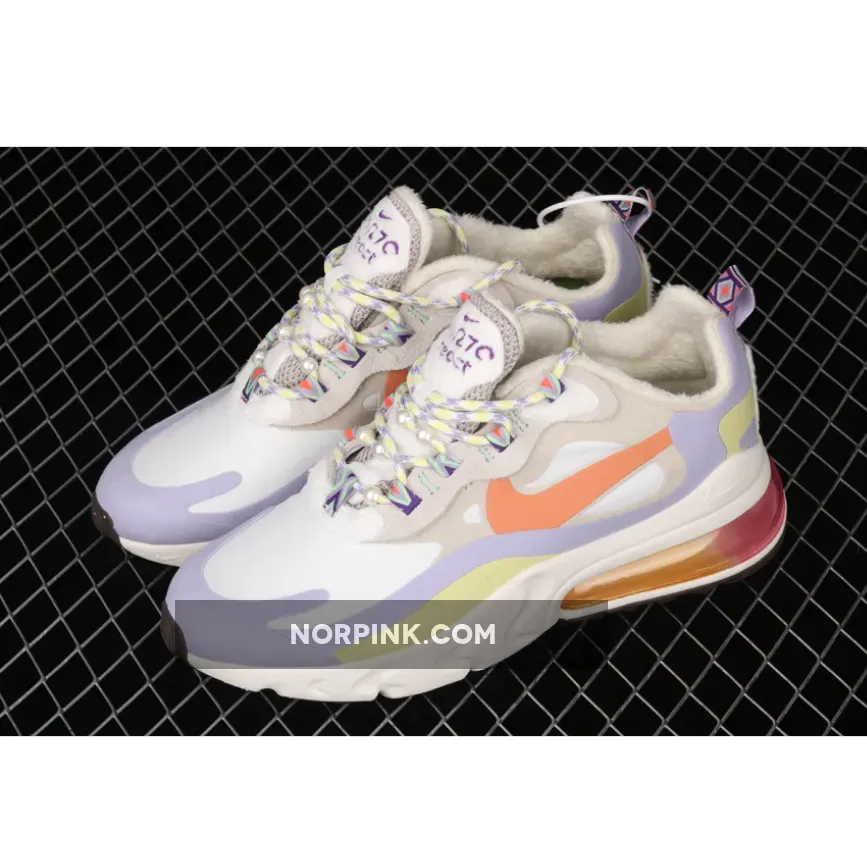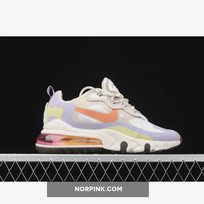 This offering of the Nike Air Max 270 React features a mix of White and Beige covering the upper detailed with pastel Orange, Purple, and Yellow tones. Suede eyelet overlays, pearls spotted throughout the laces, fleece lining to keep warm during the colder months highlighted with a native patterns on the lace loops, heel tab, and insoles. A gradient Air Max heel unit atop a React cushioned sole completes the design.