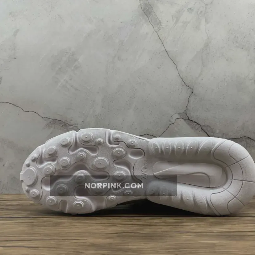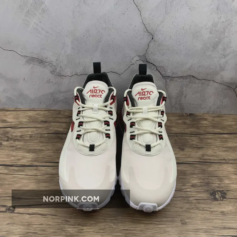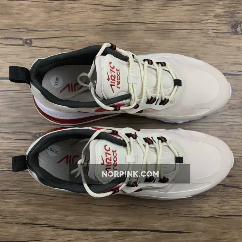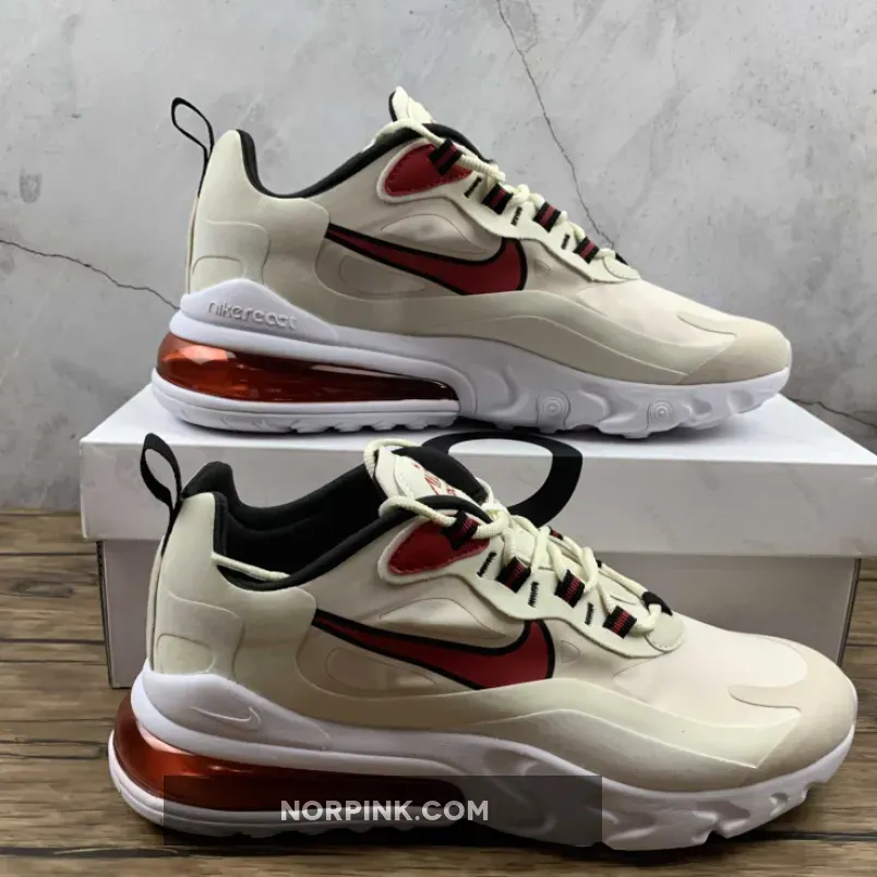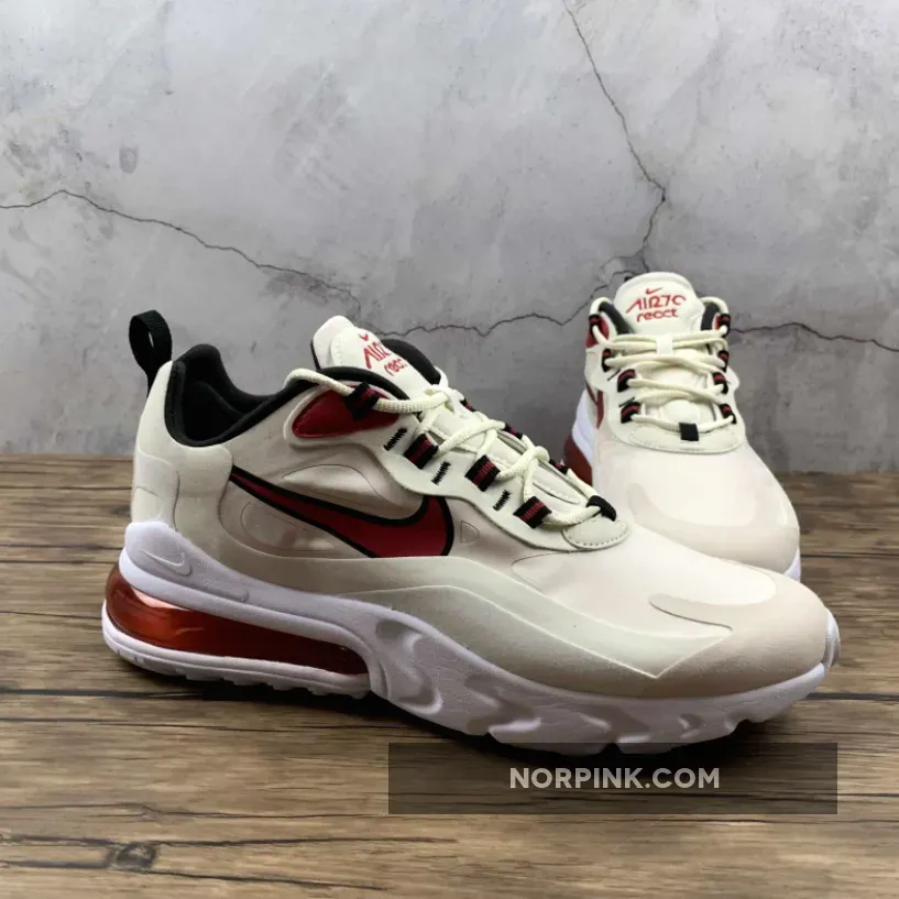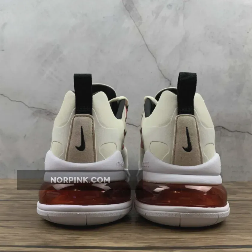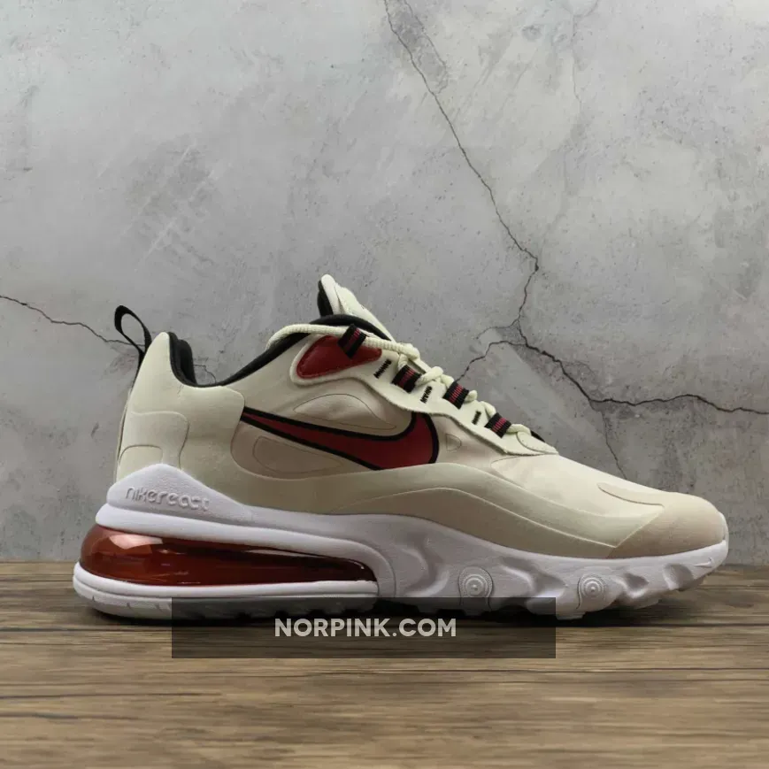 This offering of the Nike Air Max 270 React features a Light Orewood Brown and Sail upper with suede overlays. Highlighting the shoe are Cardinal Red accents paired with Black lining atop a White React sole.