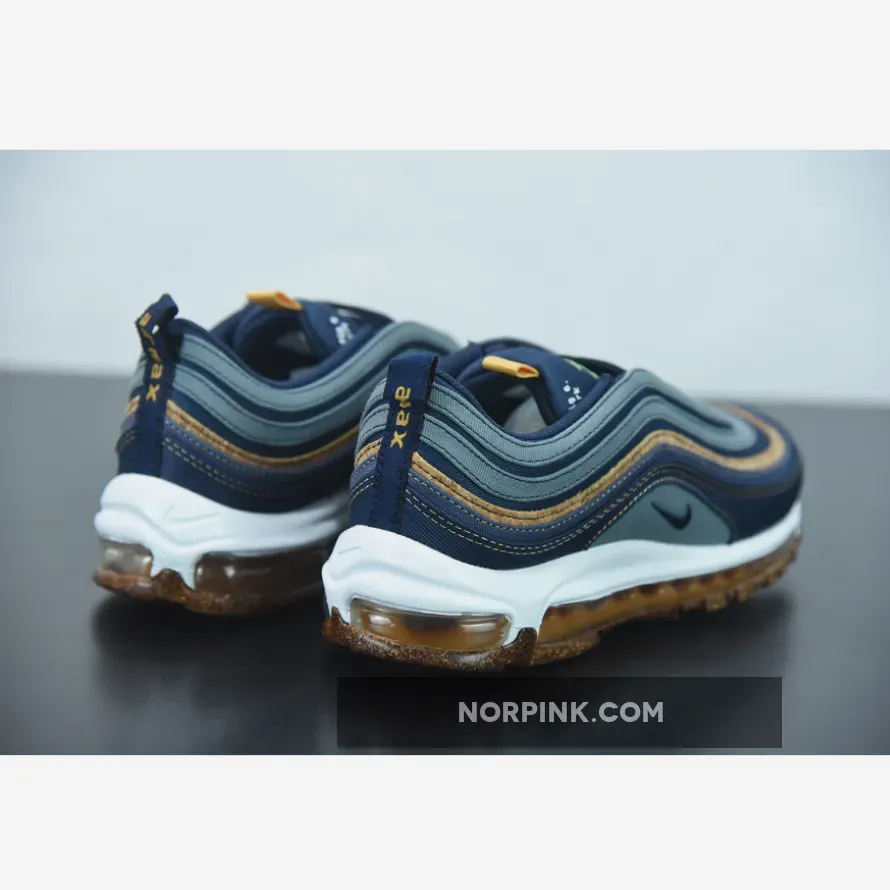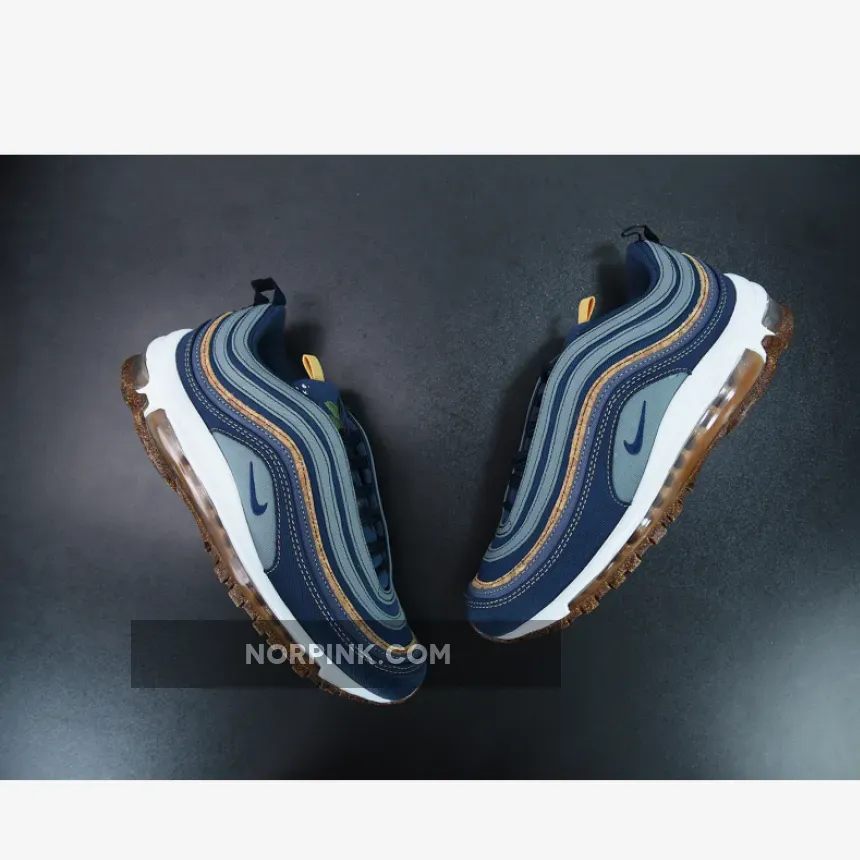 This Nike Air Max 97 features an Hasta, Obsidian, Thunder blue, Bucktan, White, and Wheat color combination. Constructed with 20% recycled content, including Recycled Poly Canvas and textiles on the upper. Other details include a plant on the tongue and a cinder flecked rubber outsole.