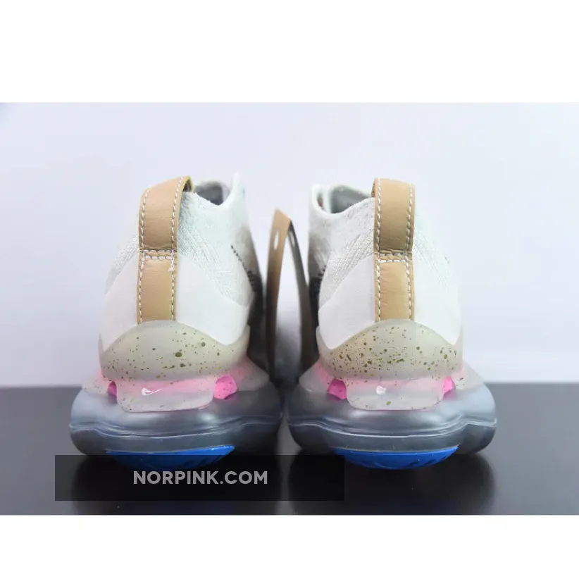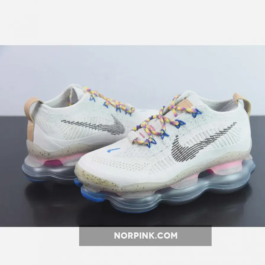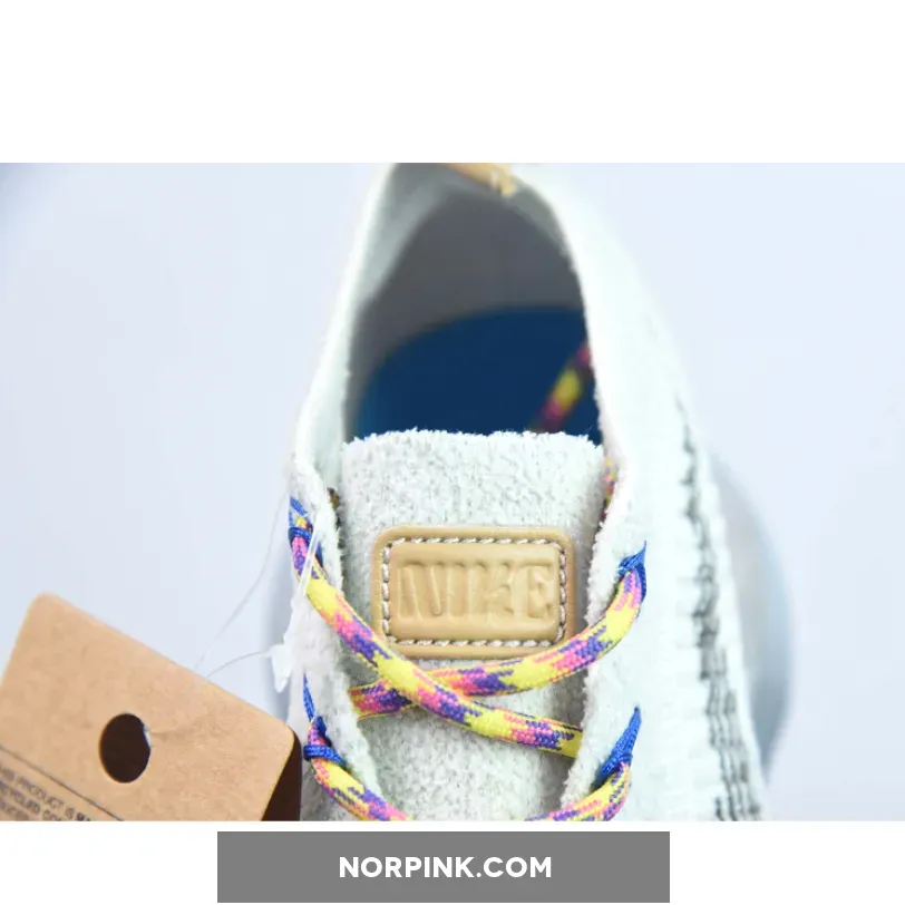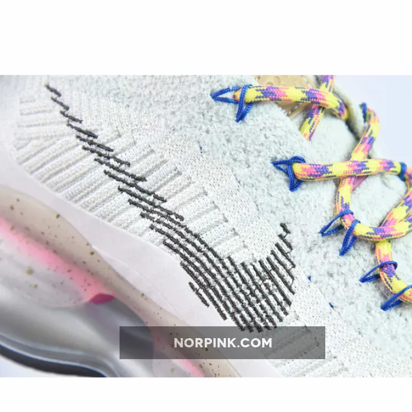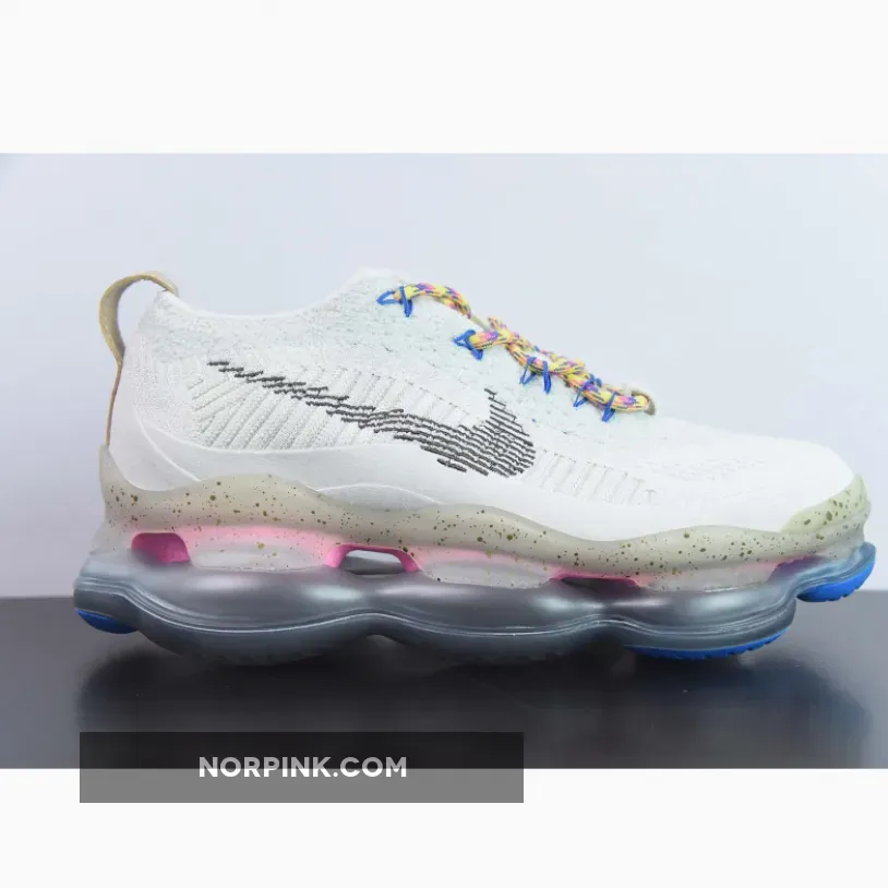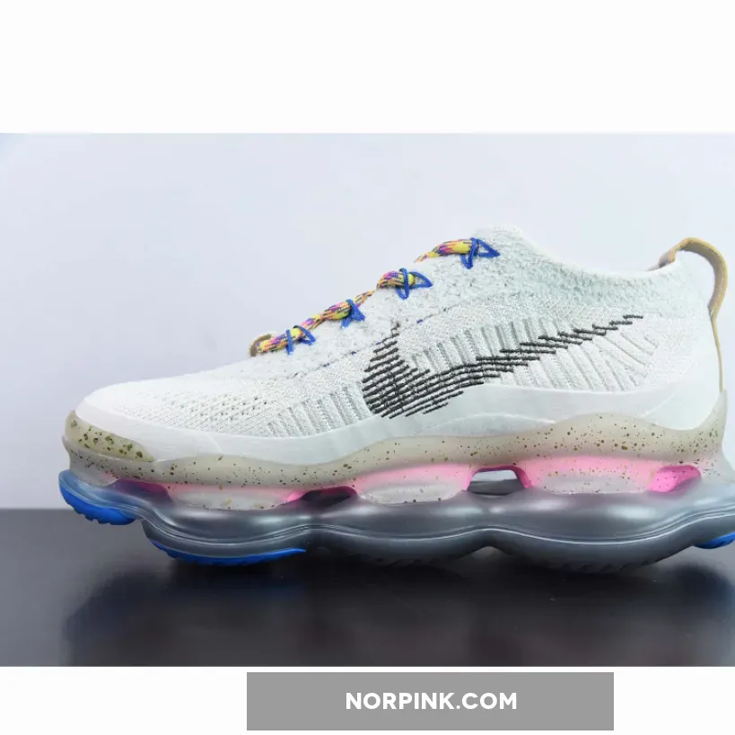 This offering of the Nike Air Max Scorpion features a Flyknit upper with stitched logos on the side. Other details includes Yellow. Pink, and Purple-colored rope laces, Tan leather tongue labels and heel pull tabs, Blue mini Swooshes on the toe with Nike “Just Do It” branded insoles.