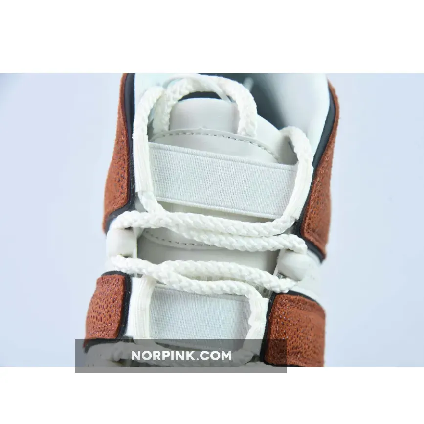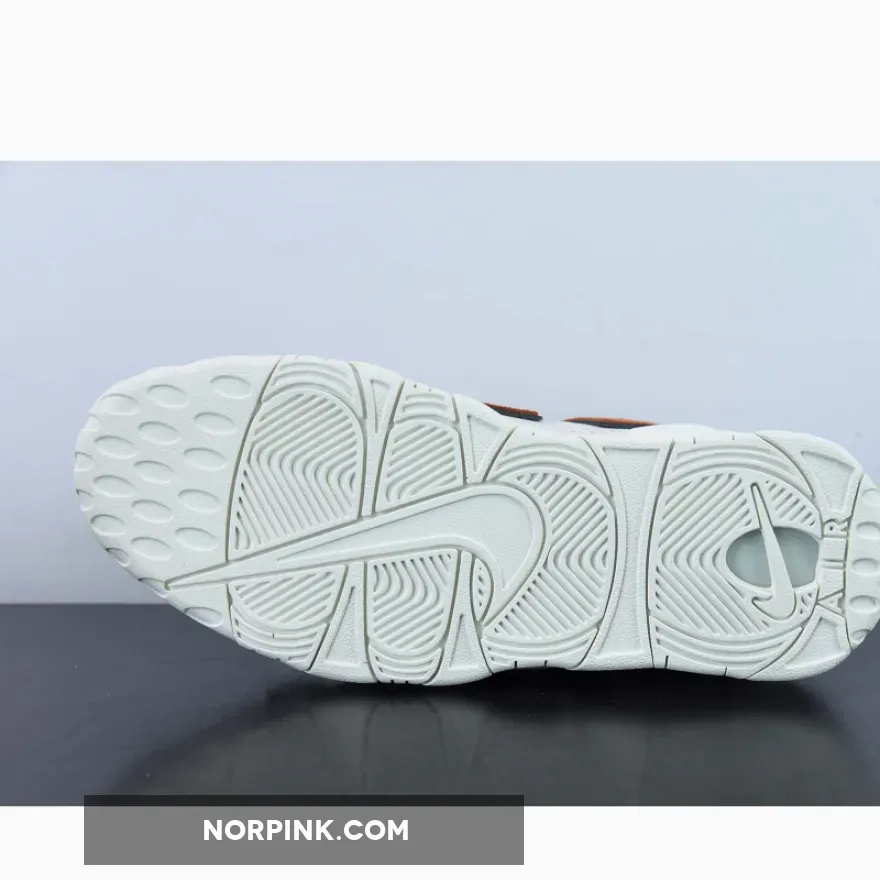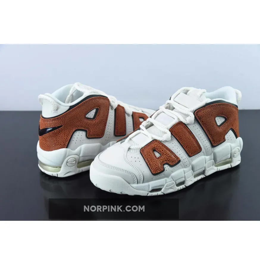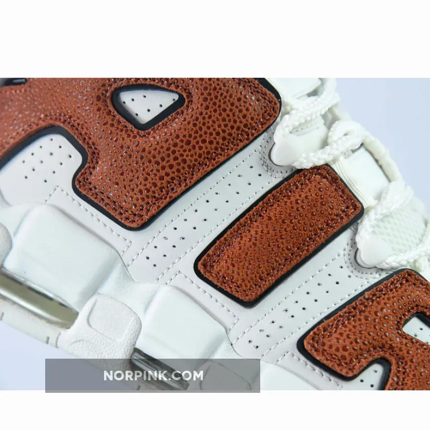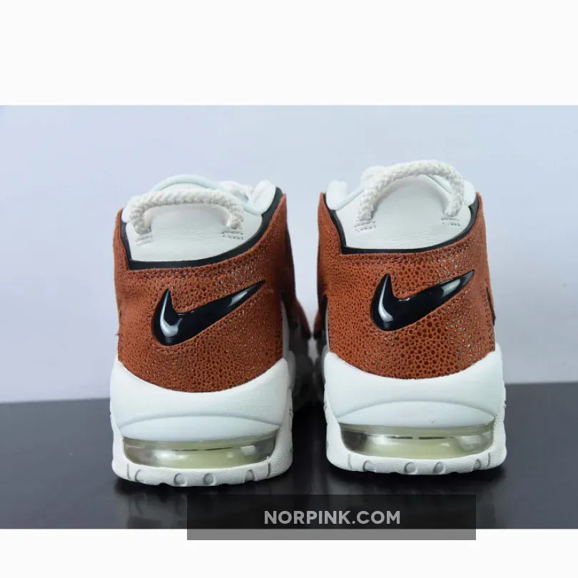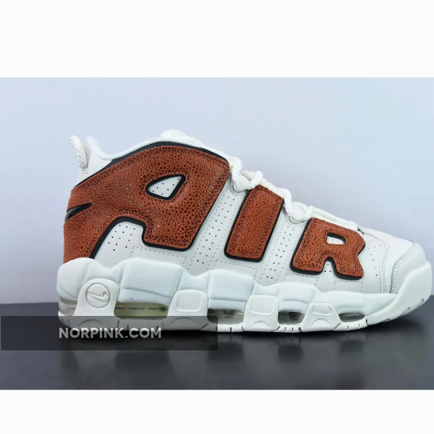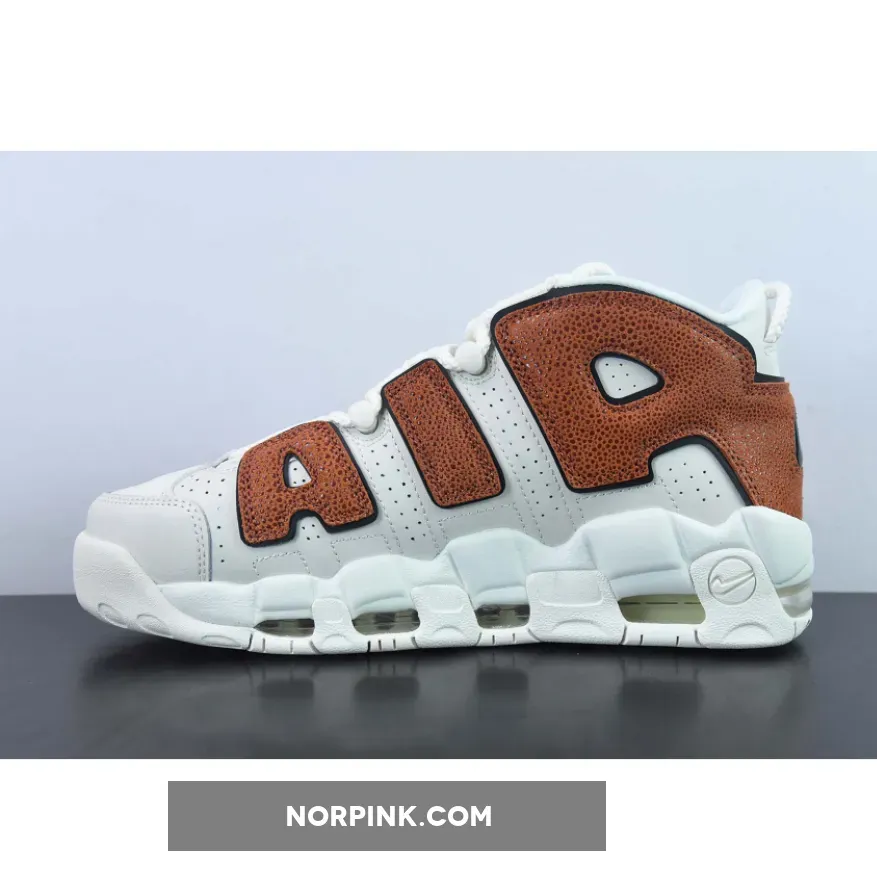 Meanwhile, large “AIR” letter patches on the side panels are dressed in a textured brown tumbled leather that’s reminiscent of a gritty basketball surface. Finally, classic Nike Air More Uptempo features such as lightweight Air bubble units and convenient loops are retained.