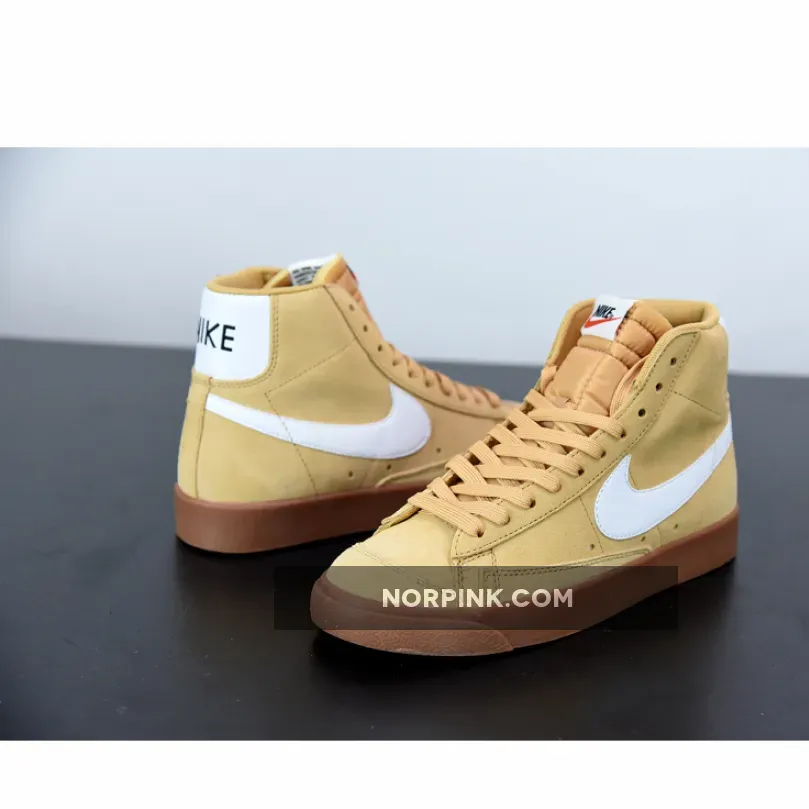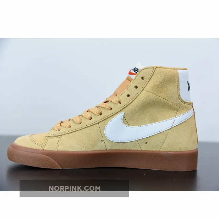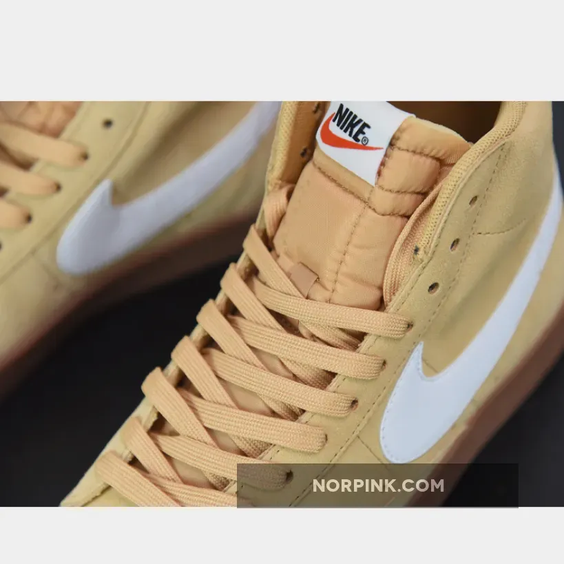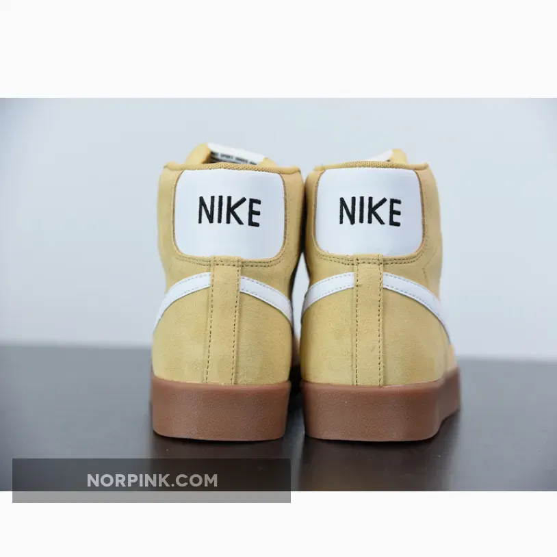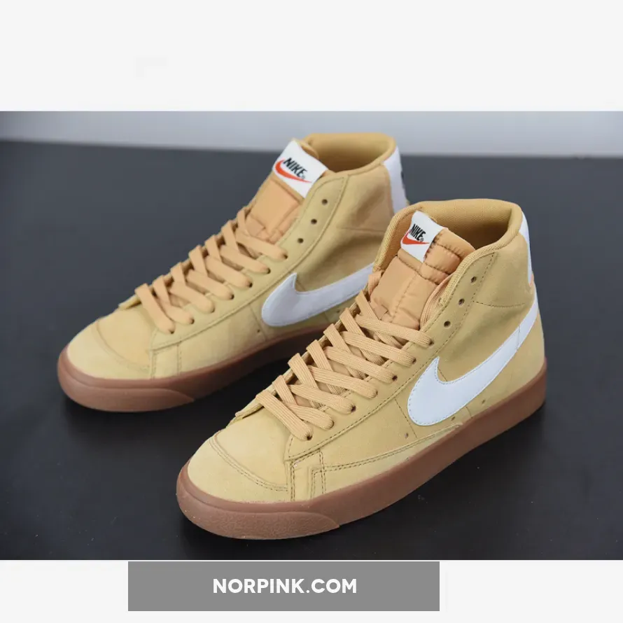 This edition of the Nike Blazer Mid features a Wheat suede upper paired with White leather Swooshes and heel overlays. Black “NIKE” branding in the rear, signature padded tongues atop a Gum rubber outsole completes the design.