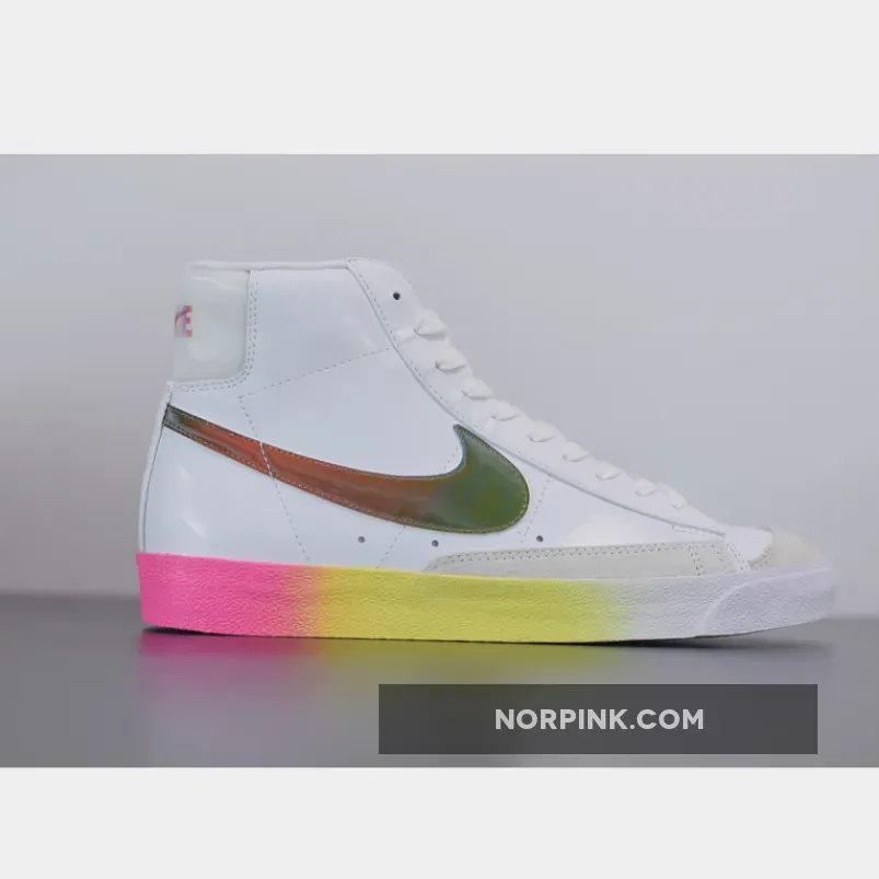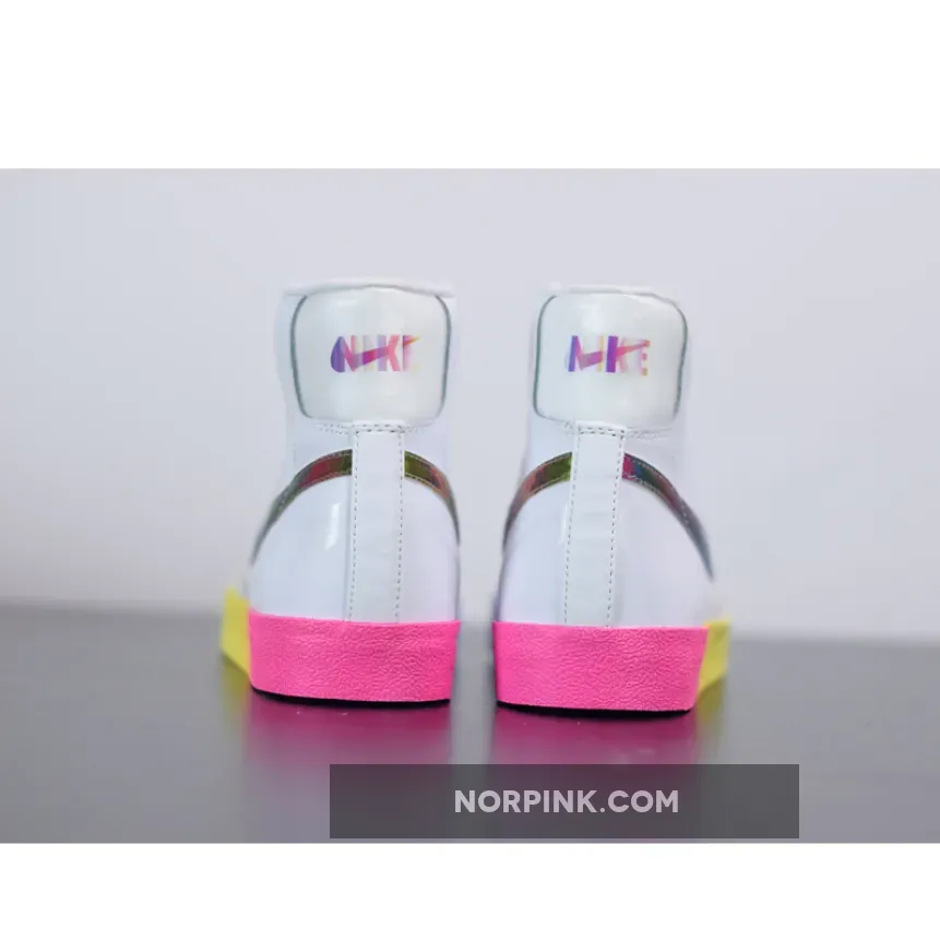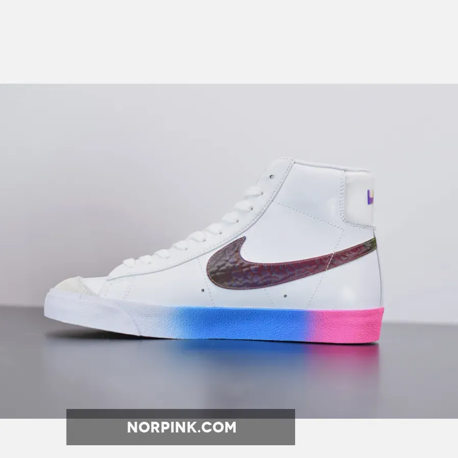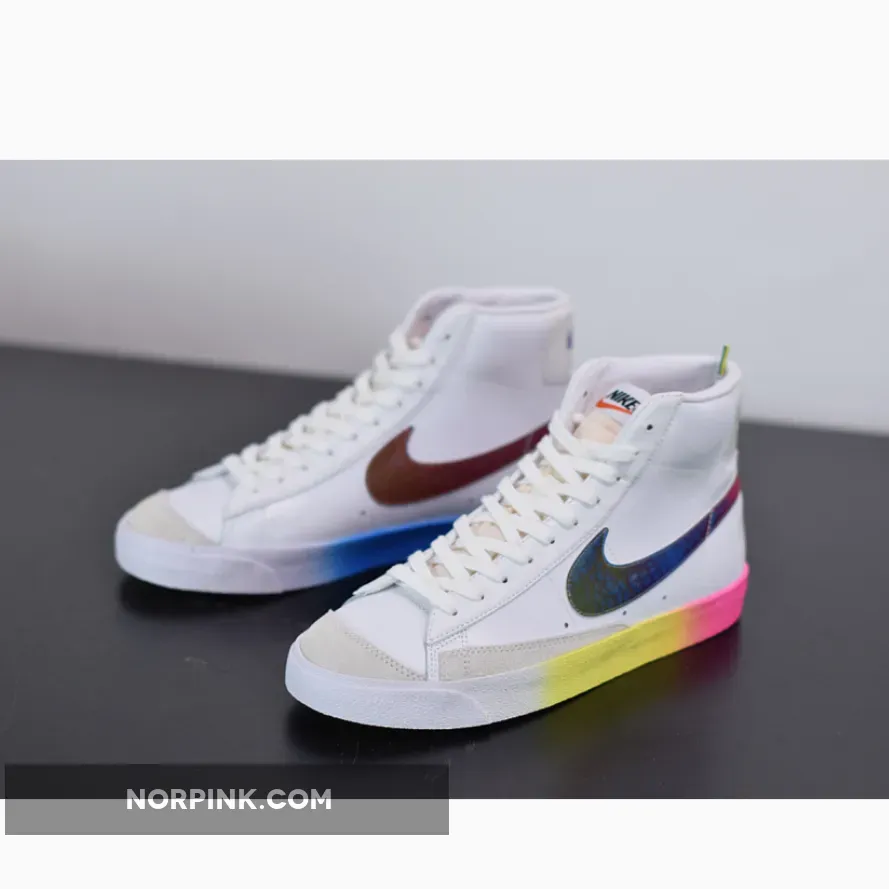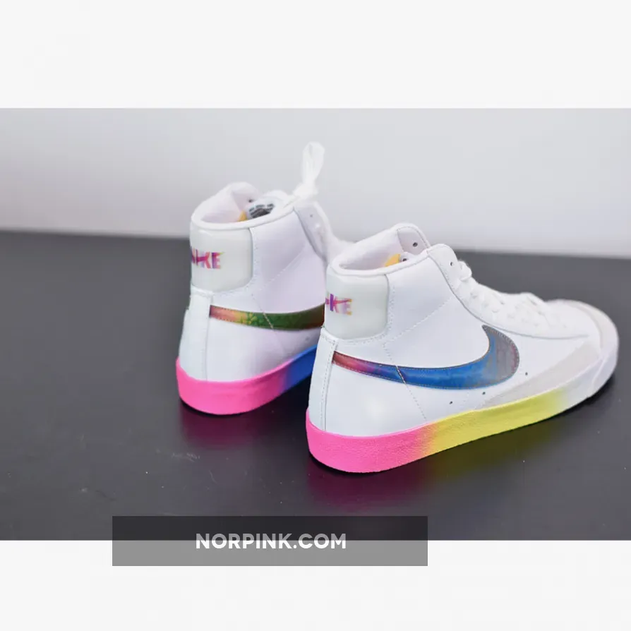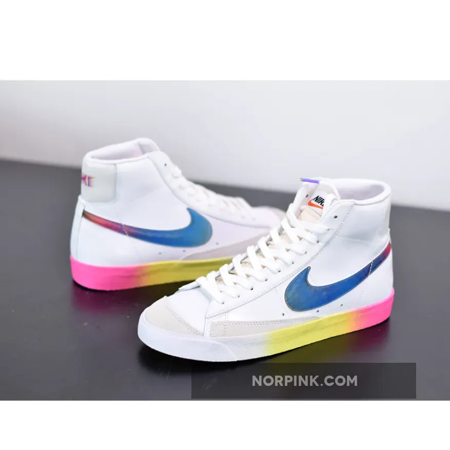 Dressed in a Battle Blue and Aurora Vivid color scheme. This Nike Blazer Mid features Blue on the lateral and Teal on the medial highlighted with Golden Yellow and Purple accents along with Green appearing on the branded tongues and heels. A White leather toe cap atop a solid White rubber sole completes the design.