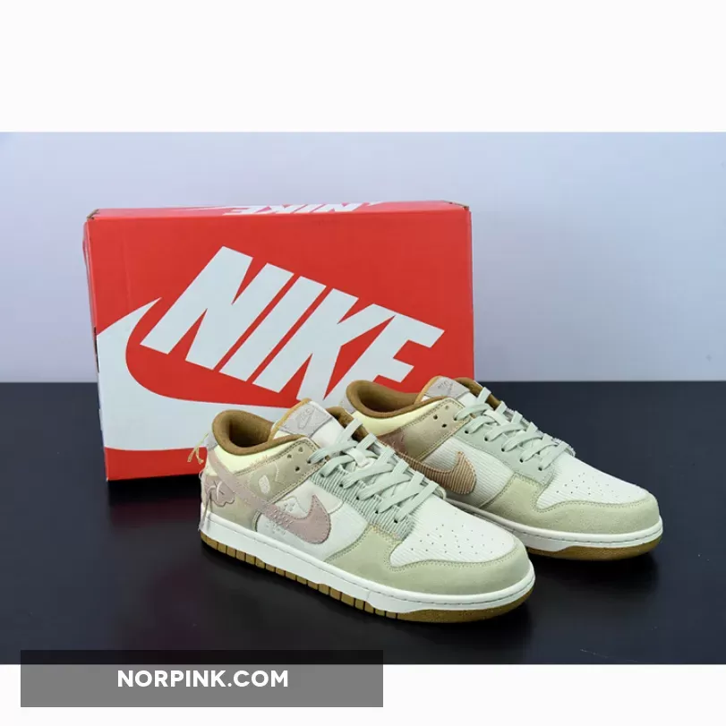 The new Nike Dunk Low experiments with materials and dons pretty pastels. Make the acquaintance of the Nike Dunk Low Bright Side.The base of the upper is a corduroy-like ribbed material showing on the toe box and the quarter. The overlay on the toe cap is suede in a beige-grey hue, matching the ribbed material eyestay panel and the laces. The foxing is also suede but in a darker tan. The suede heel tab is a light lavender colour. The signature profile Swooshes on the lateral sides are canvas in a lavender colour with a smattering of embroidered accents in the same colour marking the Swooshes midway. The swooshes on the medial side are pink in the ribbed material similar to the base but in lavender. Brown denim twill piping lines the cream tongue and the collar.