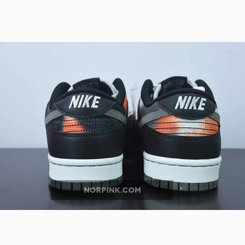 Recently, Peter Moore’s 37-year-old design emerged in a predominantly dark-colored ensemble complete with abstract patterns and reflective profile swooshes. Overlays found around the toe, along the tongue and at the heel opt for a tumbled leather build. The sidewalls’ logos indulge in a iron grey tone that shines silver under the proper lighting conditions; the iconic branding hit complements they charcoal tread underfoot. Tuned-for-basketball midsoles keep things simple in “White,” allowing for the panels visible at the toe box, mid-foot and collar area to revel in the spotlight. A scale-like material makes up the entirety of the Nike Dunk‘s base layer, with hits of grey, white and orange coming together to form some sort of koi fish-reminiscent gradient.