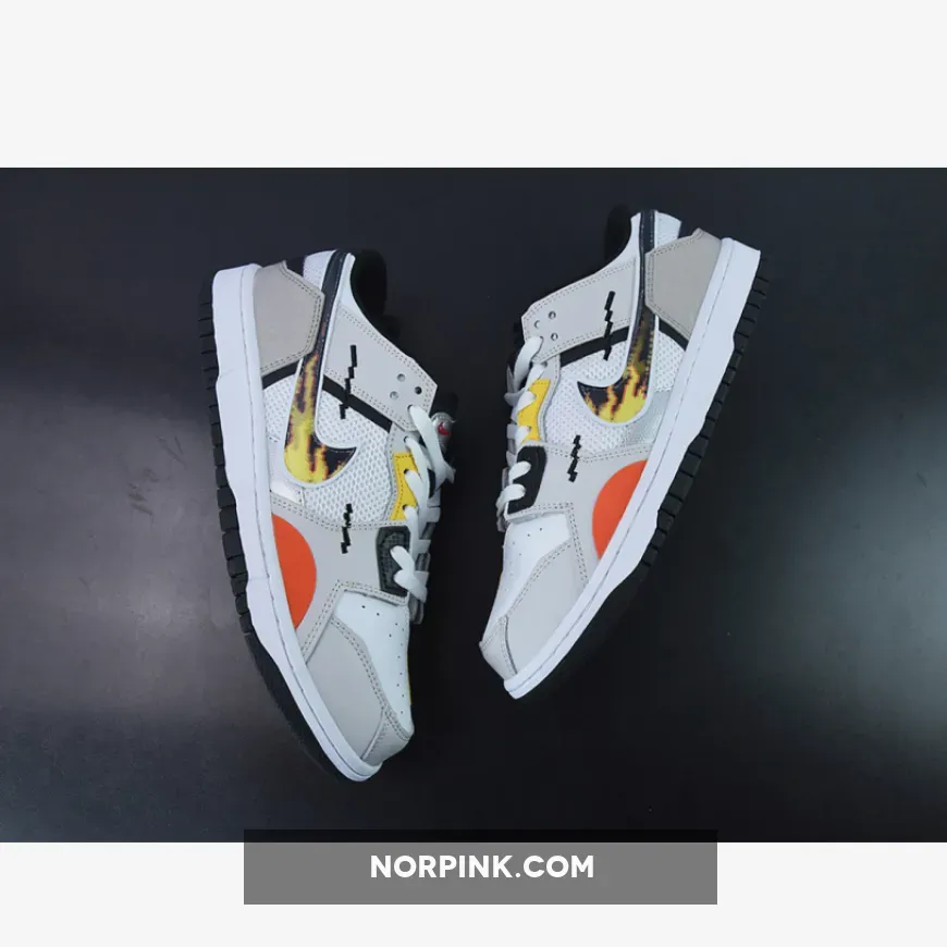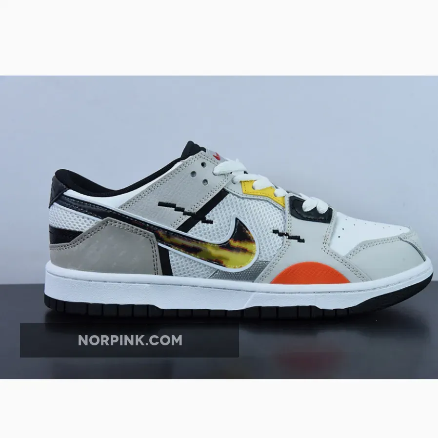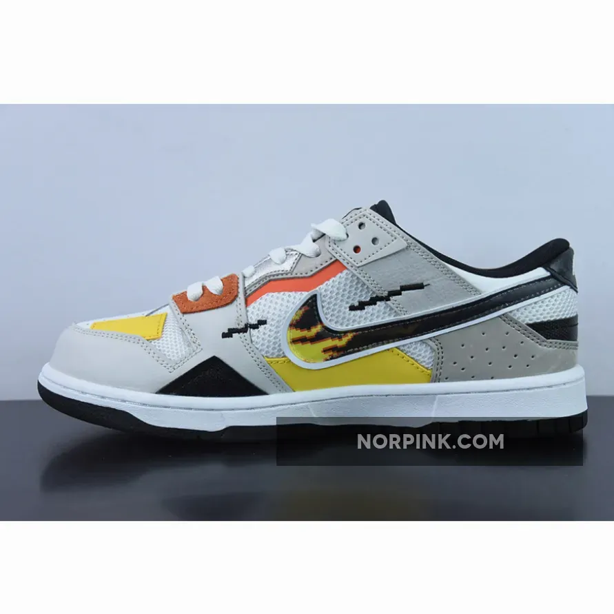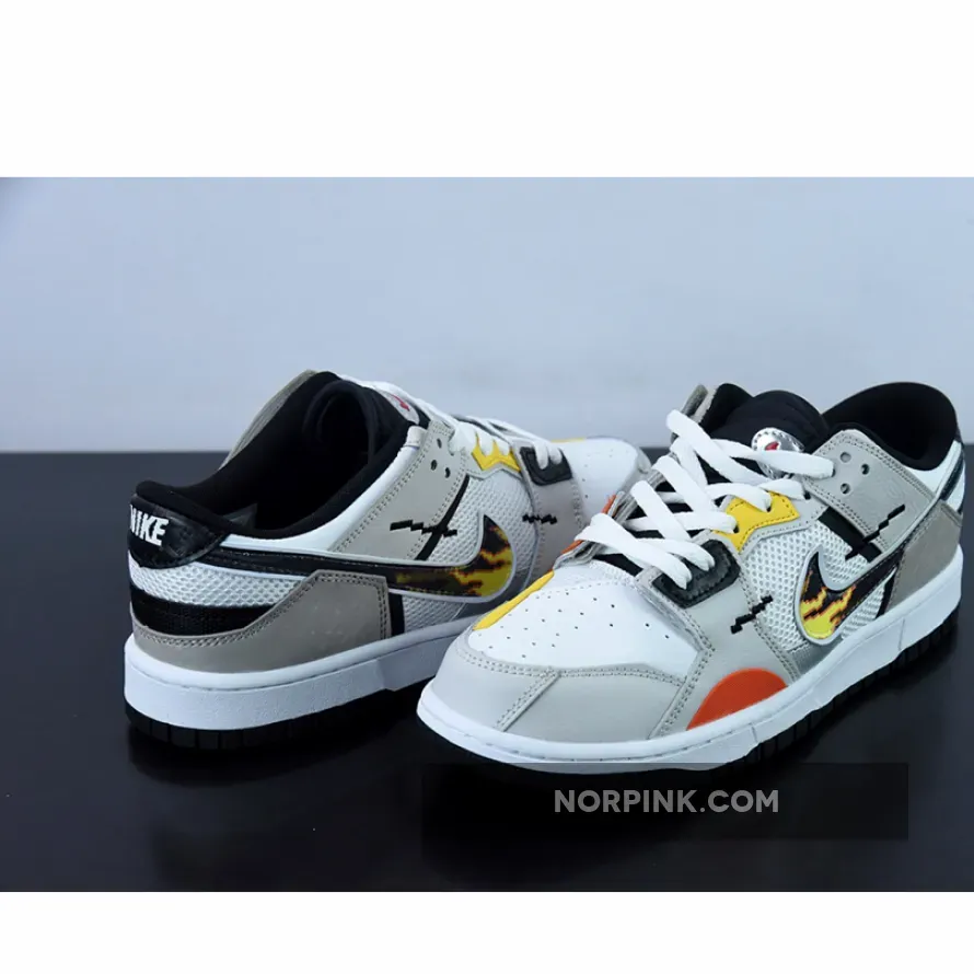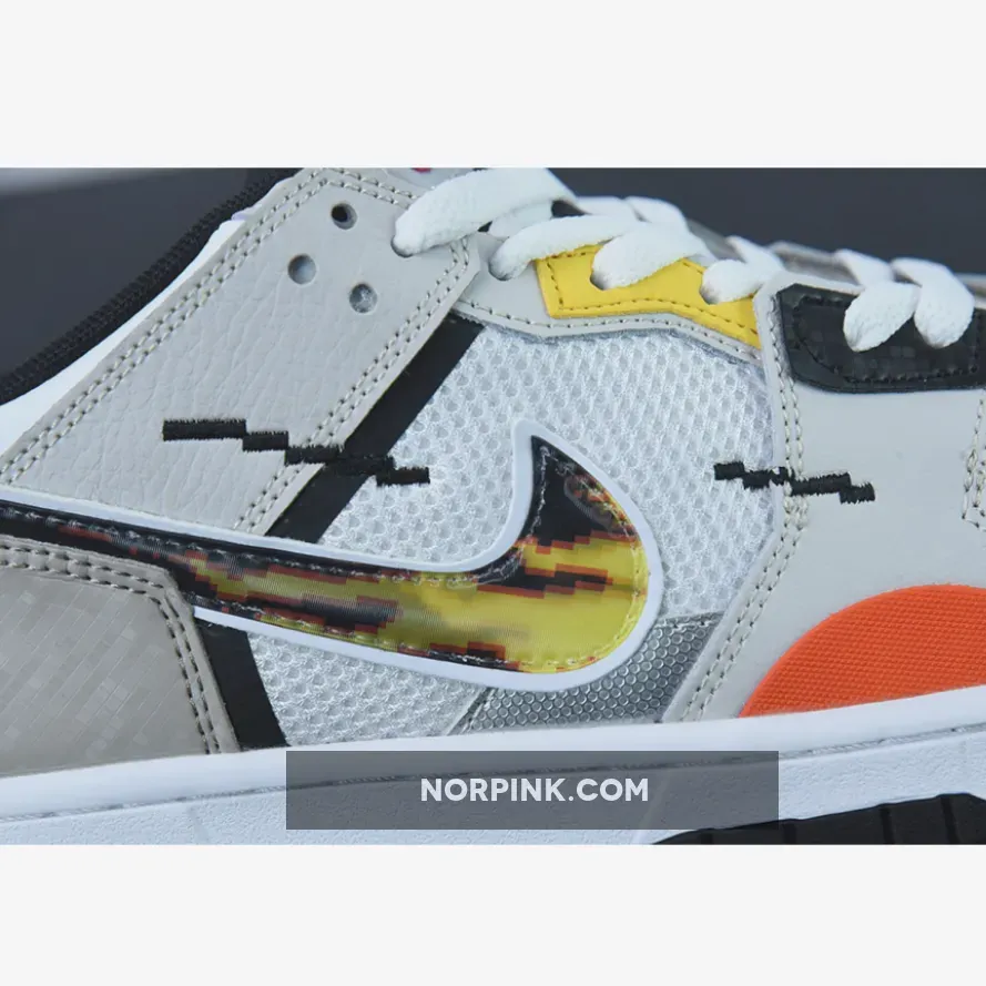 The anime-inspired “Mighty Swooshers” x Nike Collection gains a new addition with this Nike Dunk Low Scrap. Noted in grade school sizing, this Nike Dunk Low Scrap features a predominantly White and Grey color combination of mesh and leather with design highlights including 8-bit stitching, flame Swooshes, Silver tongue plate with Red Swooshes, and “The Battle of Dimension Six” and “Nike And The Mighty Swooshers” printed on the insoles. Finishing details include black, orange, and yellow accents throughout, white rubber midsoles, and black rubber outsoles.