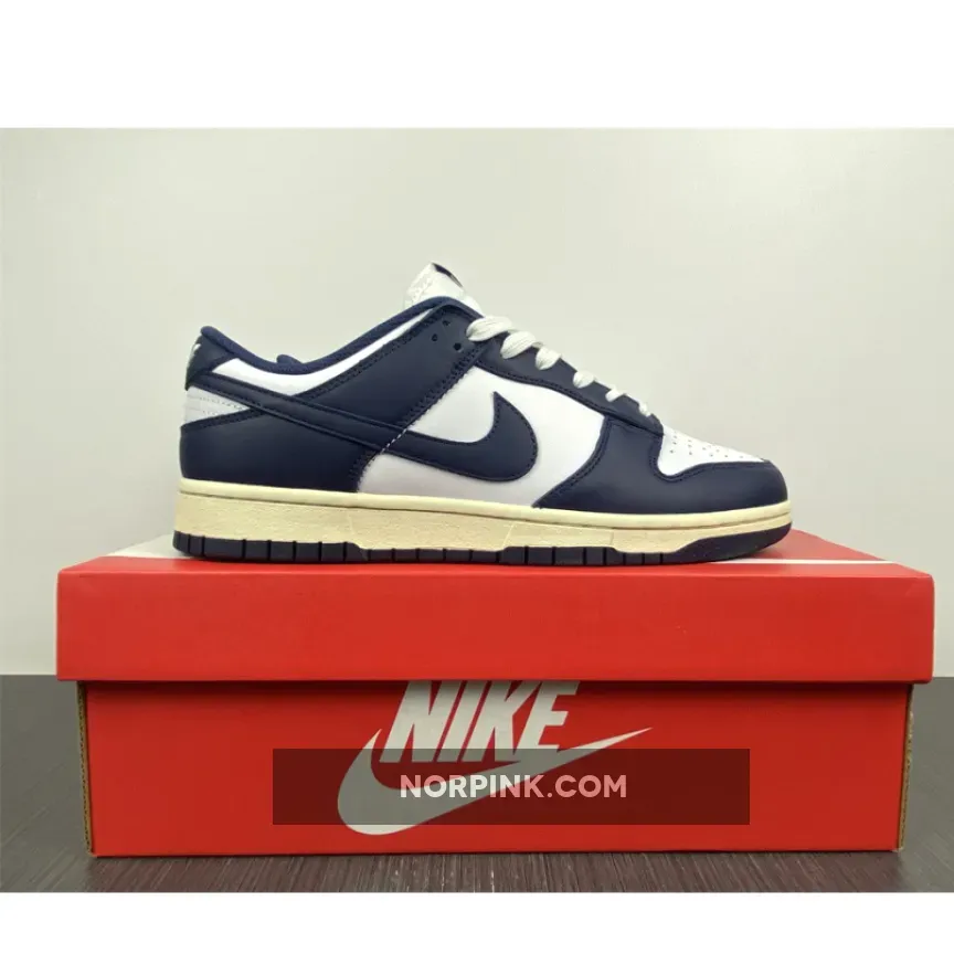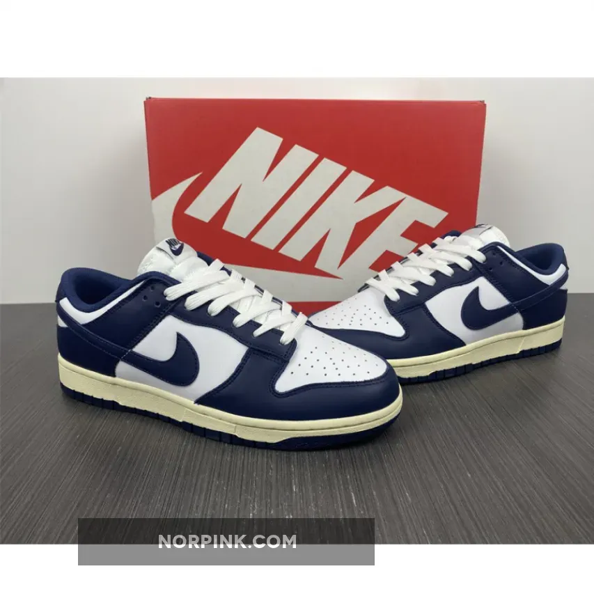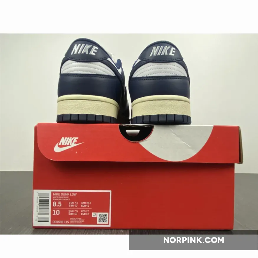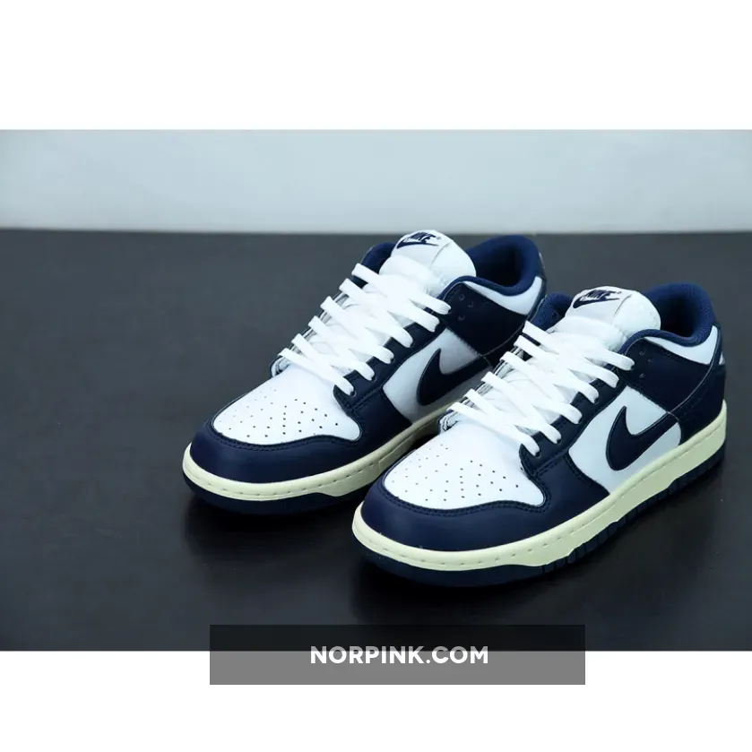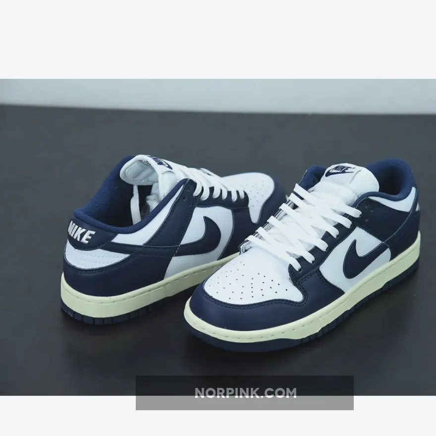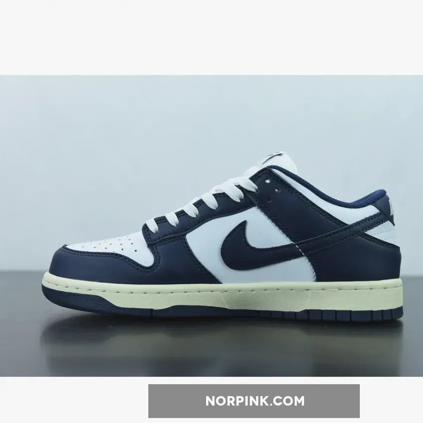 Old is Nike’s new “new.” You’ll definitely notice it on the Nike Dunk Low Navy White. This pair’s vintage-looking soles are not entirely new, though. Nike already did it with the “Be True to Your School” colourways.