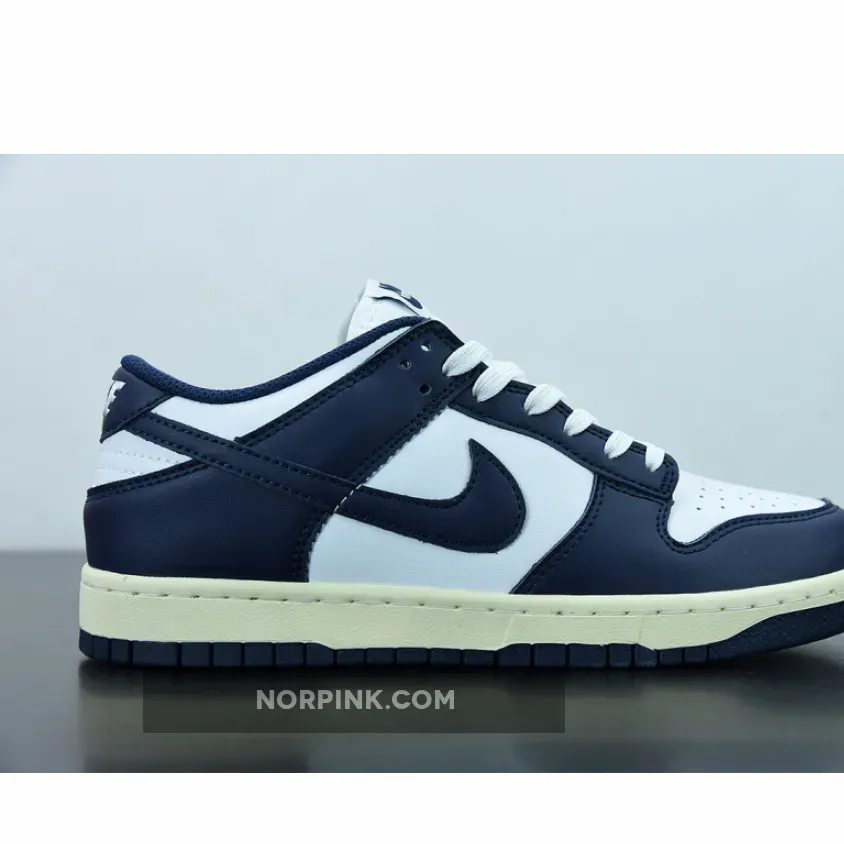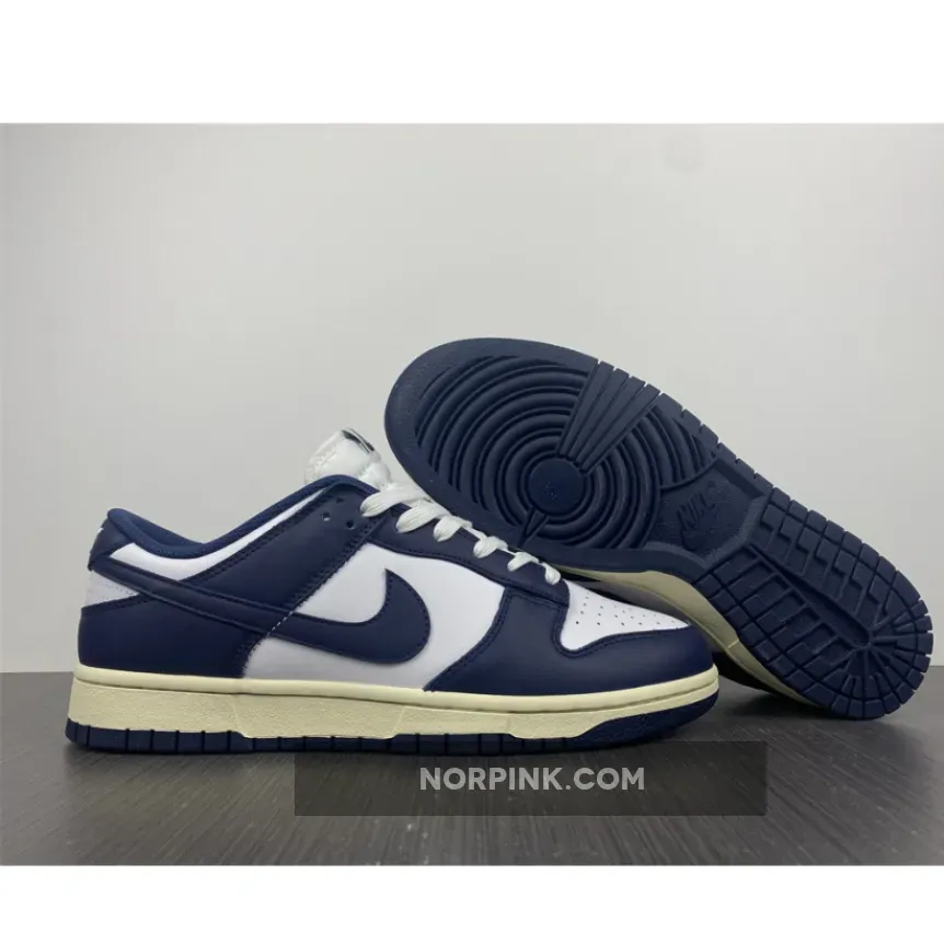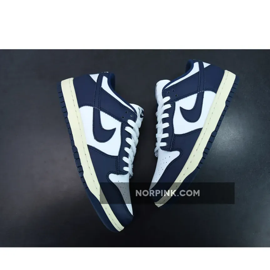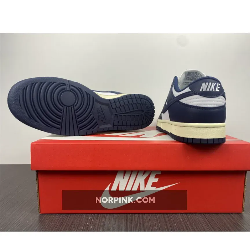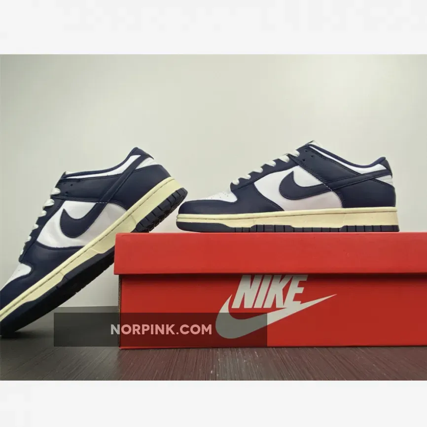 Old is Nike’s new “new.” You’ll definitely notice it on the Nike Dunk Low Navy White. This pair’s vintage-looking soles are not entirely new, though. Nike already did it with the “Be True to Your School” colourways.