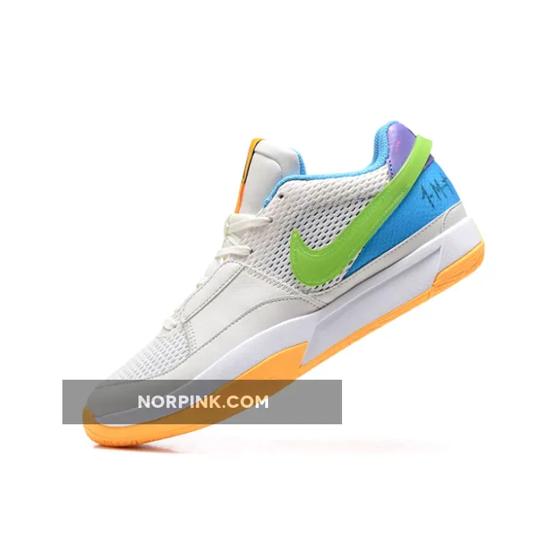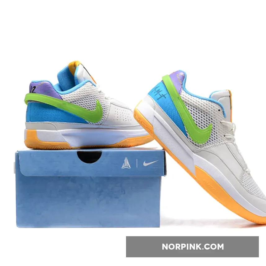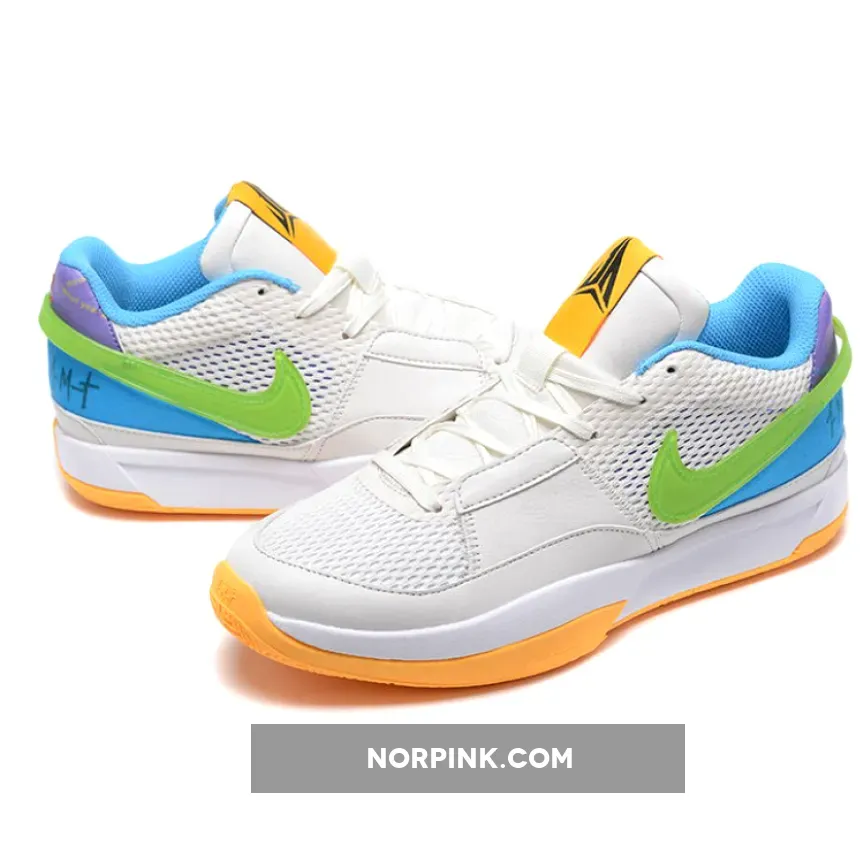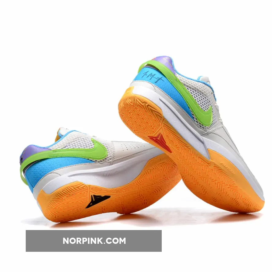 Primarily dressed in a tannish-white shade dubbed “phantom,” the silhouette features a Phantom, Action Green, Action Grape, White, Laser Orange, and University Blue color scheme.. This tonal phantom shade takes over the front half, toebox, mudguard, and eyestays included, while the tongue gets a split design featuring laser orange hits at the top and a black “JA” logo stamped in its center. More hits of phantom come on the lace set and the mesh along the quarter panel which revealed a purple base layer below. Accenting both of these colors, the Nike Swoosh comes in action green while the sockliner and bottom half of the heel take on a university blue color. On the top portion of the heel tab, a purple color dresses the leather while we see a series of questions about Ja written in a multicolor finish. This same question design makes it onto the insole which completes the upper. Rounding out the design is the Zoom Air-cushioned midsole which comes in white and a laser orange rubber outsole.