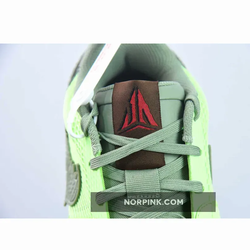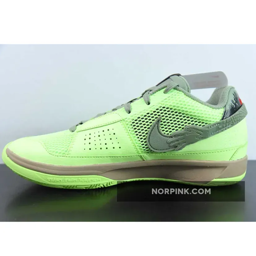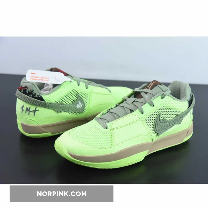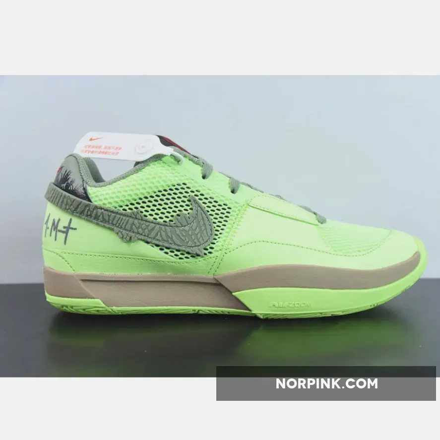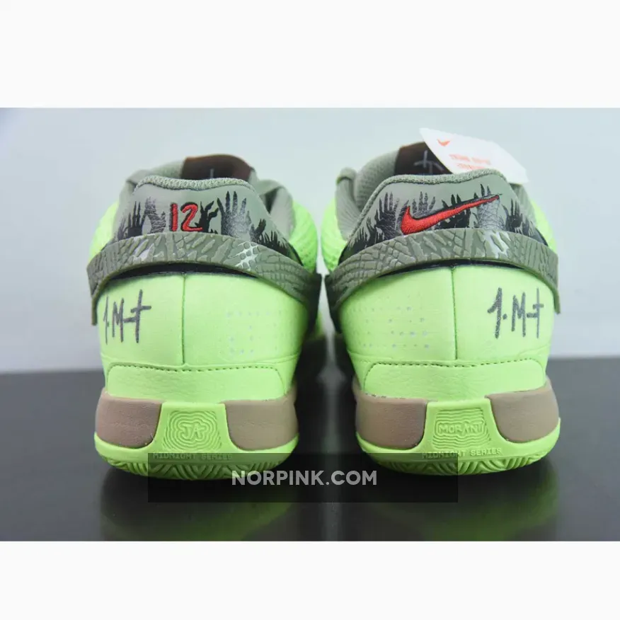 Its construction combines synthetic leather and mesh materials, resulting in a striking appearance. The Lime Blast upper is complemented by an Oil Green inner lining, tongue labels, and ankle collar. Morant’s signature logo on the tongue label takes on a mismatched arrangement that ostensibly references werewolves and vampire with their color scheme. Notably, the ankle collar and Swooshes feature zombie hands, adding to the eerie atmosphere. A subtle detail worth mentioning is the embroidered Red number “12” on the heels, reminiscent of blood.