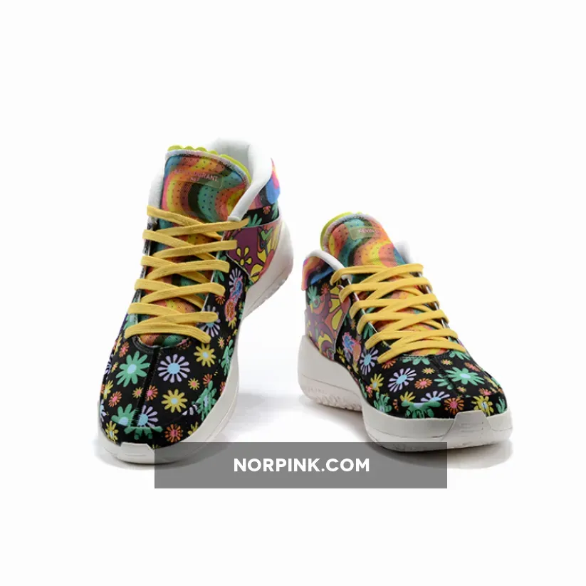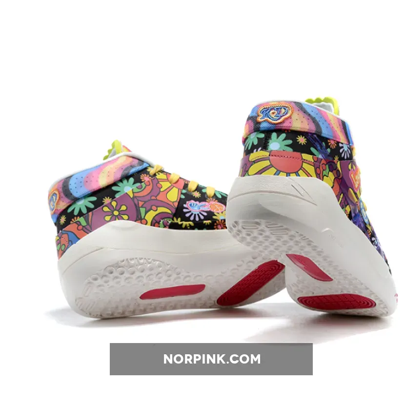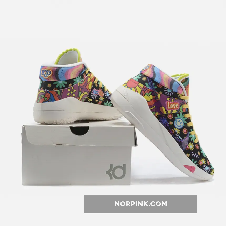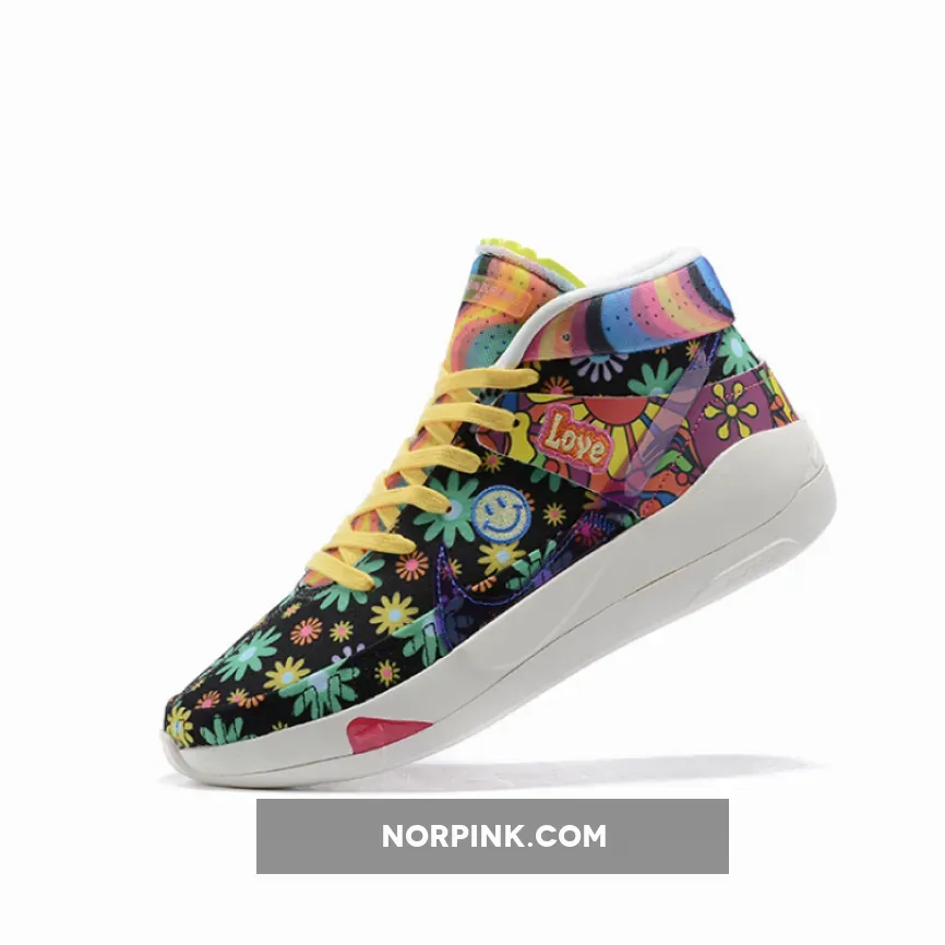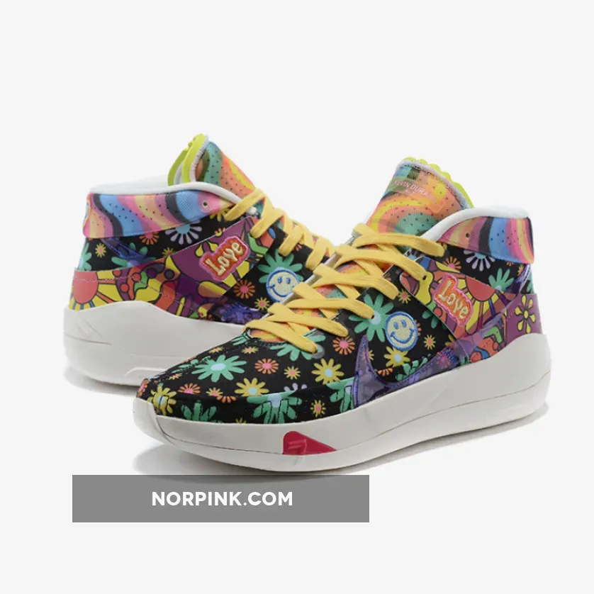 this Nike KD 13 comes with Black across the base while multicolor daisy florals are spread throughout which gives them a hippie vibe. Patches are seen throughout which includes peace signs and basketballs. Some of the other highlights includes a transparent Swoosh, ‘Love’ and smiley face patches. Finishing the look is a White rubber outsole.