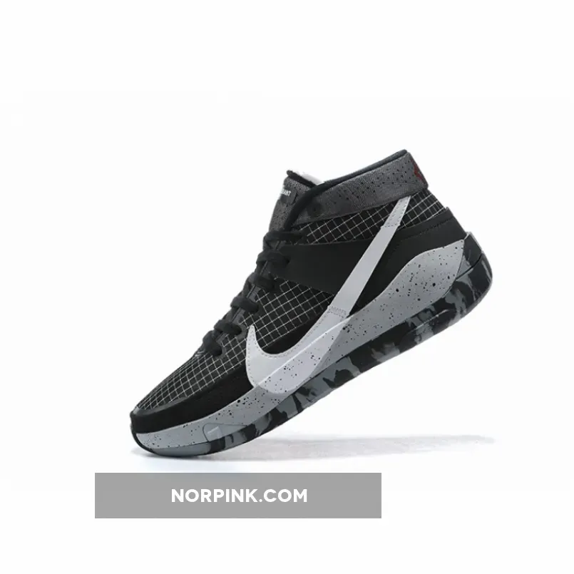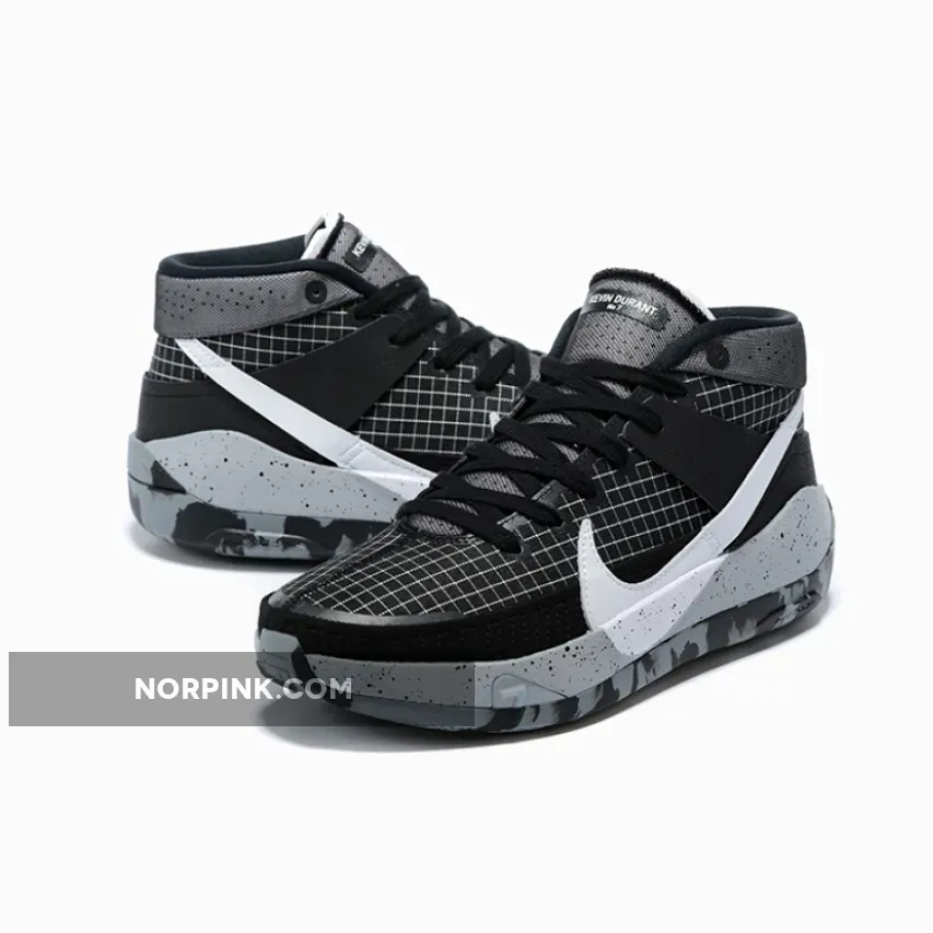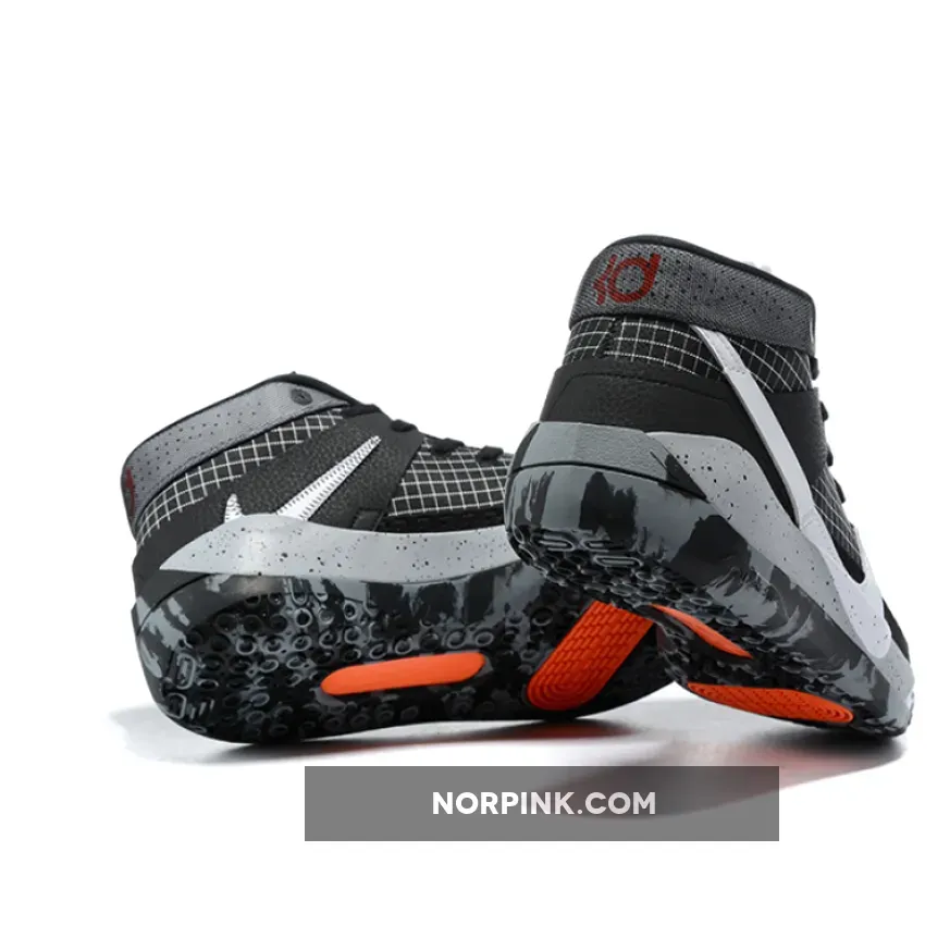 this Nike KD 13 features Black across the base while highlighted with a grid pattern. Following we have White on the leather Swoosh logos across the sides, Orange lands on the heel branding, insoles and outsole. Combining Black and Grey on the midsole which has an Ore theme while a camouflage like outsole finishes the look.