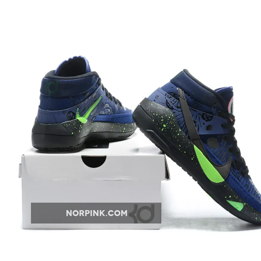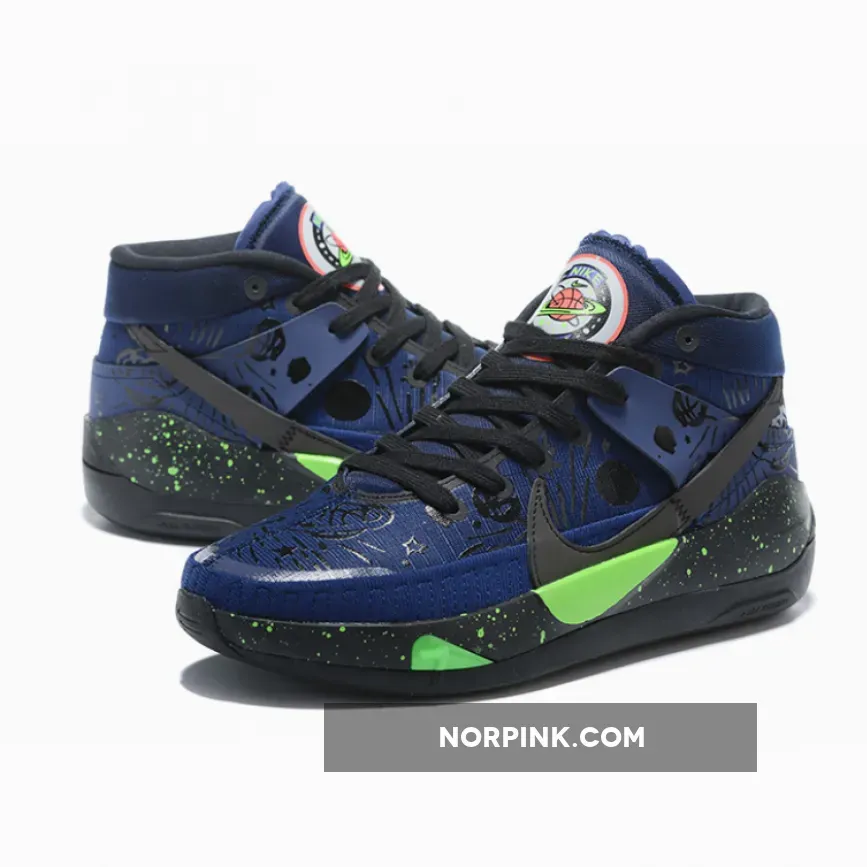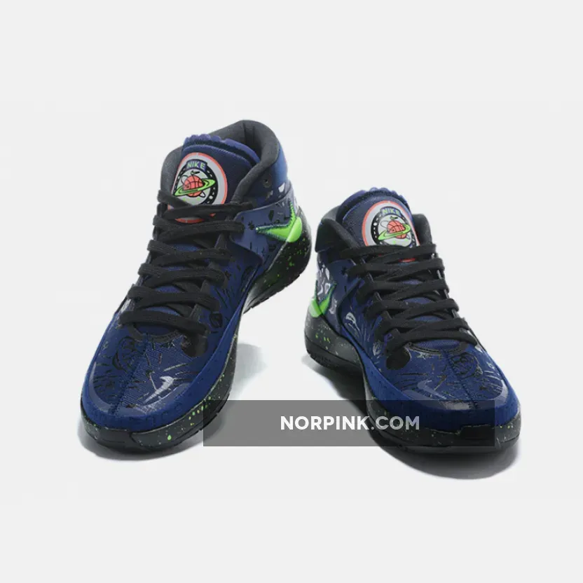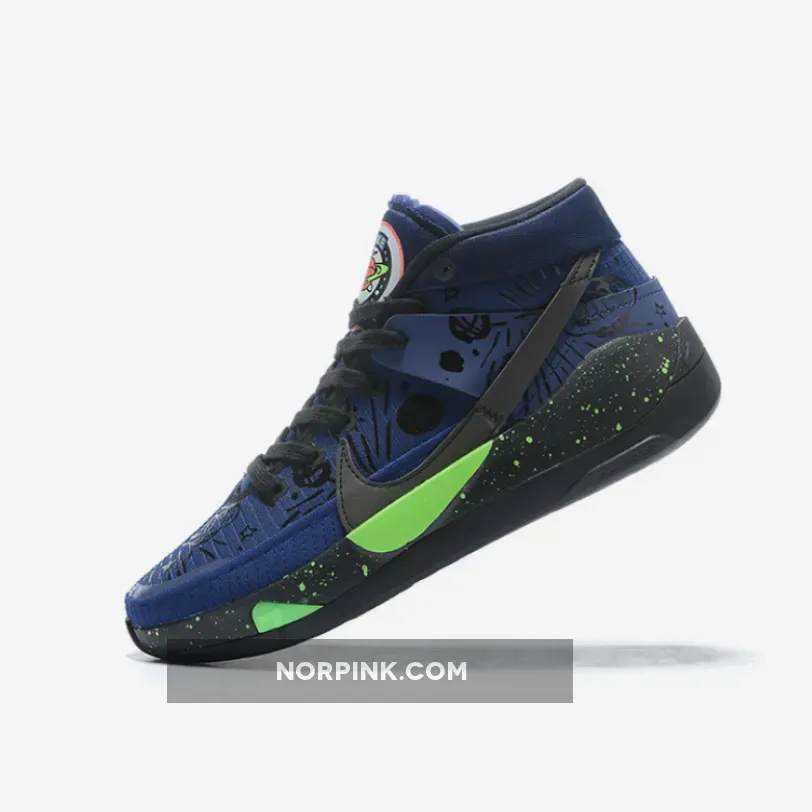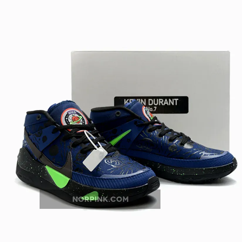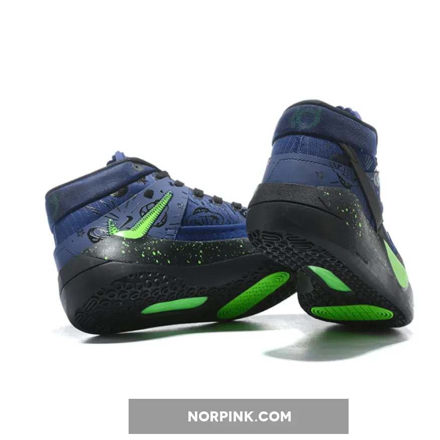 this pair features Blue throughout the upper while using an intergalactic theme. Following we have subtle graphics throughout which furthers the theme between space and basketball. Following we have Neon Green on part of the midsole, insoles and KD branding on the heel. Other details includes ‘Just Do It’ patches on the tongue while Black runs across the Air Zoom midsole with Neon speckled detailing.