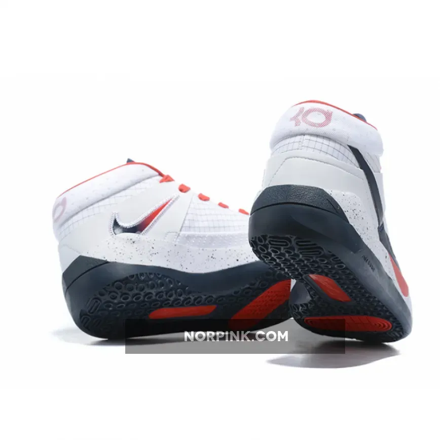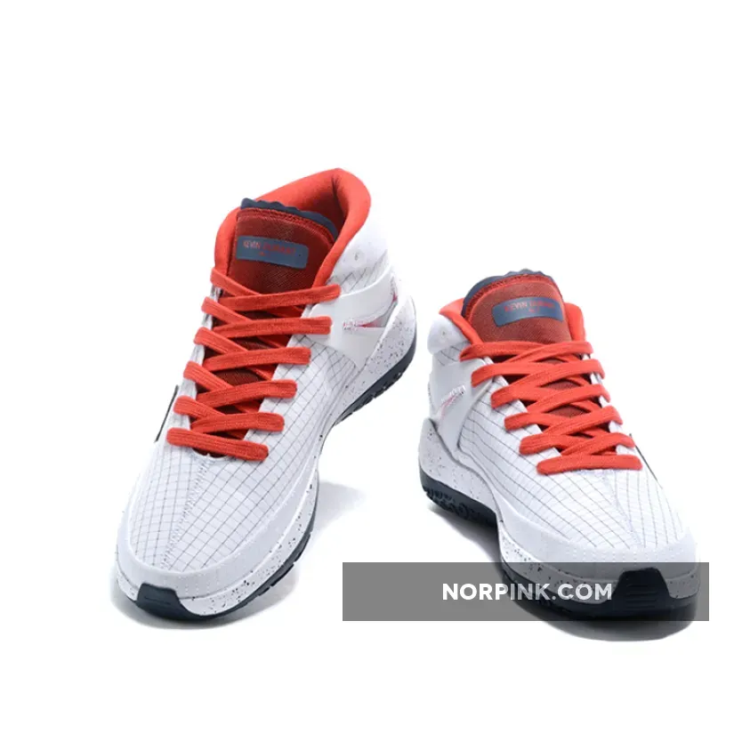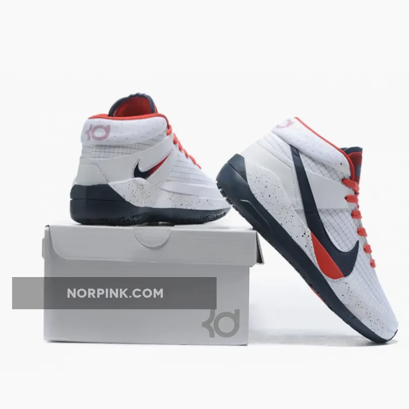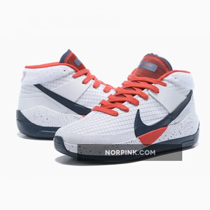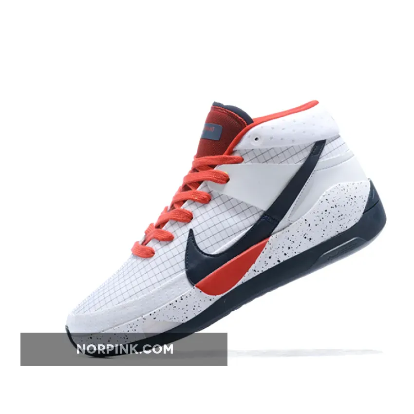 this Nike KD 13 comes with White across the upper along with a grid pattern. Following we have Red on the tongue, liner, laces, KD logo on the heel and outsole. In addition we have Navy leather on the lateral side with a gradient stitched Swoosh logon the medial. Other details includes a speckled midsole and a Navy rubber outsole.