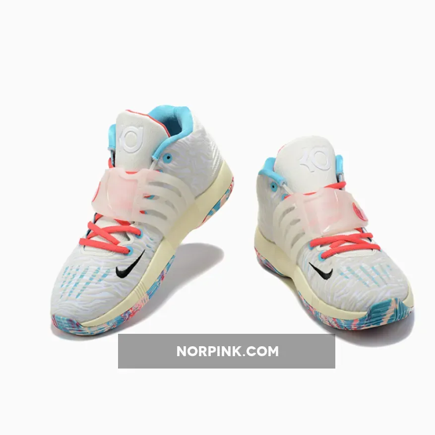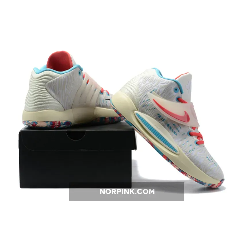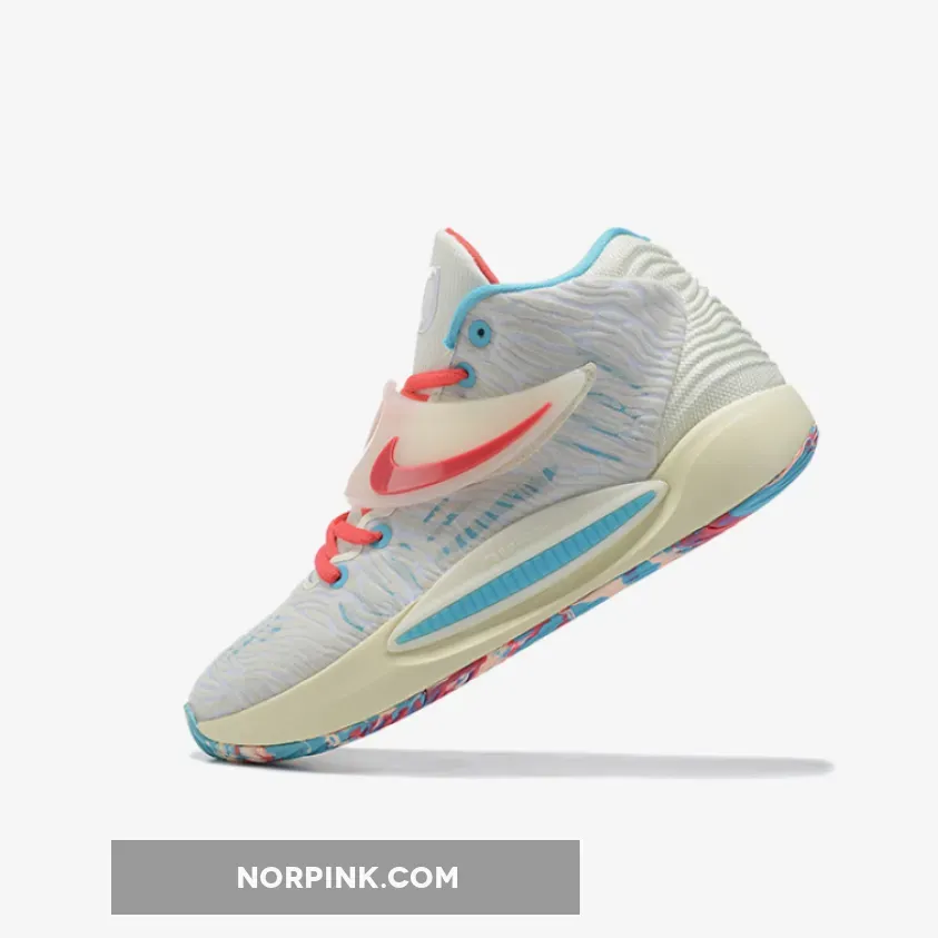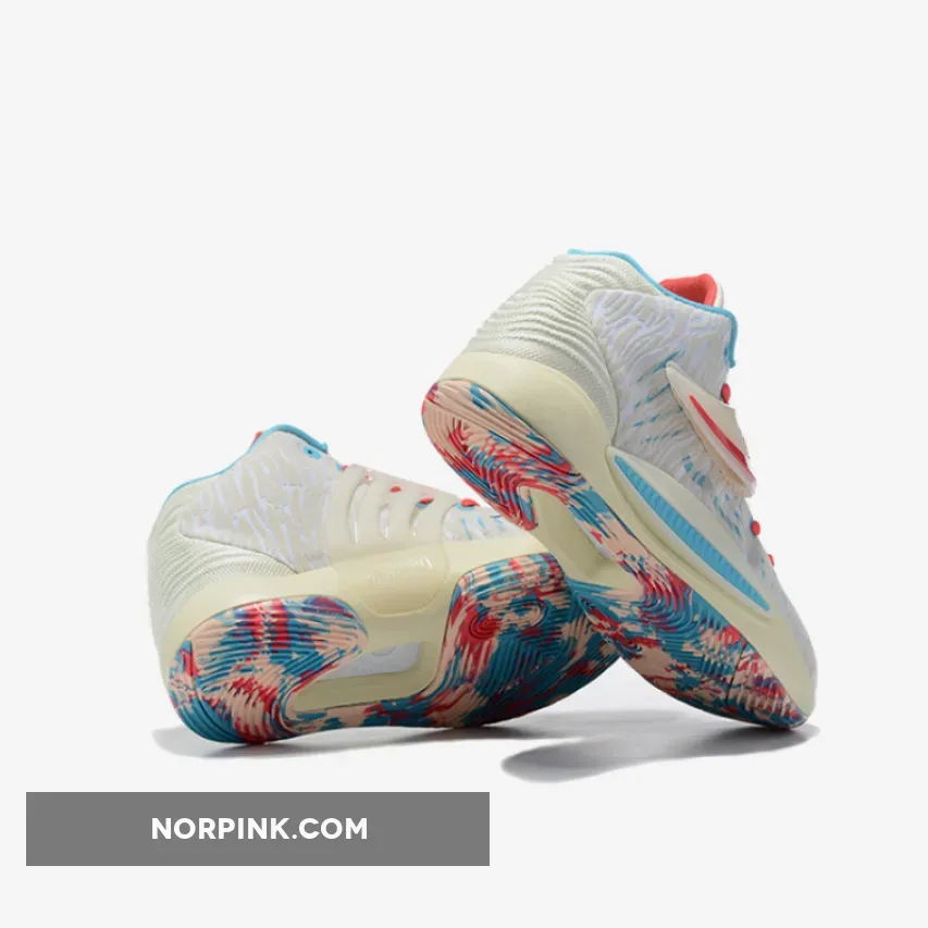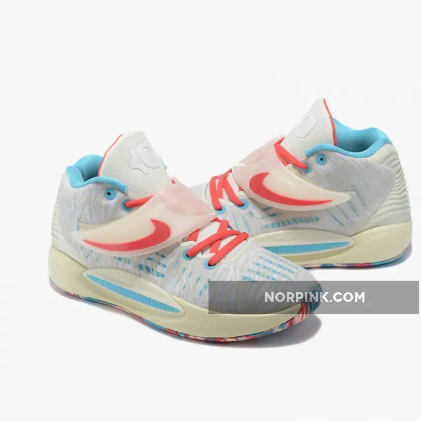 This Nike KD 14 comes constructed with a mixture of materials, including textile Sail across the base while accents of Aqua Blue and Red are spread throughout. Next, we have a translucent mid-foot strap along with Sail on the midsole.