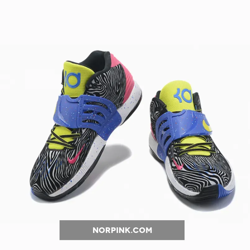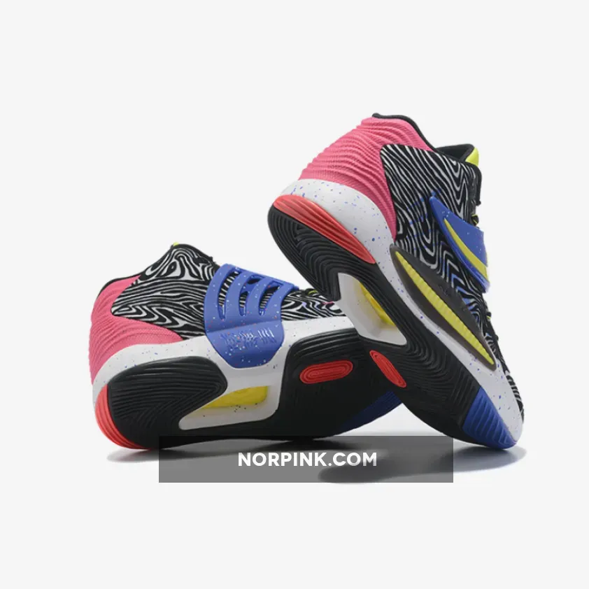 This Nike KD 14 features a Black, Fusion Red, White, and Yellow Strike color combination. Highlighted with a mixture of materials with textile on the base. Next, we have accents of Blue, Yellow, and Red throughout while the mid-foot strap has a speckled finish.
