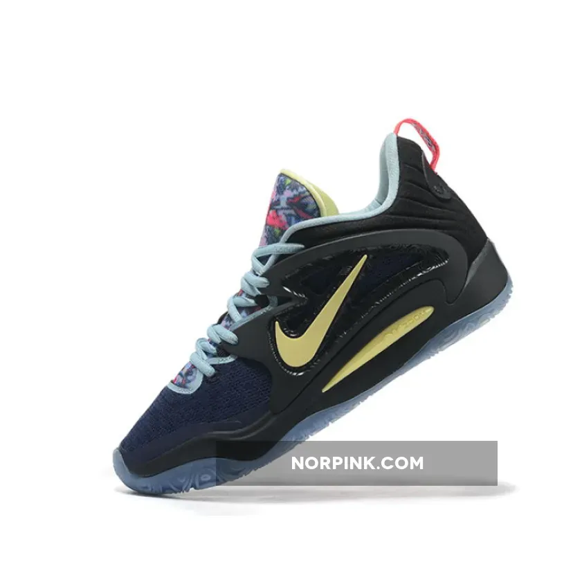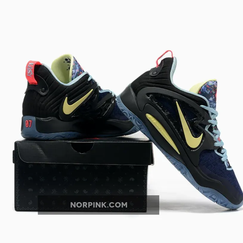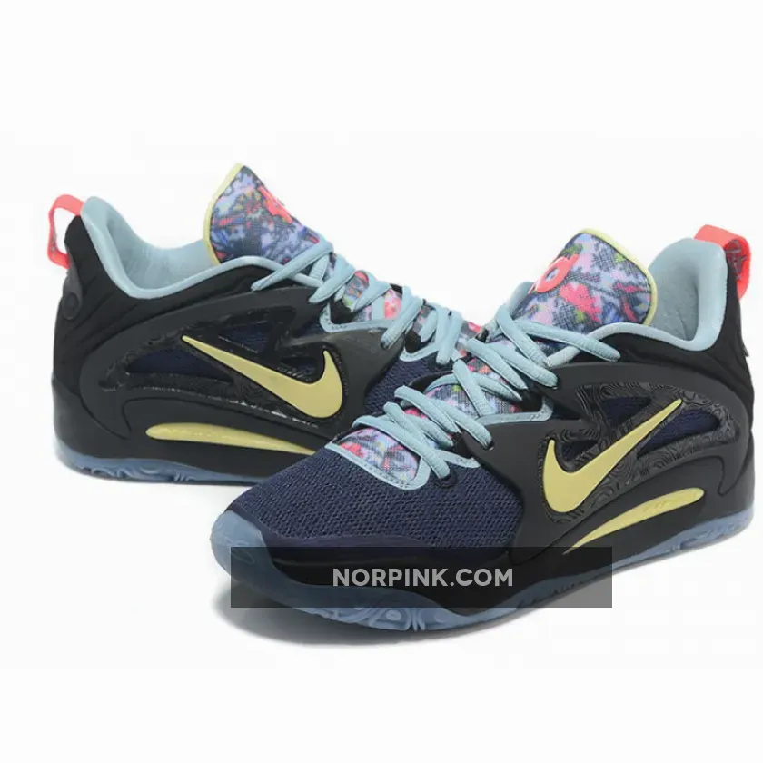 The Nike KD 15 has a color combination of black, sand drift, aura, and boarder blue. The shoe’s upper portion has a black and navy multilayered mesh with floating TPU wings that integrate into the lacing system for a locked-in fit. The sneaker has a molded yellow Nike Swoosh branding, “Easy”-inscribed heel tabs, and a vibrant pink Kevin Durant (KD) logo atop a graphic-print tongue. A full-length Zoom Strobel features on the black midsole with a multidirectional navy outsole.