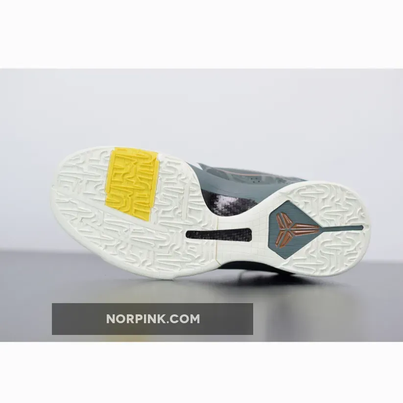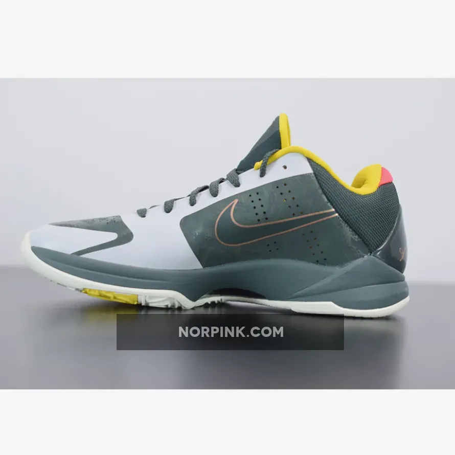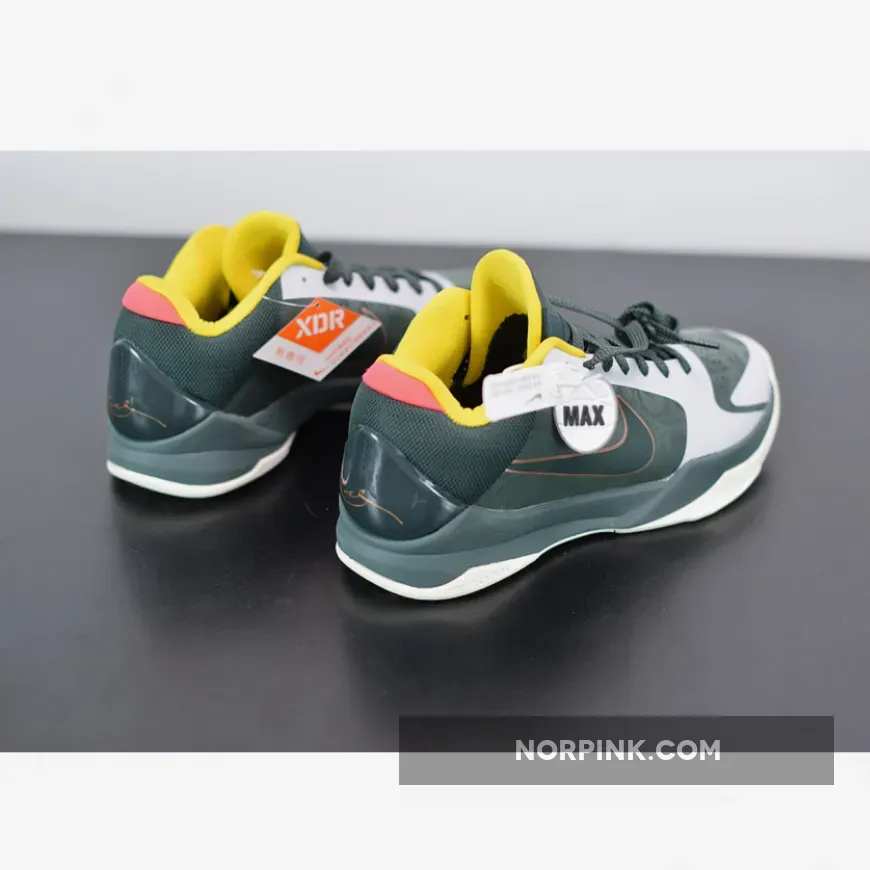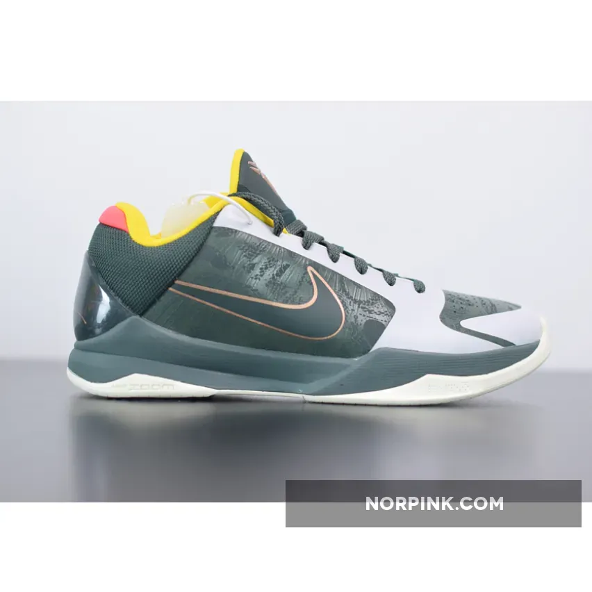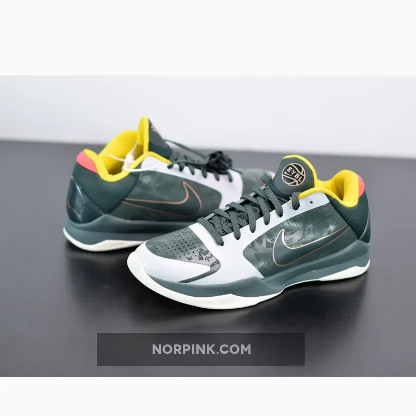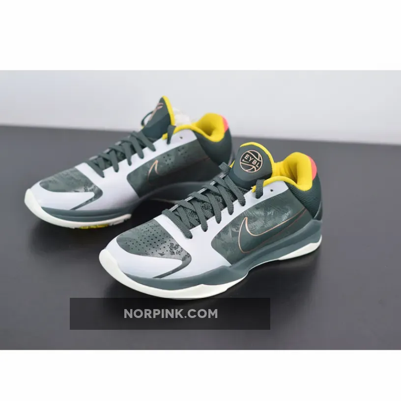 Dressed in a Forest Green, Metallic Red Bronze, and Speed Yellow color scheme. This Nike Kobe 5 Protro features an upper mostly covered in Dark Green with Bronze Swooshes on the sides and branding tongues with the EYBL logo appearing on the left. Yellow lining, Peach heels, graphic insoles atop a White sole completes the design.