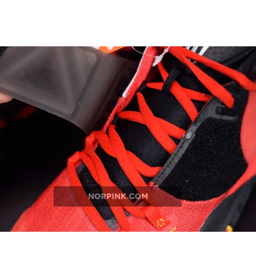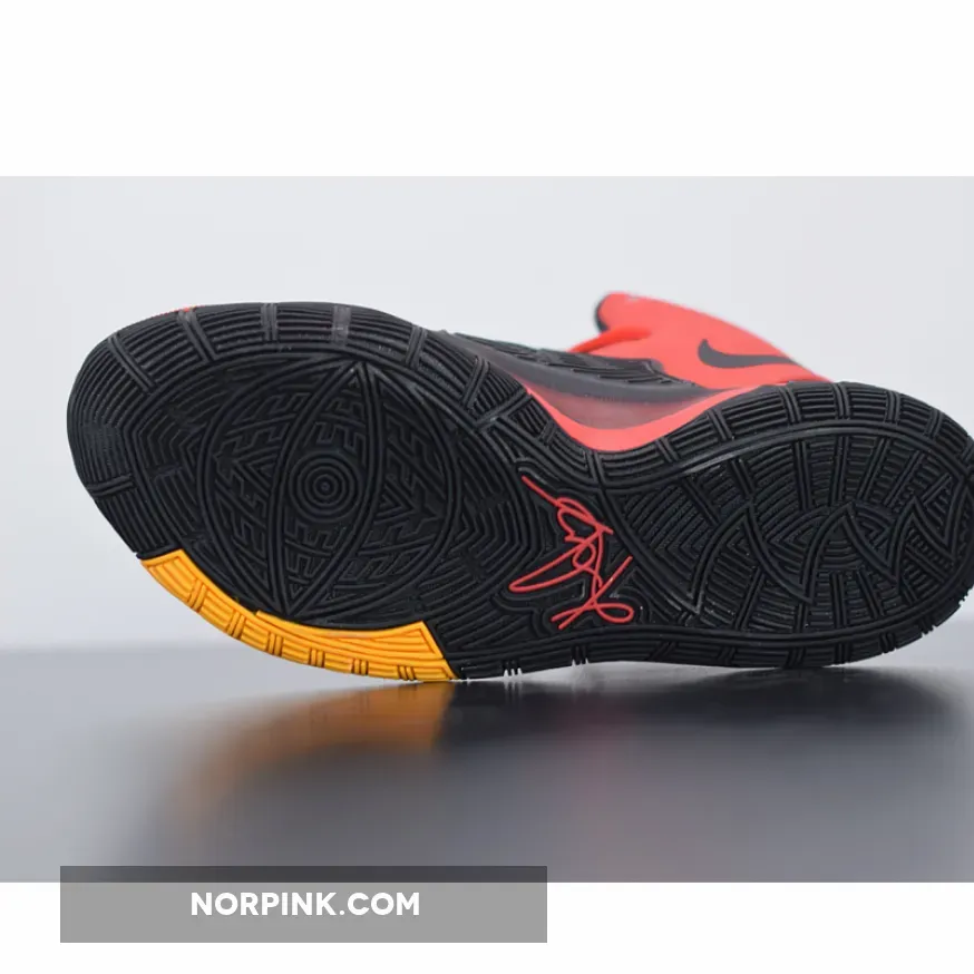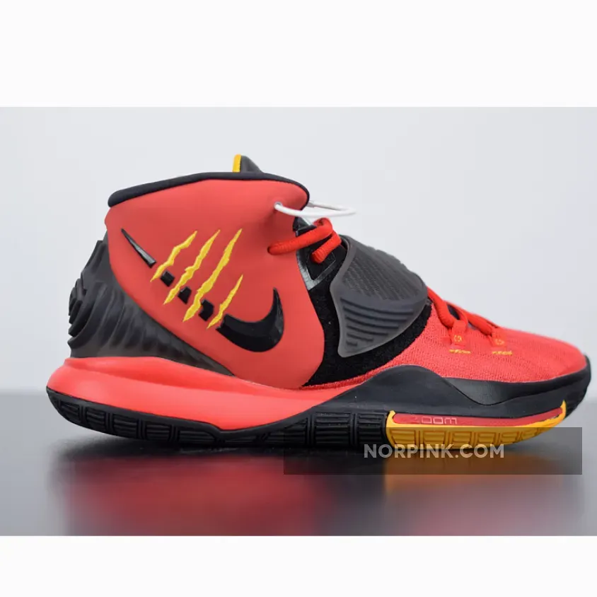 The Kyrie 6 follows its predecessor with an all-red upper with black and gold accents, including the signature scratch marks. The shoe also combines both Kobe’s and Kyrie’s signature logos on the tongue for a touching detail.