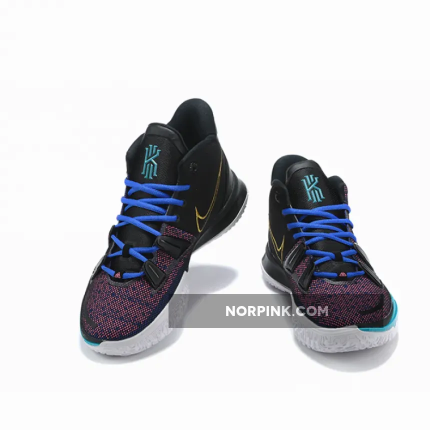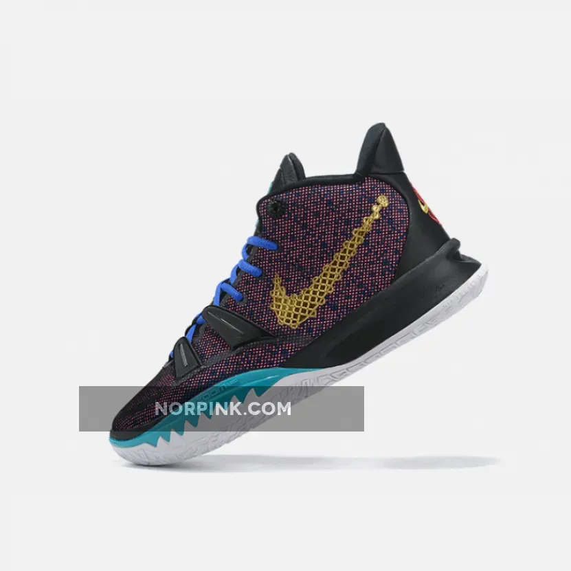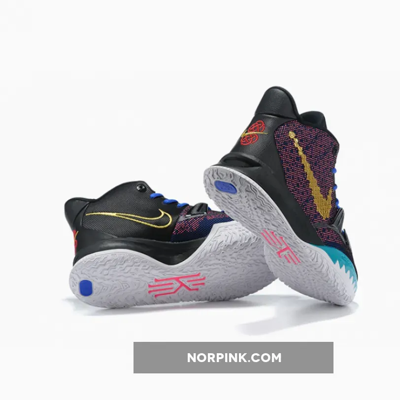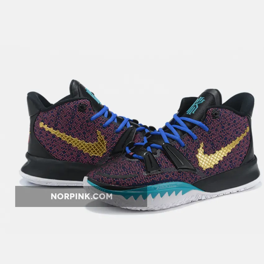 This offering of the Nike Kyrie 7 features a Pink printed upper paired with Blue laces and Teal tongue branding and lateral forefoot overlays on the White midsole. Highlighting the shoe is a Gold sculpted ornate-like Swoosh logo on the lateral with embroidery branding appearing on the heels. A White rubber sole with a bold Red Kyrie logo completes the design.