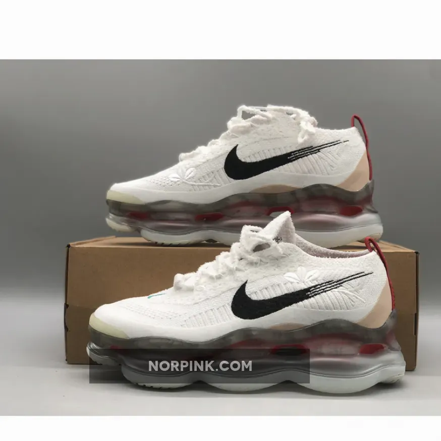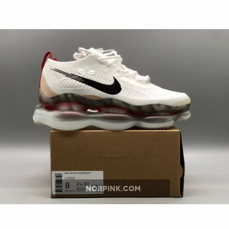 This offering of the Nike Air Max Scorpion features a White Flyknit upper with a Black stitched Swooshes and embroidered detailing on the sides.. The theme’s custom tongue design reappears with “Leap High” text joined by Nike branding. Pivoting to the sneaker’s eye-catching sole unit, a white and black marbled effect hits the uppermost layer while the full-length Air midsole is supported by a translucent rubber outsole. A red commonly used in CNY celebrations outfits the sockliner and heel tab while also accenting the midsole, completing the look alongside optional furry laces.