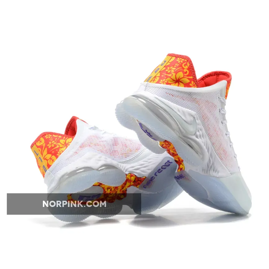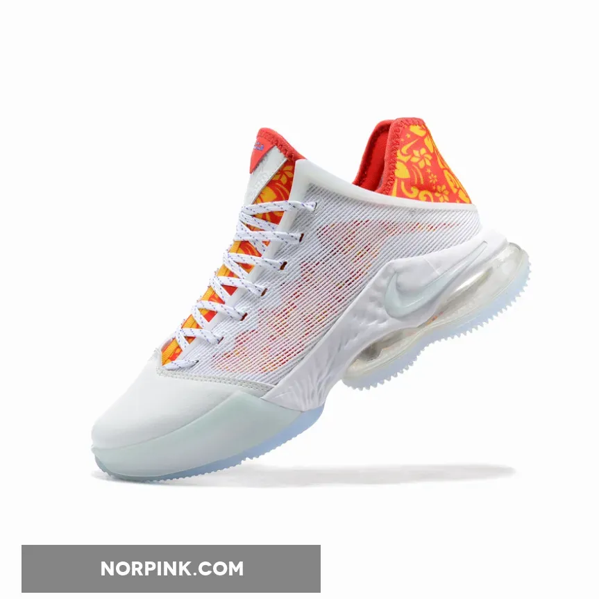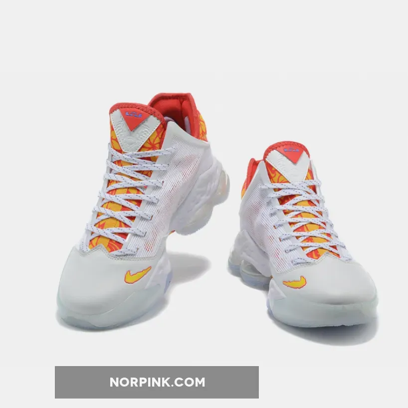 The Nike Lebron 19 Low Magic Fruity Pebbles upper is constructed from milky white leather and mesh combo, with a flaky red and yellow print on the collar and inner sleeve. The sneaker is set atop a clear Max Air unit that turns purple when exposed to light. Additional details include a Magic Fruity Pebbles embroidery on the inner side of the left tongue and sockliners featuring Fred Flintstone and a cartoon Lebron.