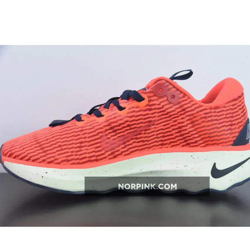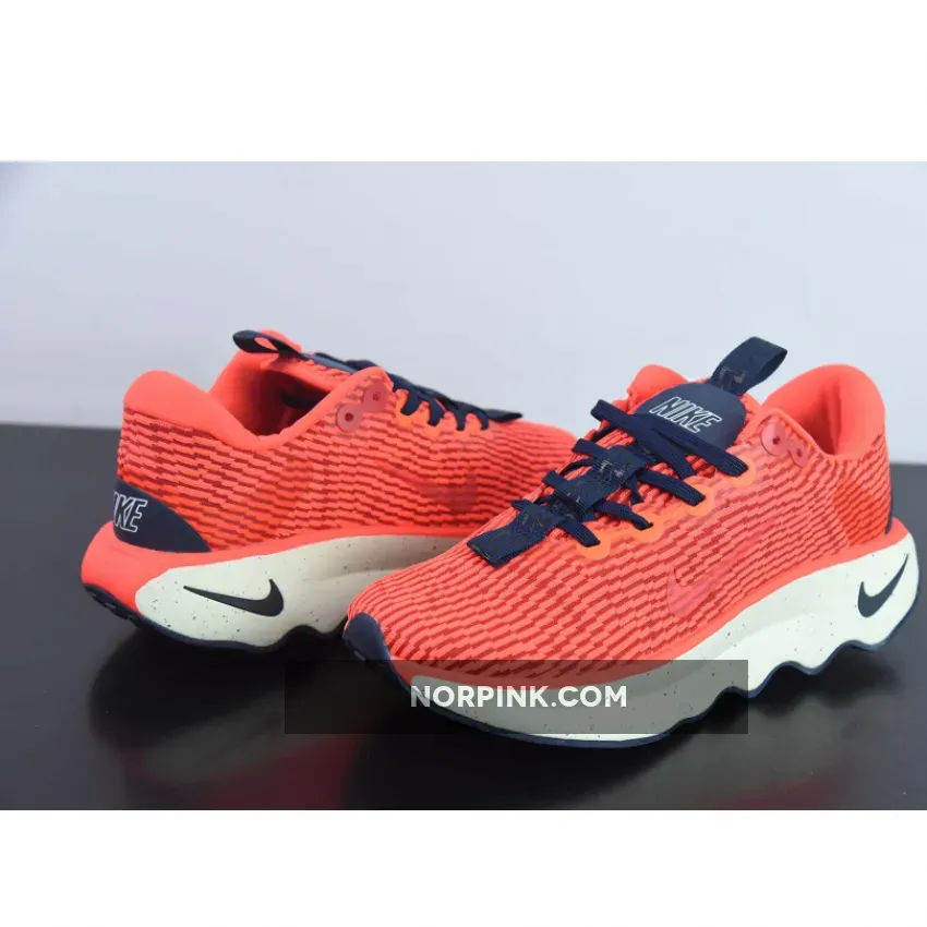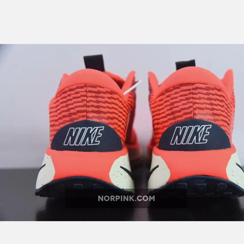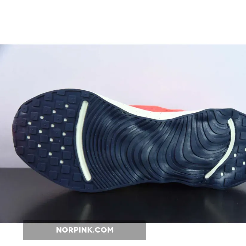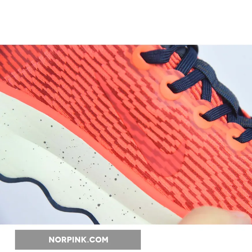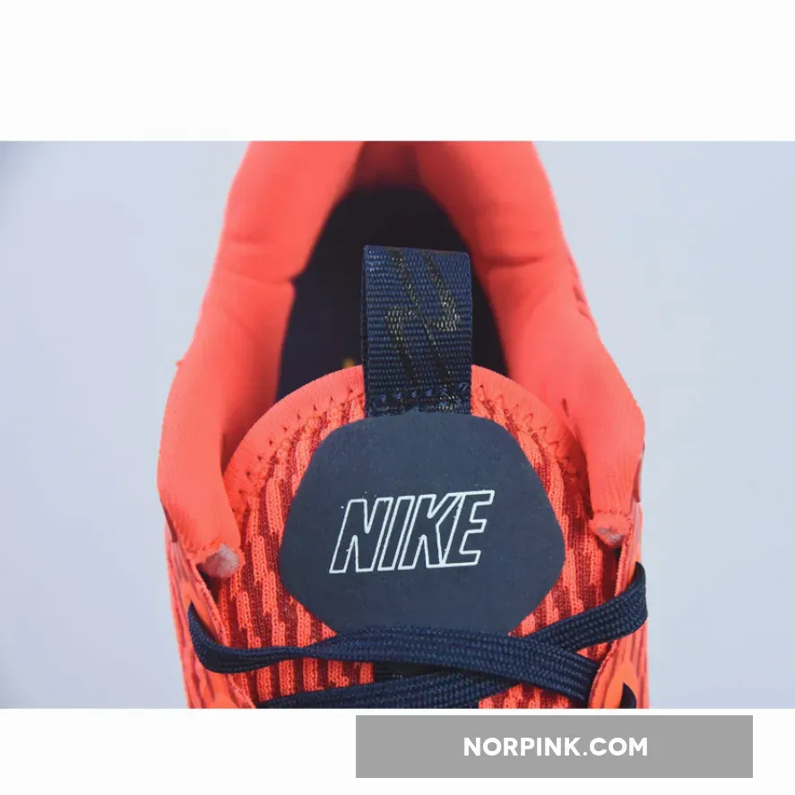 This colourway features a vibrant orange lightweight mesh upper with navy accents on the laces, midsole Swoosh, and heel counter. Speckles on the foam midsole bring more details to the shoe. Waffle traction patterns on the front and back with wavy patterns on the midfoot complete the rocker outsole.