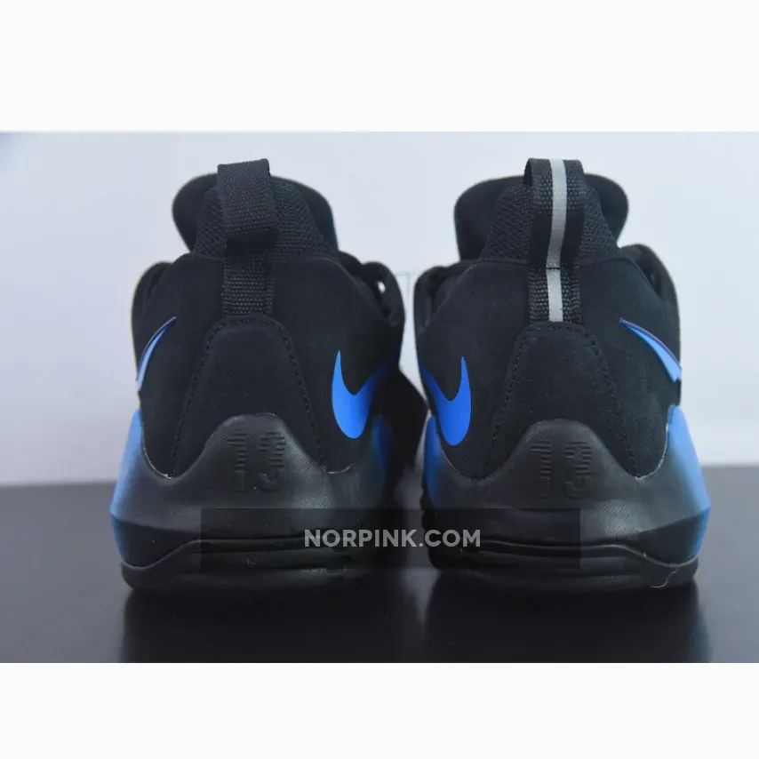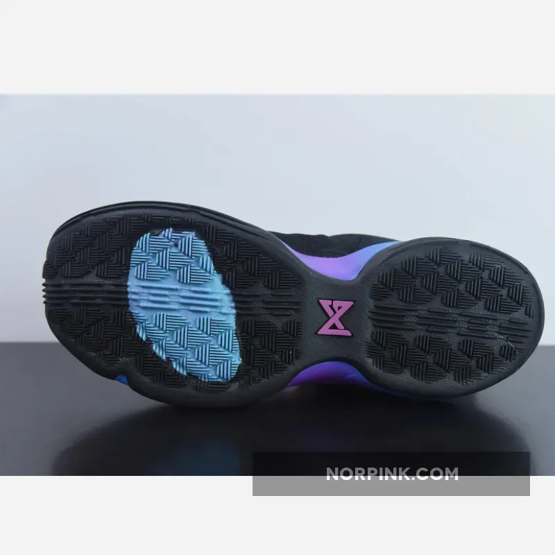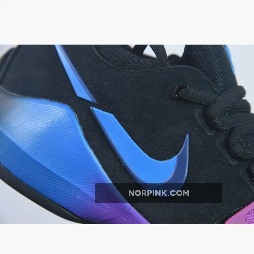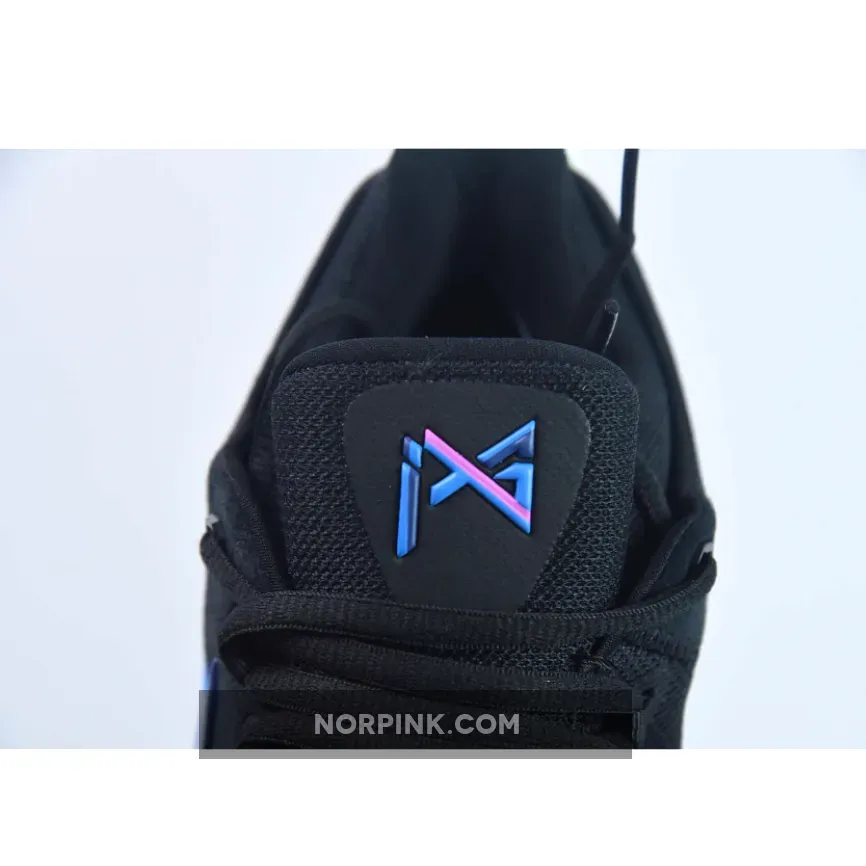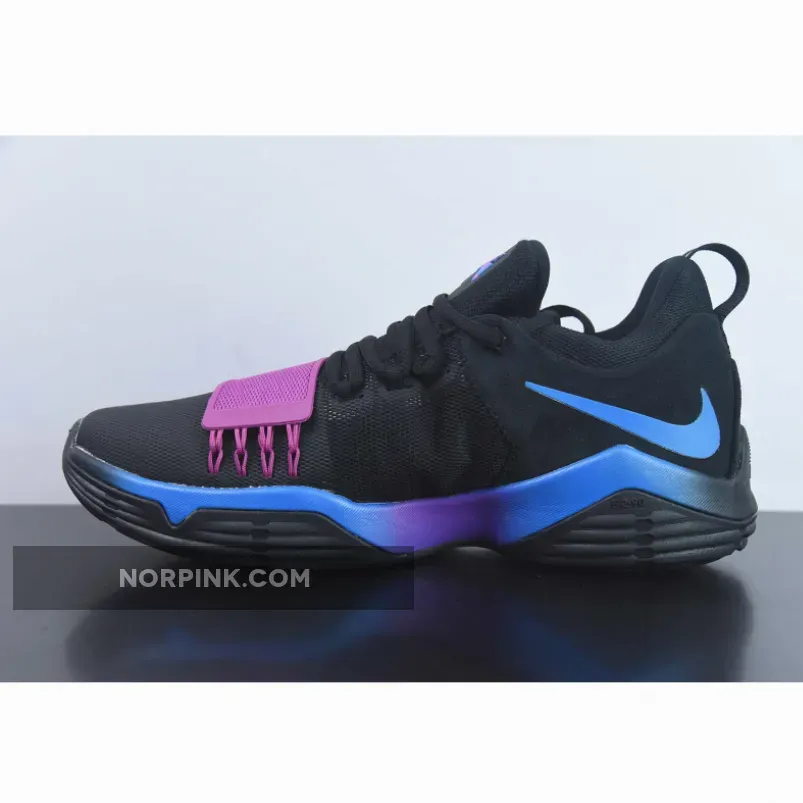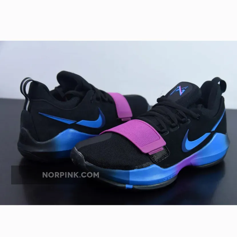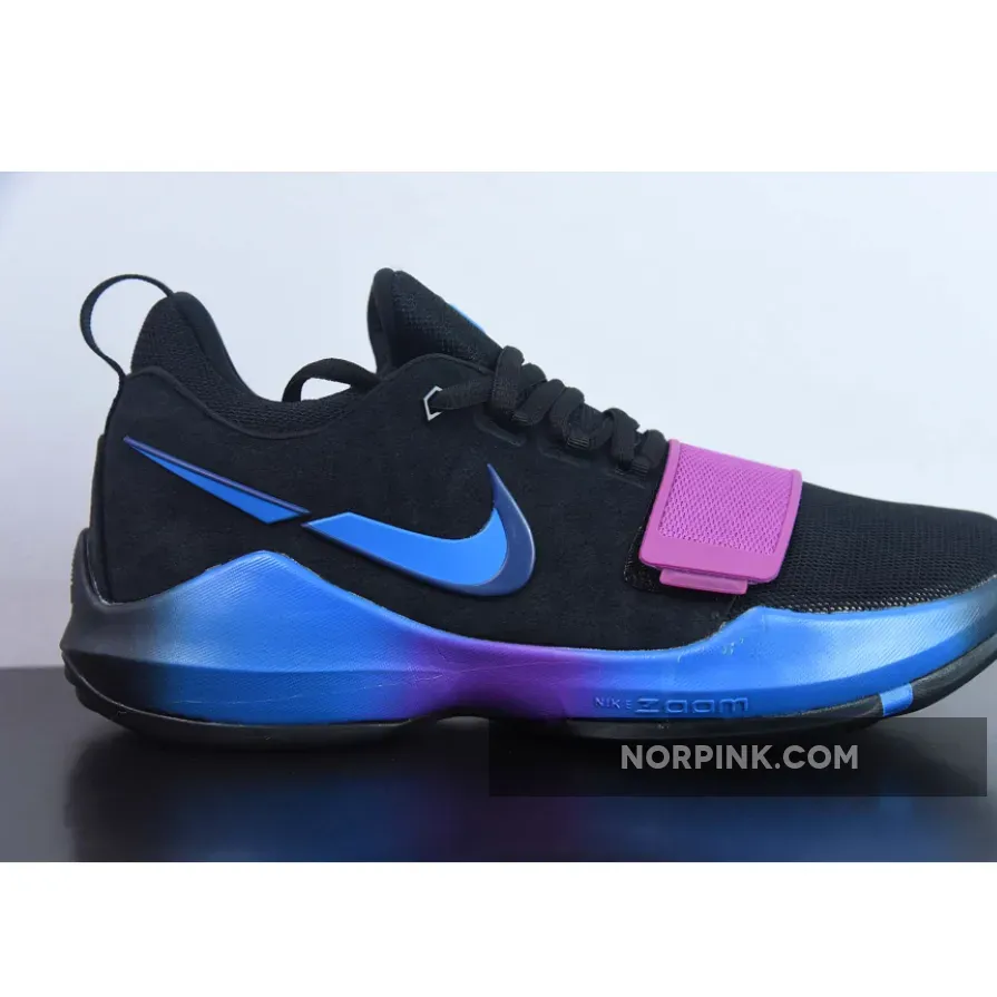 This PG 1 features a predominantly Black upper with shades of blue and purple on the gradient midsole, midfoot strap, tongue logo, and the broken Swoosh logo.