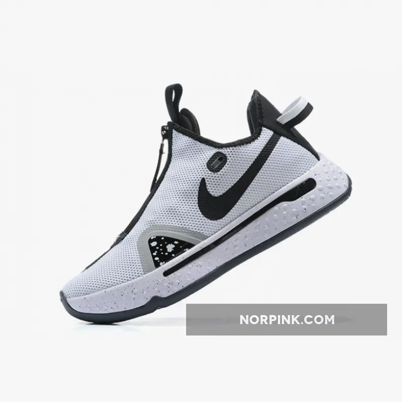 Dressed in a White, Black, and Pure Platinum color scheme. This Nike PG 4 sports has a yin-yang theme with White covering the lateral side and Black on the medial.