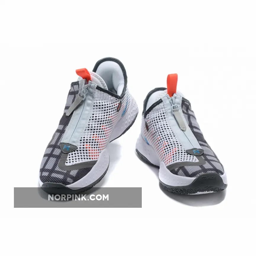 Dressed in a Football Grey, Laser Blue, and Light Smoke Grey color scheme. This PG 4 features a Grey plaid upper contrasted with White on the medial mesh side panel, Orange covering the pull tabs and lockdown cables as well as Blue Swooshes on the sides. A White foam midsole atop a dark and light Grey rubber outsole completes the design.