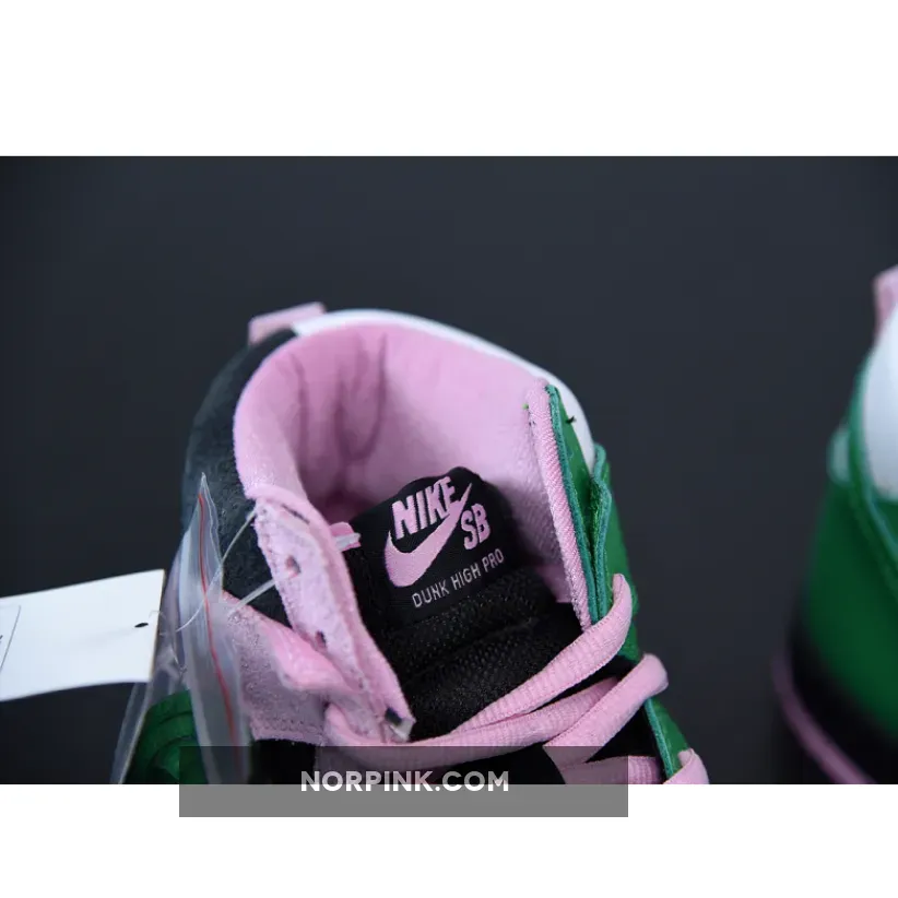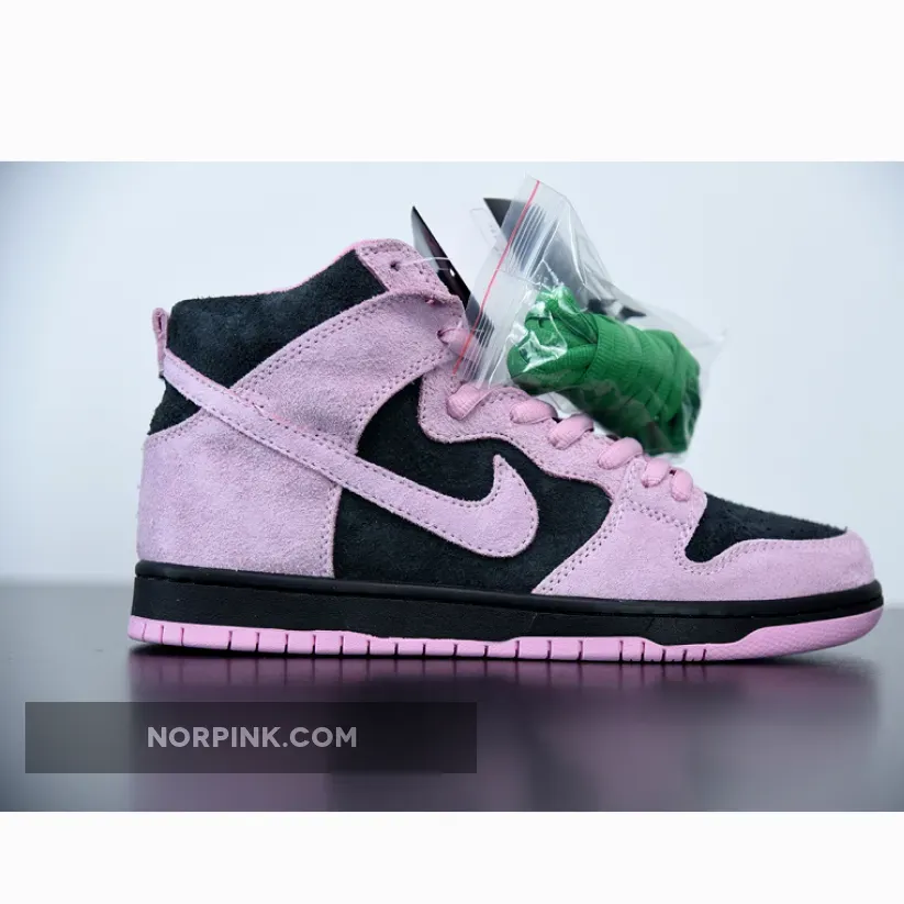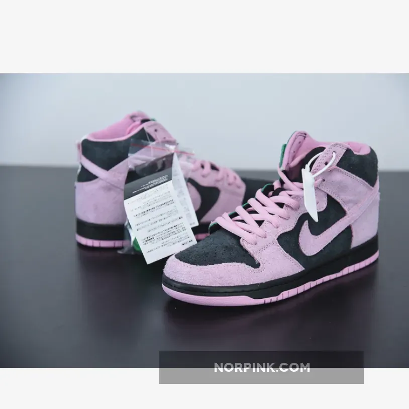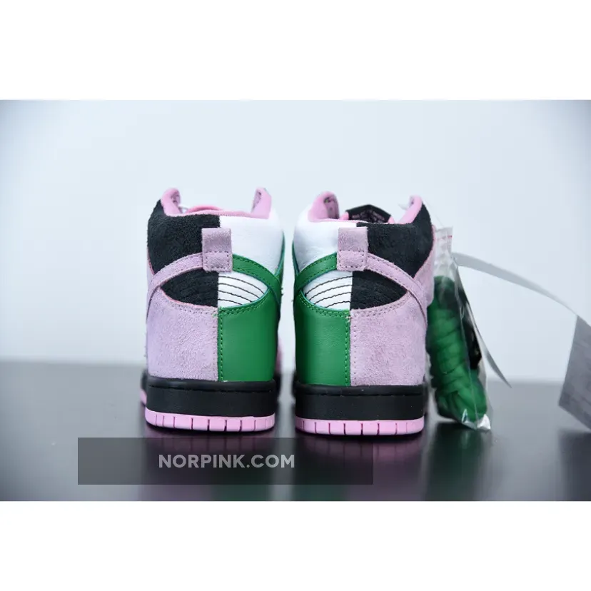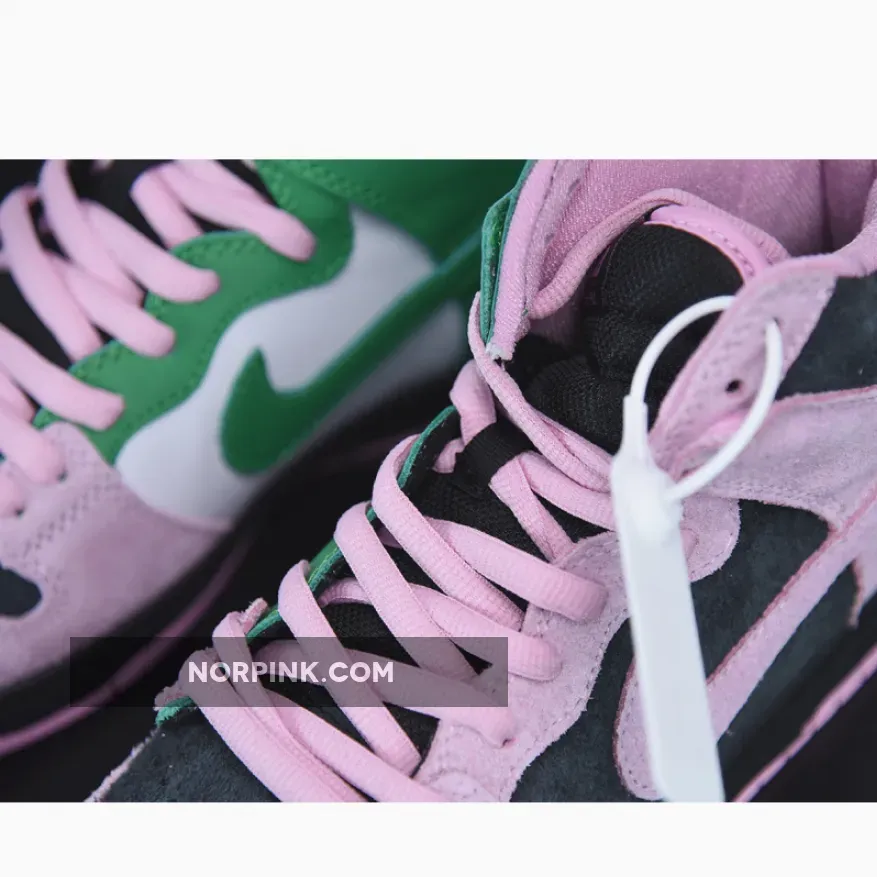 this Nike SB Dunk High comes dressed in a Black, Pink Rise and Lucky Green color combination. Pink and Black suede lands on the lateral side and toe box while Celtics’ Green and White leather lands on the medial side. When you take a picture with your camera or phone and invert the colors, you will see the colors flipped.