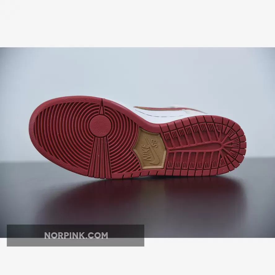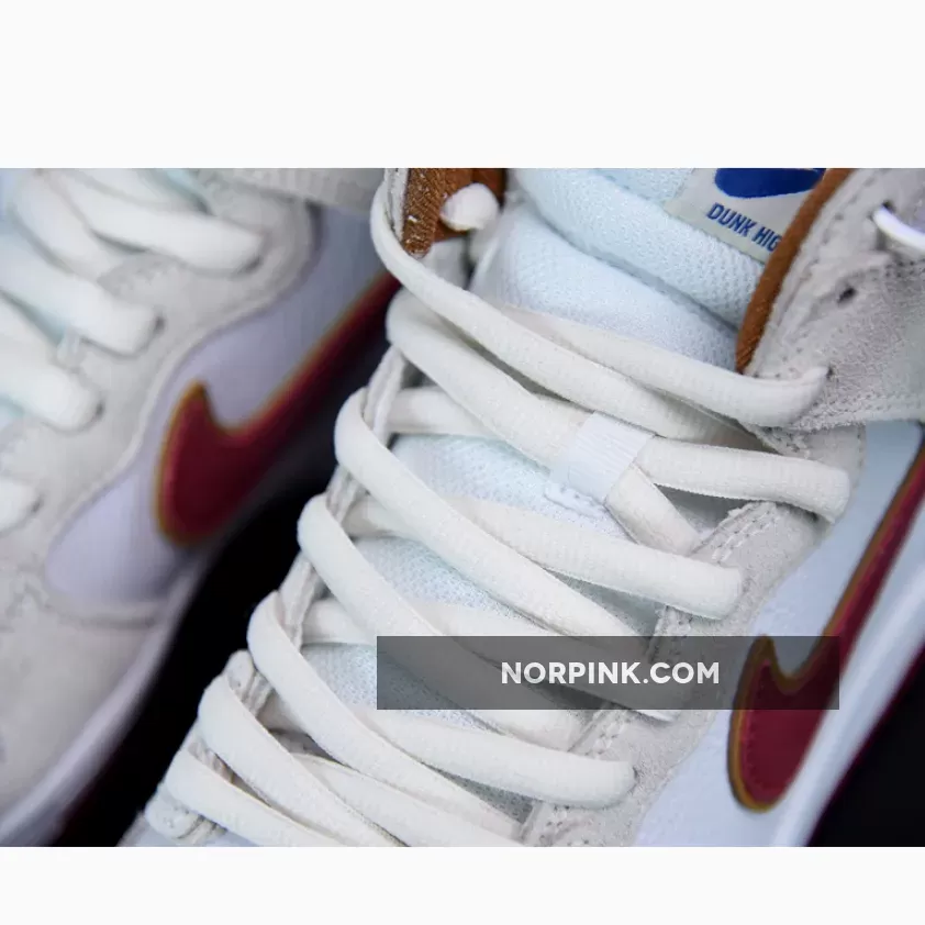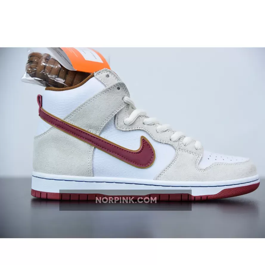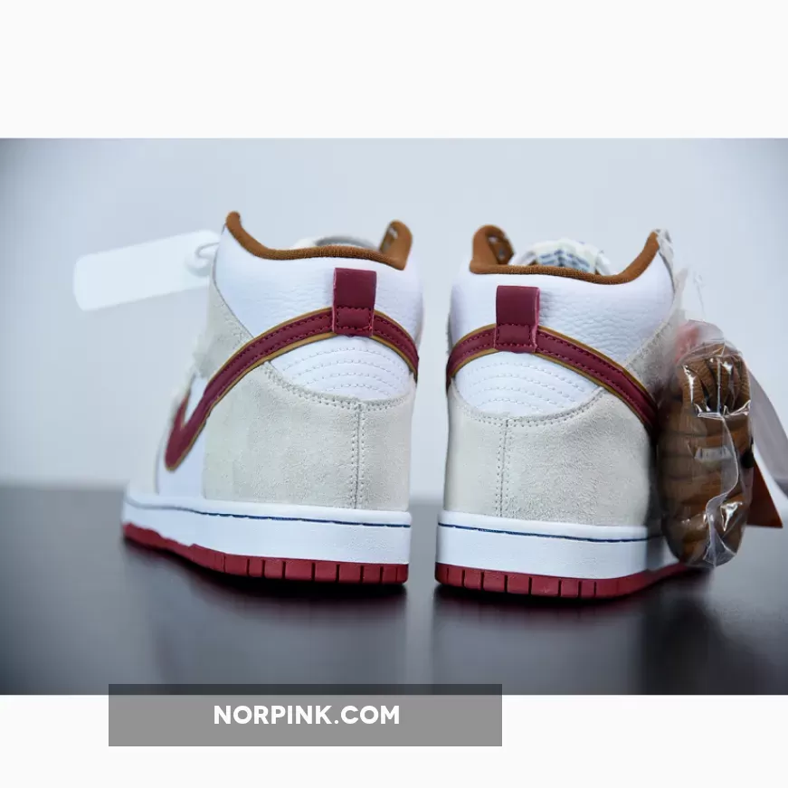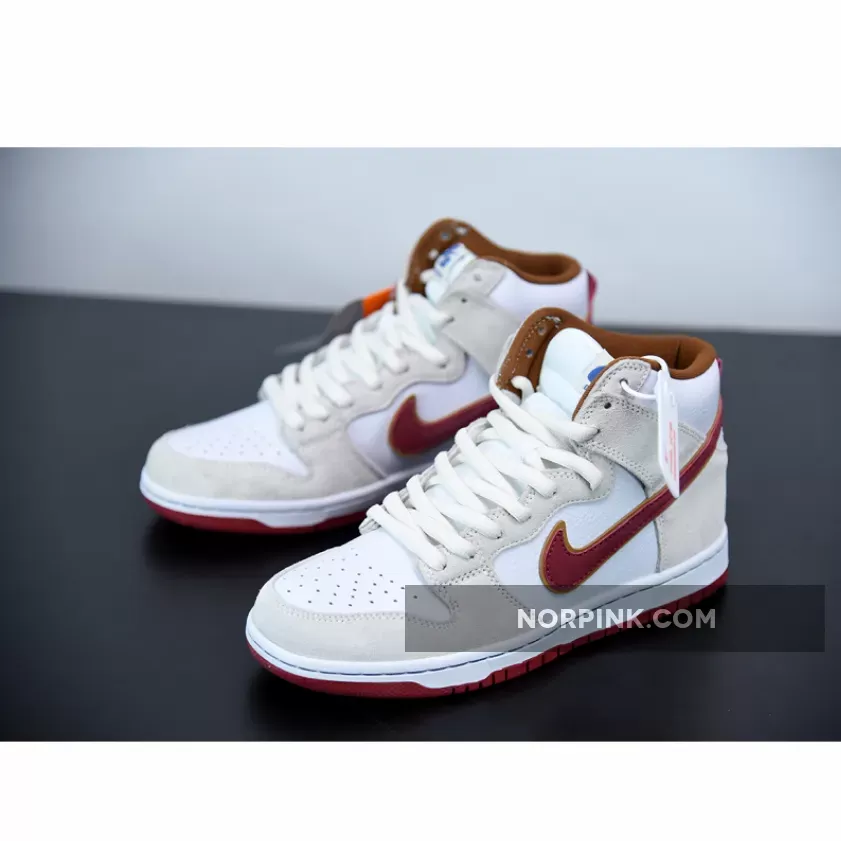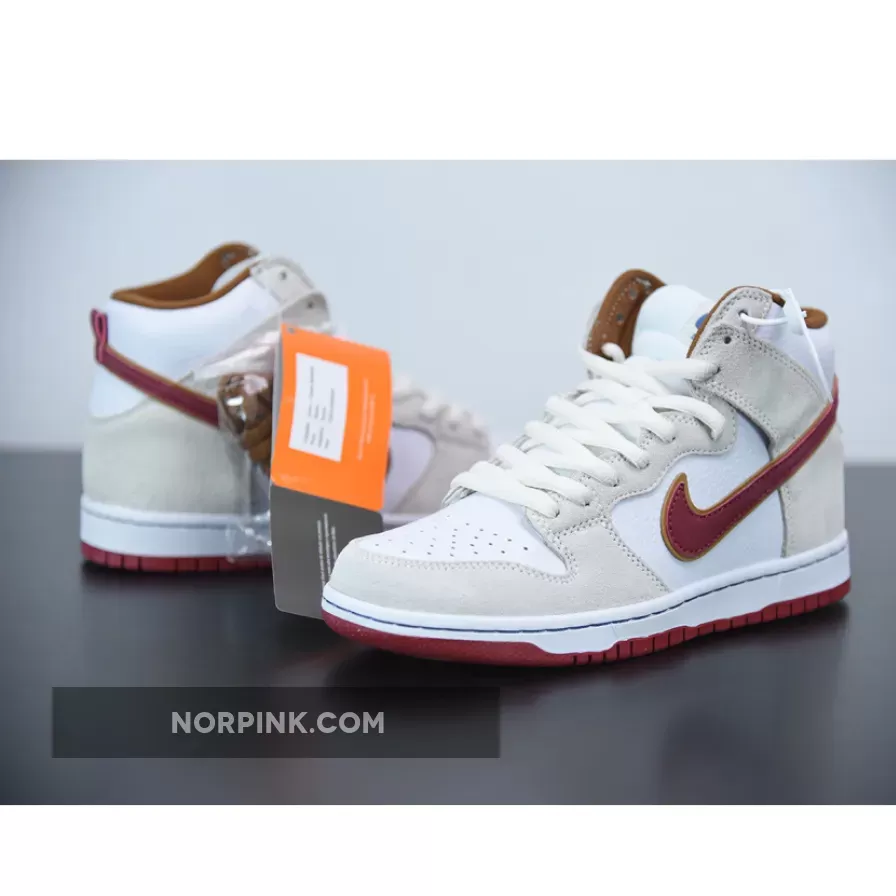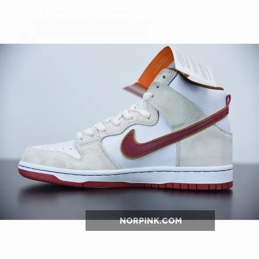This offering of the Nike SB Dunk High comes dressed in a Sail, Wheat, and Team Crimson color scheme. It features a tumbled leather upper paired with suede overlays, mesh tongues and Crimson Red accents on the liner, Swooshes, heel tab and rubber outsole.