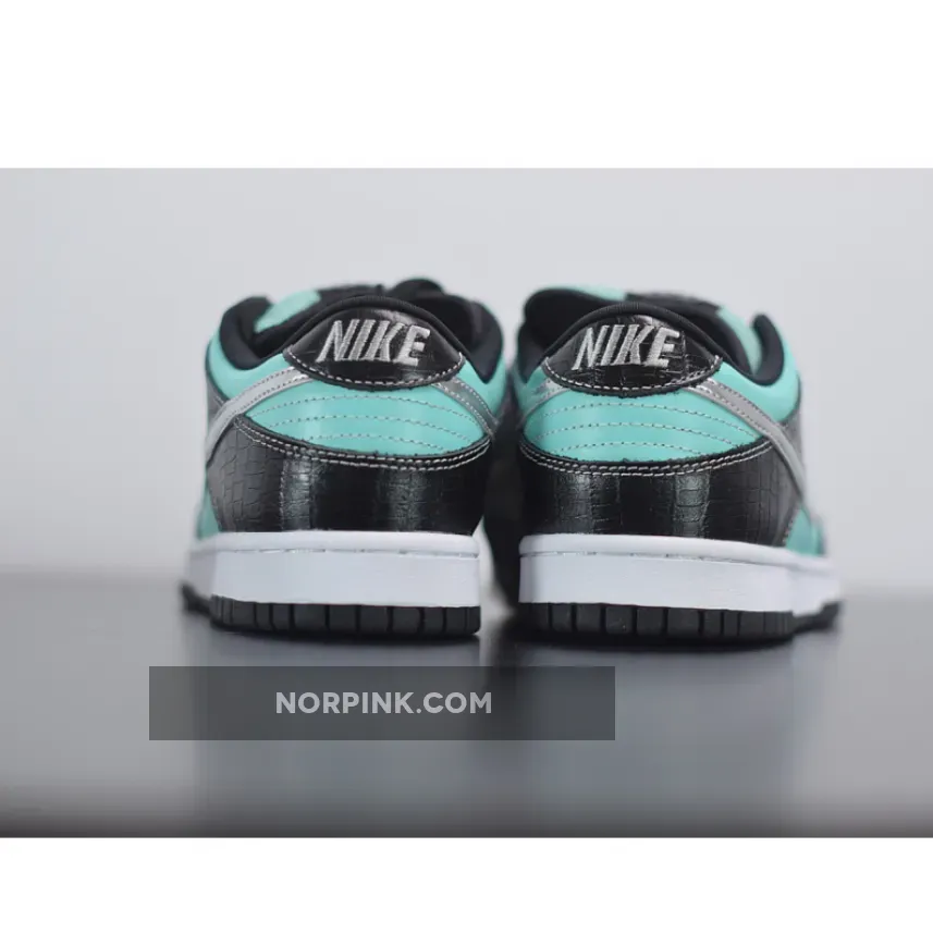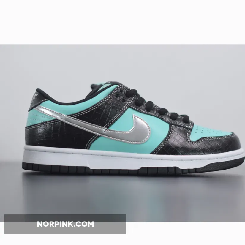 Dressed in crocodile embossed leather with vibrant Blue-like panels, Tershay described his SB Dunk as the most hyped and luxurious shoe at the time. Contrasting with the black crocodile and blue panels is a metallic silver Swoosh. The tongue-tag also features the Diamond Supply Co. diamond logo. A White midsole atop a Black rubber outsole completes the design.