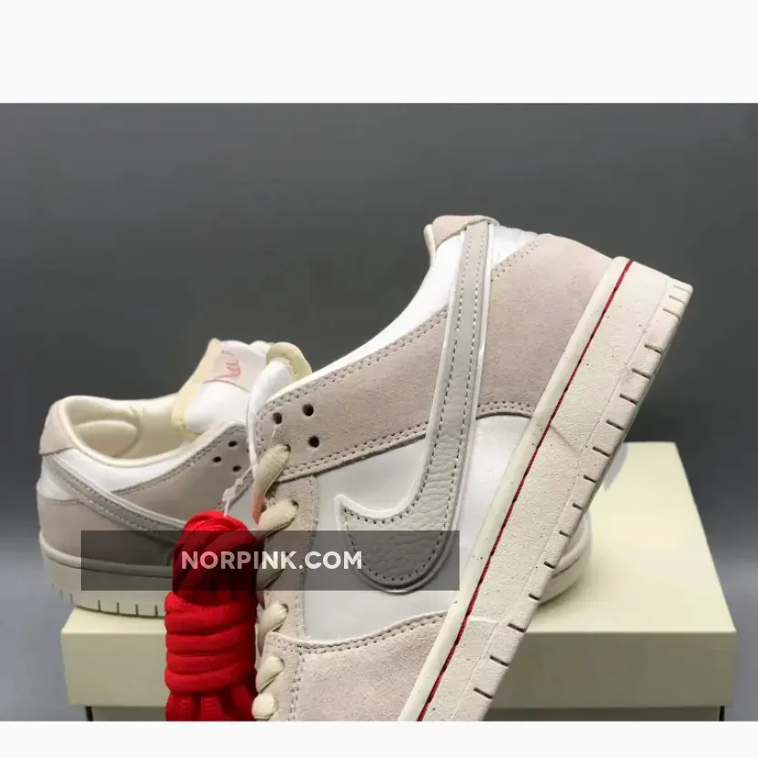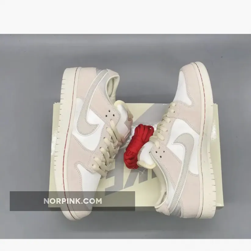 For the uninitiated, the red string of fate is the belief that everyone’s pinky finger is tied to an invisible thread, one that will inevitably lead you to your destined person. Crafted with a satin base, plush suede, and textured tumbled leather overlays, these sneakers capture the essence of romance effortlessly. What sets them apart is the clever incorporation of a red string seamlessly woven into the Nike SB logo on the tongue, a powerful symbol of the enduring connection represented by the red thread of fate. While much of the shoe is understated in form — consisting almost entirely of neutral colors — the pair does visualize the legend across its insoles, depicting two hands connected by said imperceivable cord. What’s more, the latter also wraps around the Swoosh of the adjacent tongue label. To round off the lovable design, a white rubber sole adorned with red stitching along the midsole completes the picture.