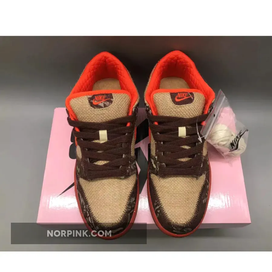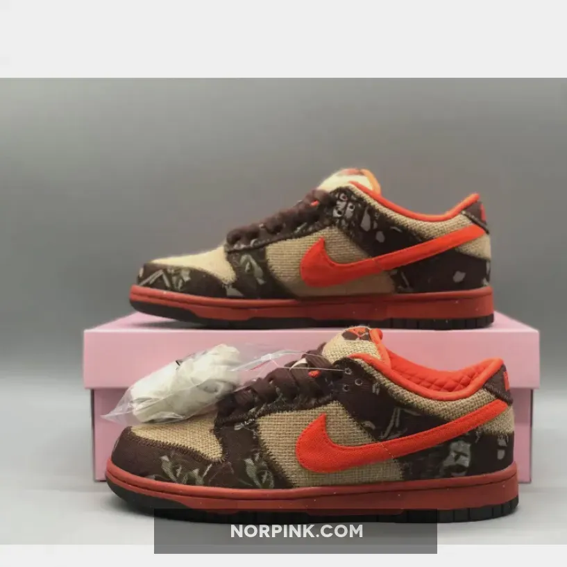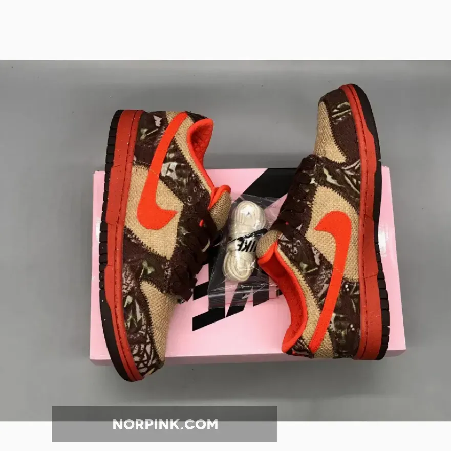 Hailing from the Nike SB Dunk’s beloved “Pink Box” era, the “Hunter” edition showcases a unique approach to Forbes’s skate shoe vision. It boasts a sturdy burlap base adorned with brown-and-white camouflage overlays. Adding a pop of color, an Orange Blaze canvas Swoosh graces both sides of the shoe, complemented by an orange quilted nylon interior lining. The design is punctuated with tonal zig-zag stitching on the overlays, amplifying its rugged charm.