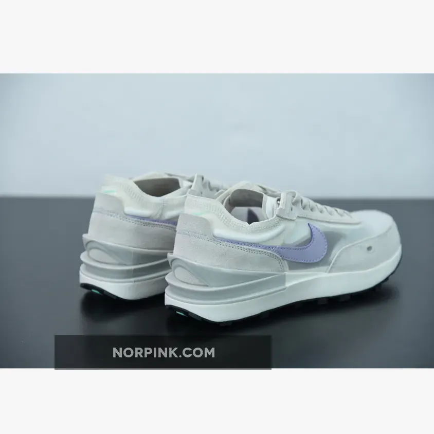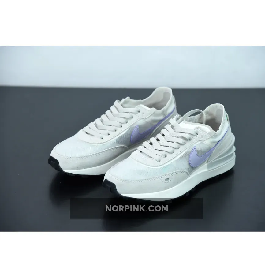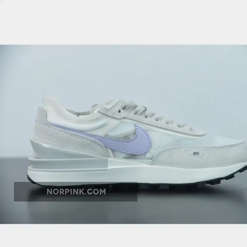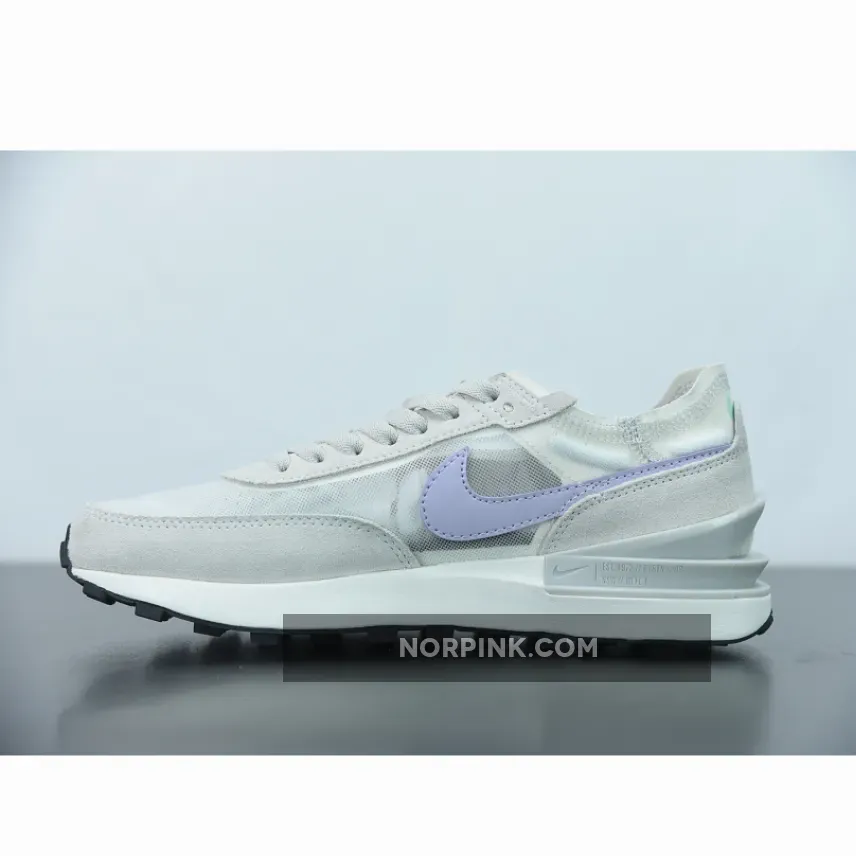 Dressed in a Summit White, Infinite Lilac, and Light Bone color scheme. This offering of the Nike Waffle One features a White mesh upper with Grey suede overlays, Light Purple leather Swoosh logos on the sides, highlighted with hints of Green accents.