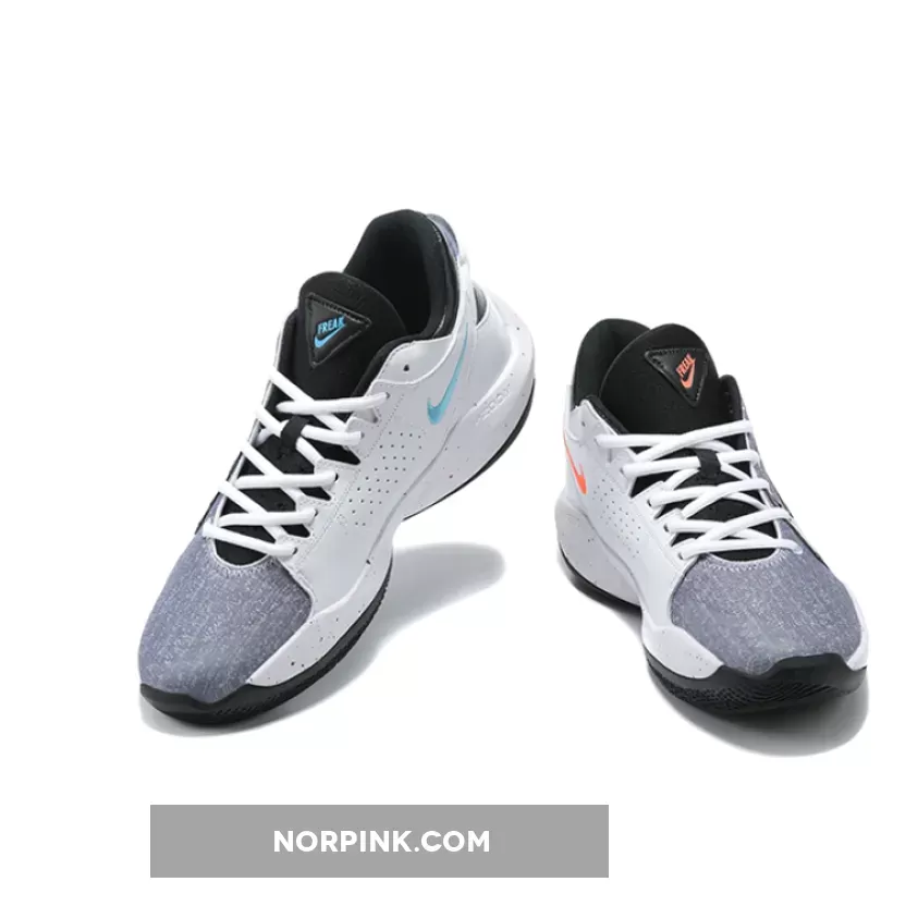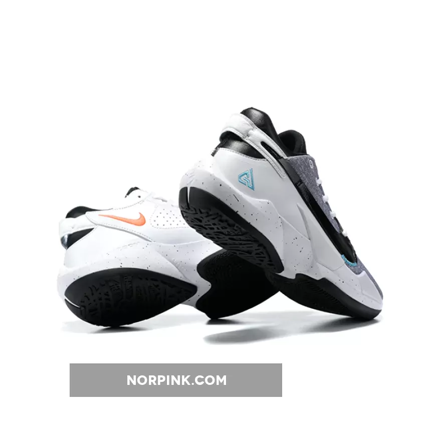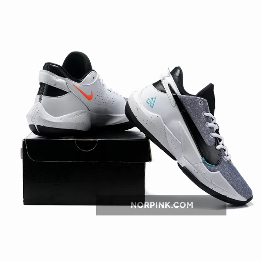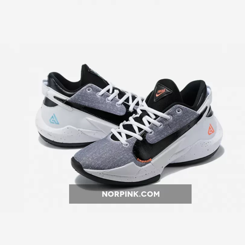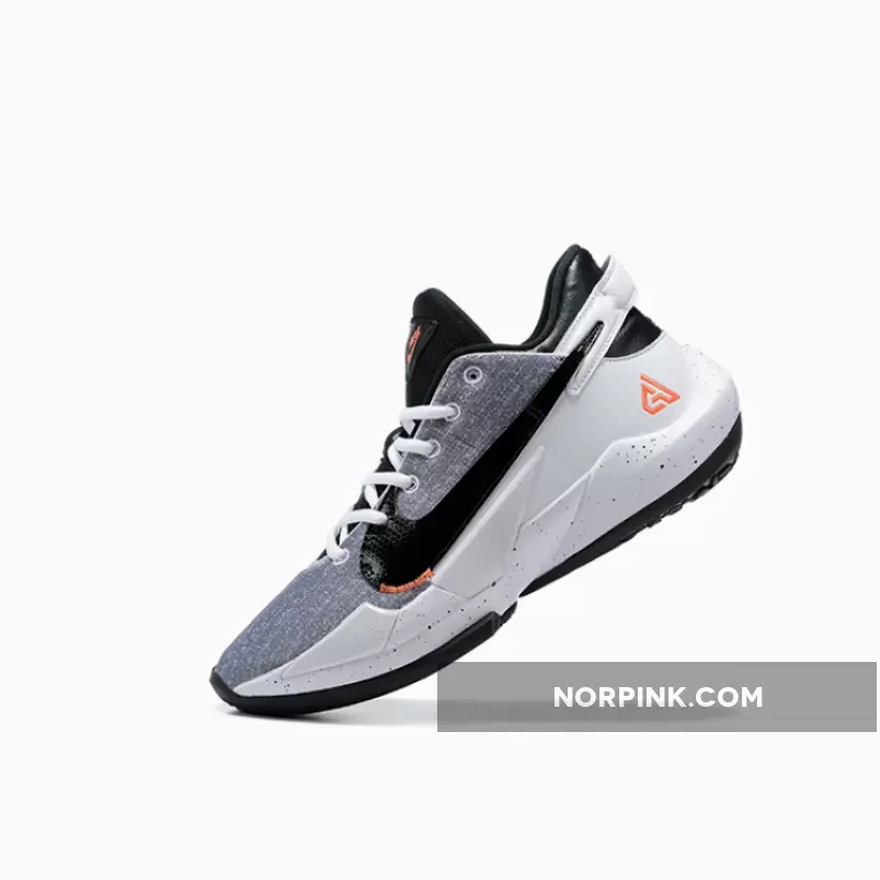 this Nike Zoom Freak 2 comes dressed in a White, Black, and Bright Mango color combination. First, the pair comes with a denim twill-like upper that lands on the lateral side. Next, White leather adorns the medial side, while Bright Mango and Aqua Blue adorn the branding. We also have speckled detailing on the midsole while a Black rubber outsole finishes the look.