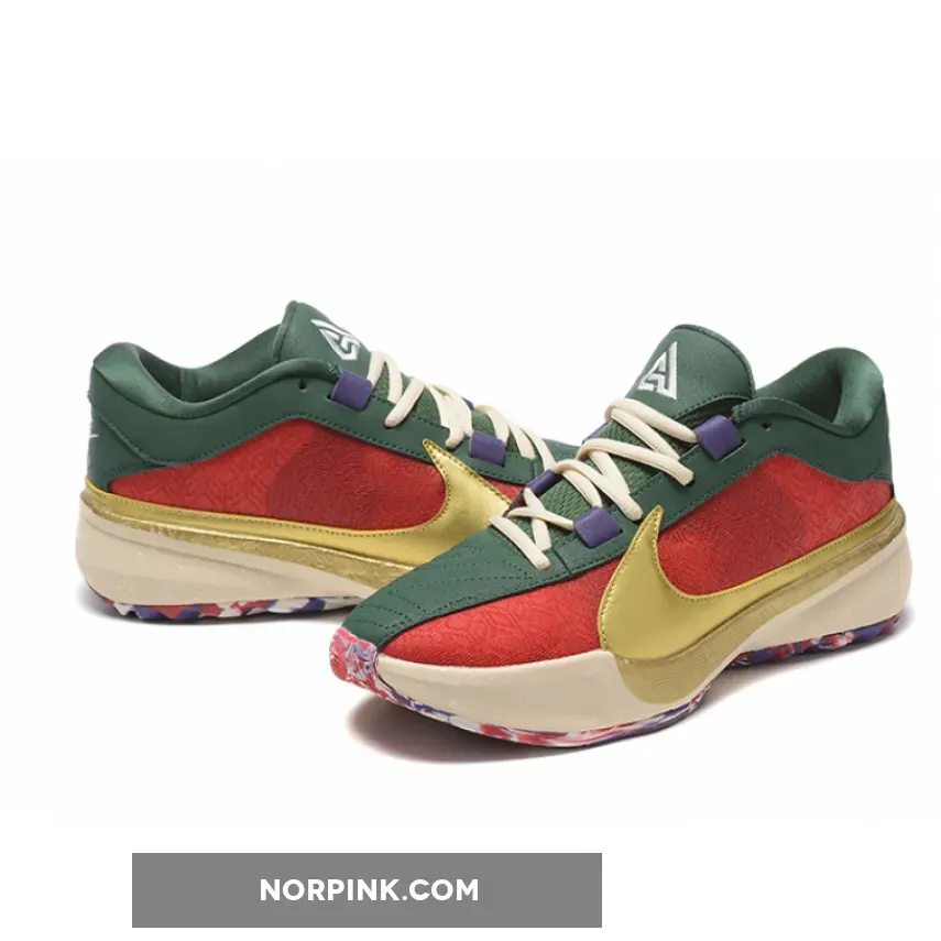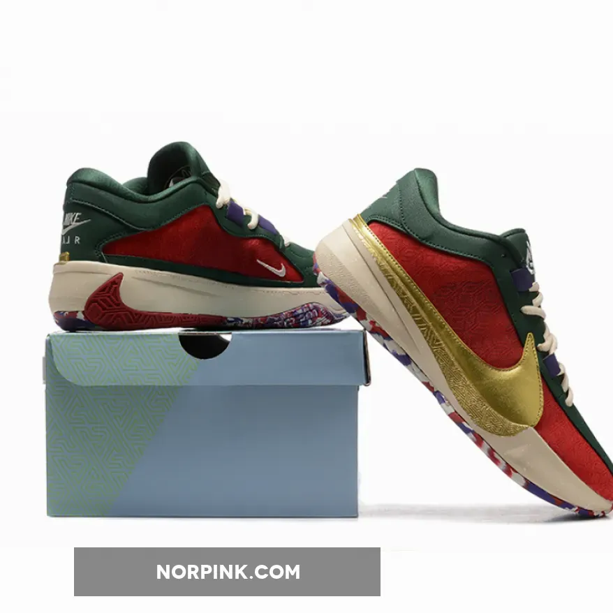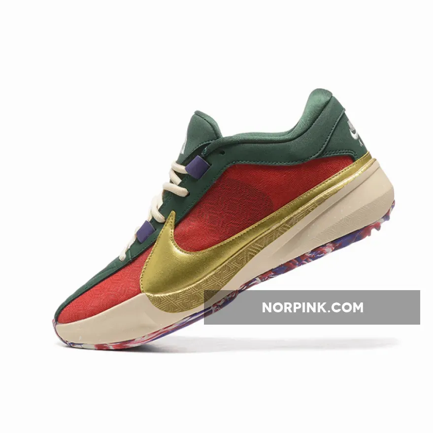 The Nike Zoom Freak 5 is quite a sizable departure from its predecessors in terms of design, forgoing the backwards Swoosh that’s dressed almost every model. Instead, a Swoosh double its size is in its place, sitting just between the upper and midsole. The silhouette appears to be much more streamlined in its construction, forgoing the visible signature Air Unit on the sole. The first shoe appears to arrive in a gym red and metallic gold colorway. The shoe’s heel, tongue, and center of the upper is covered in a deep green, while the shoe sits atop a tri-color outsole to round off the design.the sole unit, too, is similarly simple, forgoing the visible Air Unit signature to the Zoom Freak 4.