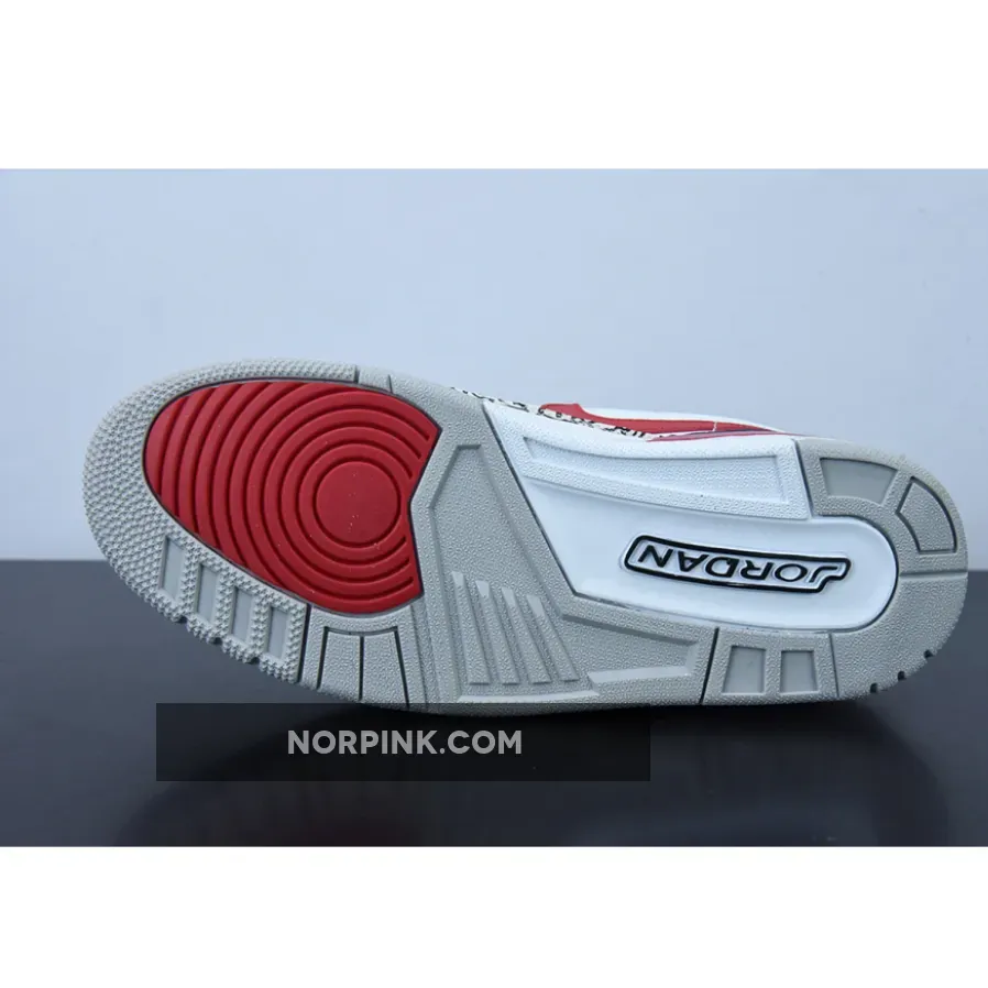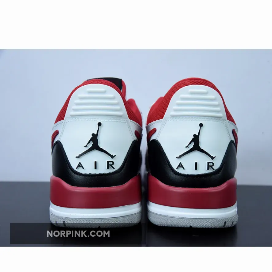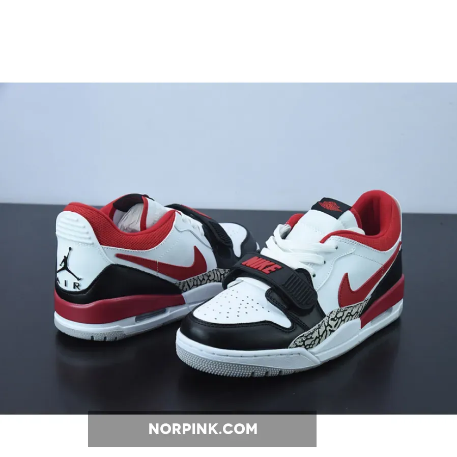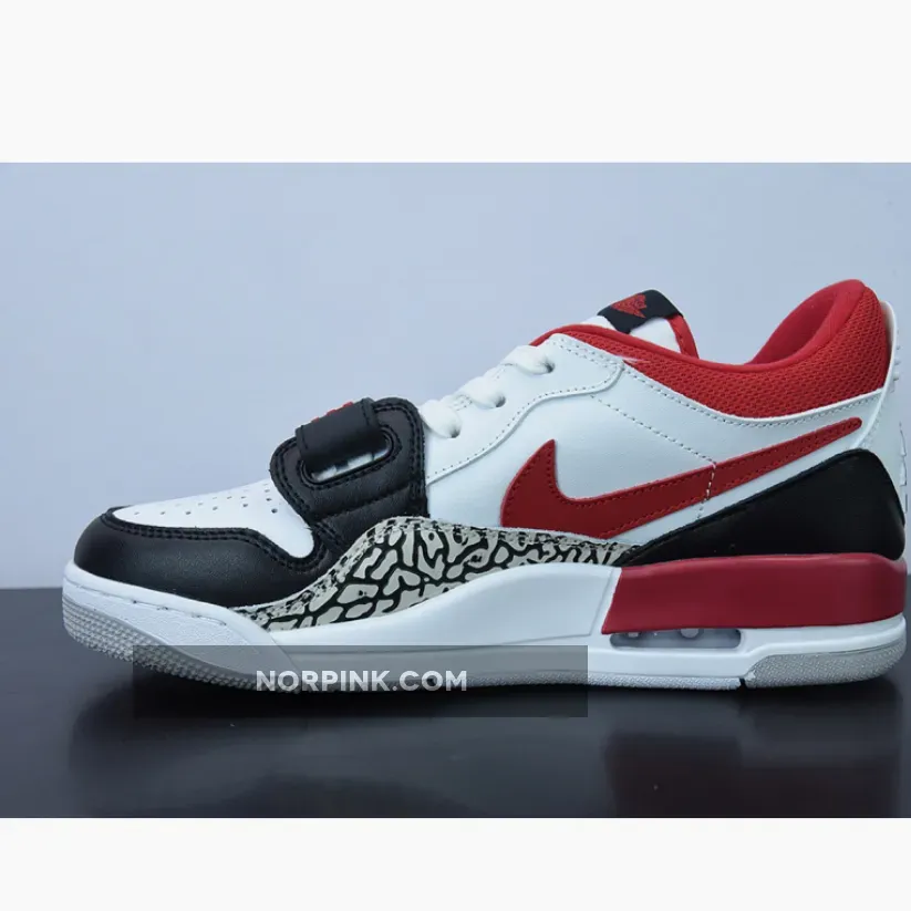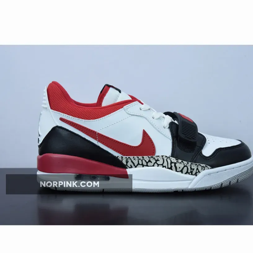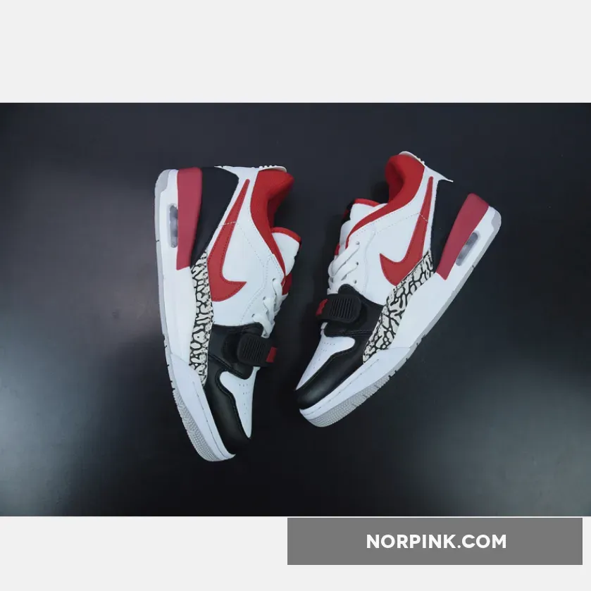 This low-top Jordan Legacy 312 comes constructed with leather and mesh while nylon forms the tongue. Highlighted with White on the base and Black on the overlays, including around the toe. Red hits the Swoosh logos, collars, liner and wraps the midsole. Other highlights include an elephant print and a Grey rubber outsole.