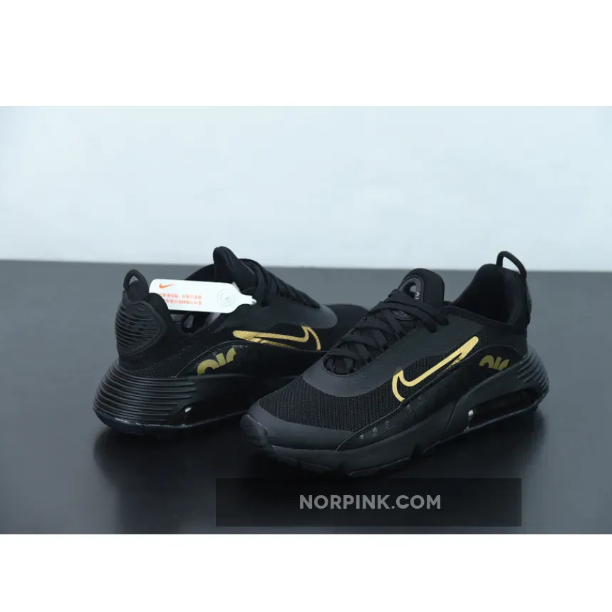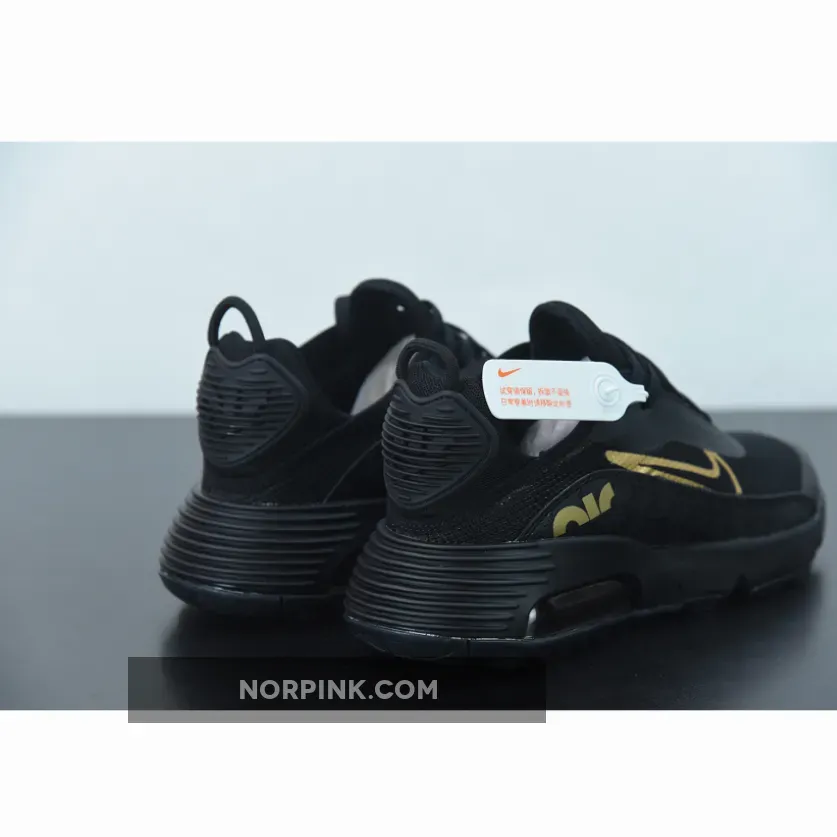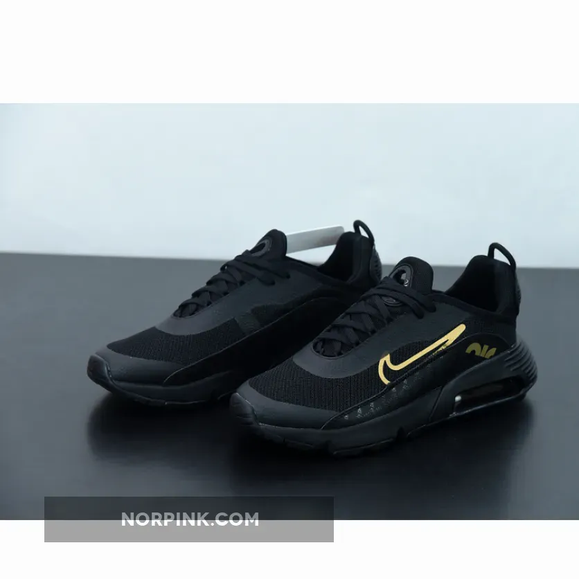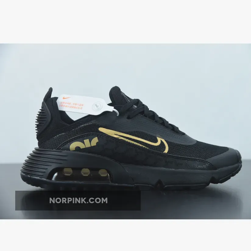 this Air Max 2090 comes dressed in a Black and Gold color combination. In addition, they feature a glossy Nike screen print along with mudguard, while most of the upper comes in Black. Following, Metallic accents the Swoosh logo and insole branding. Finally, a Black midsole and matching rubber outsole finishes the look.