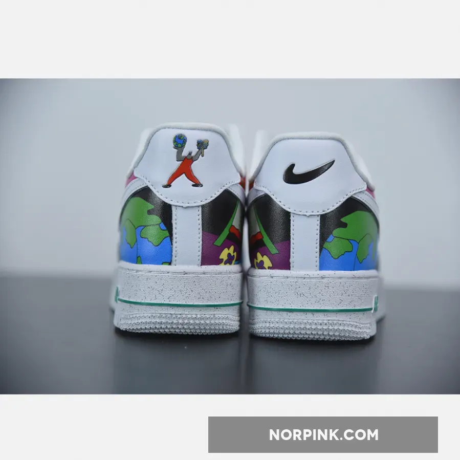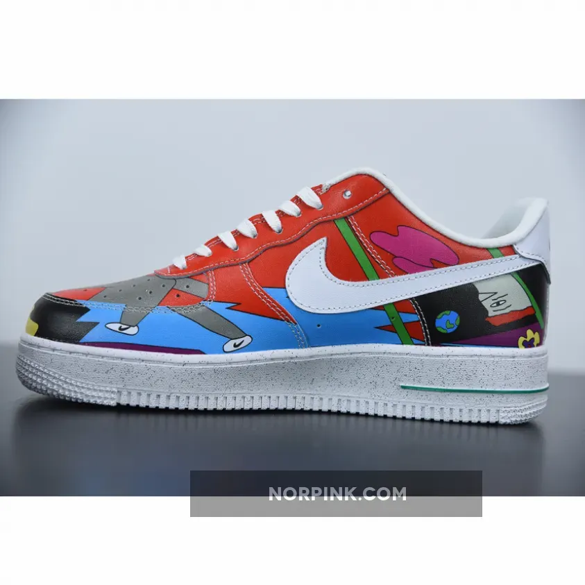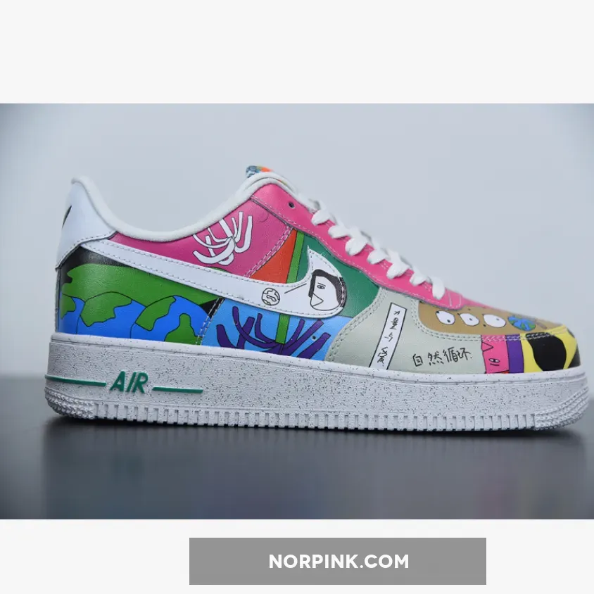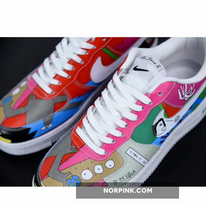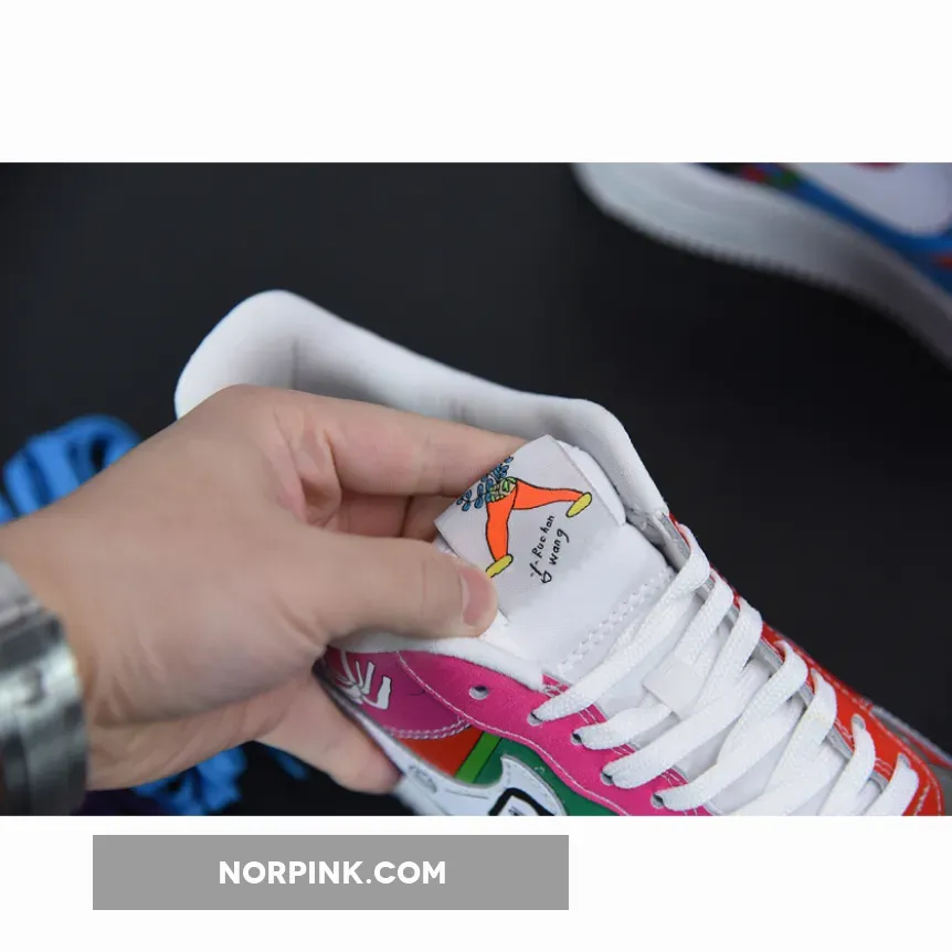 While Earth-centered, the pair does delve into themes adjacent — all, however, undoubtedly of the same intentionally crude art style. Anthropomorphic figures sprawl along the forefoot, swoosh, and heel in seldom, either speaking via Chinese characters, looking towards quickly pencil’d portraits of the planet, or holding it as if reminiscent of Atlas. Elsewhere, florals are reinterpreted through Wang’s lens against brighter blue backdrops, a shade that is well-utilized along the various Flyleather paneling as well as the artist’s signature-clad tongue tab. The palette, then, increases in volume as pastel pinks, saturated reds, and yellows work their way along the majority of the construction alongside more infrequent hits of light brown, grey, and white.
