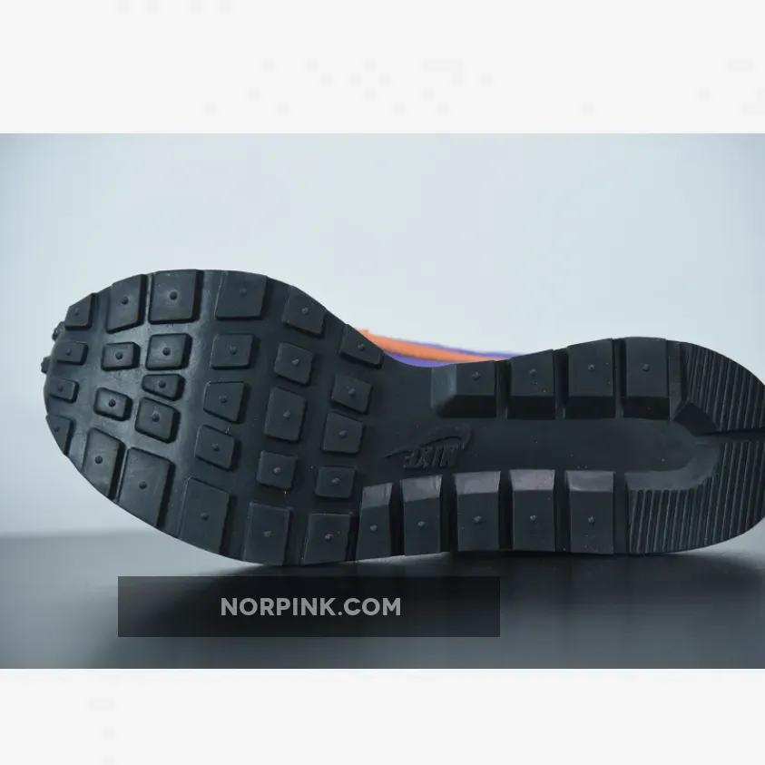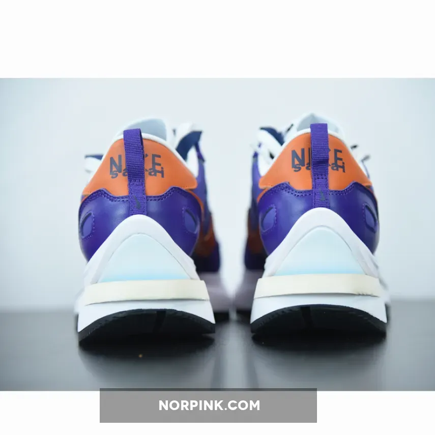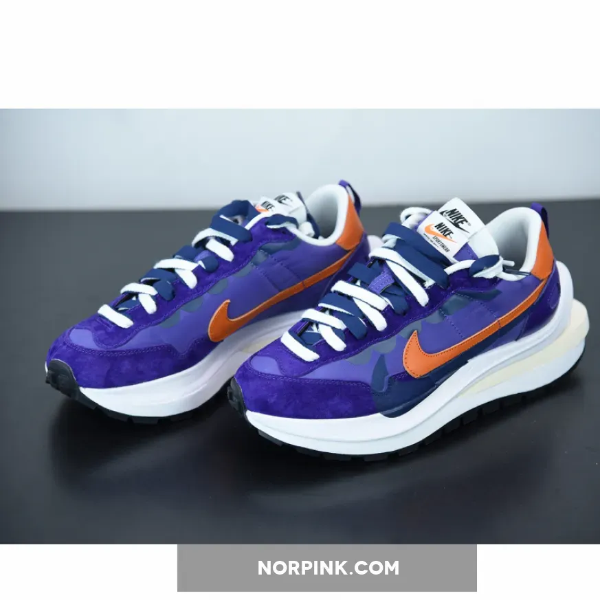 The Nike VaporWaffle sacai Dark Iris is composed of a Dark Iris suede, leather, and textile upper with hits of orange on the Swoosh and heel wrap. The tongues, Swooshes, and white midsoles are doubled similar to previous collaborative Waffle releases. Nike and sacai branding is located on the woven tongue labels and heel tabs. A black Waffle outsole adds the finishing touches to the design.